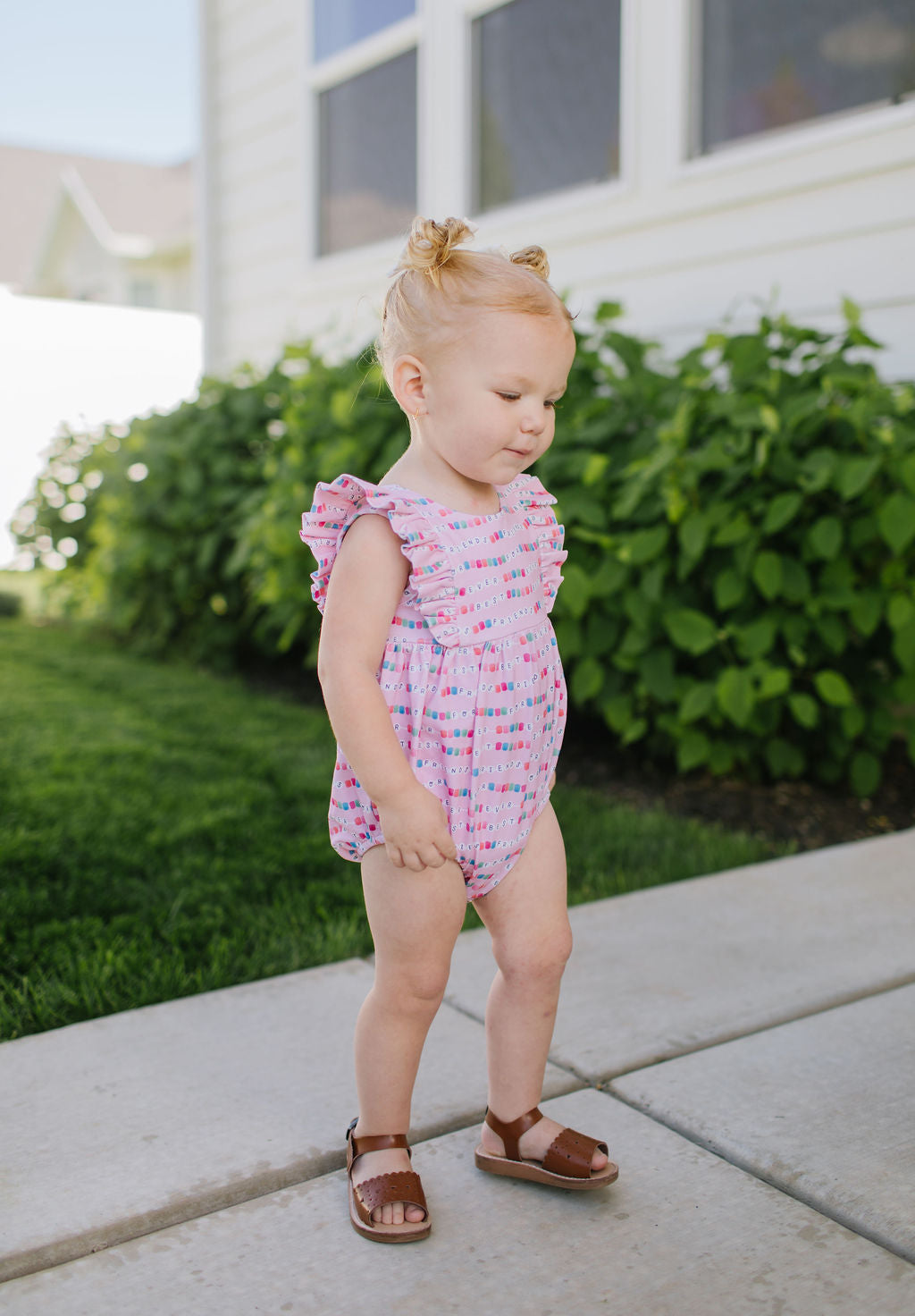 Dress your little one in effortless style with our Amelia Romper, thoughtfully designed for both comfort and cuteness. Featuring delicate ruffle detailing on the front and back, this sleeveless romper is perfect for warm days or layering under cozy cardigans.