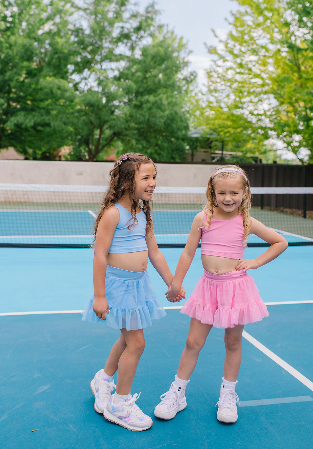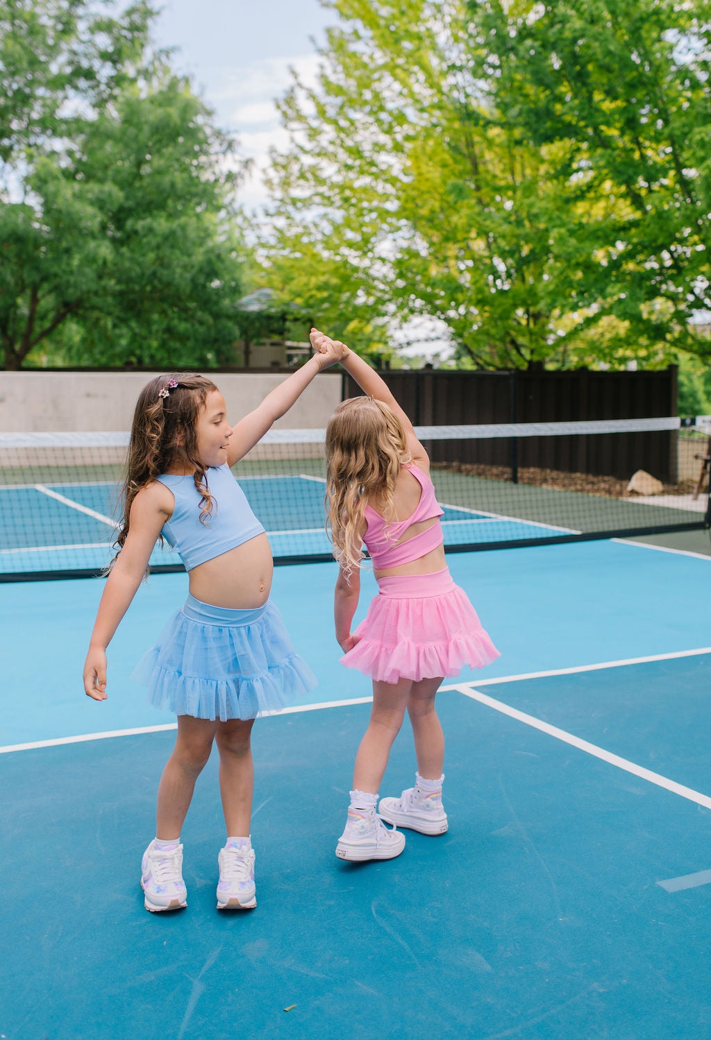 Whether she's hitting the court or just loves an active look, the Ashlyn Athletic Set delivers comfort, function, and style in one matching outfit. This two-piece set includes a twist-back tank top and a coordinating skort with built-in shorts complete with functional pockets for all her essentials.