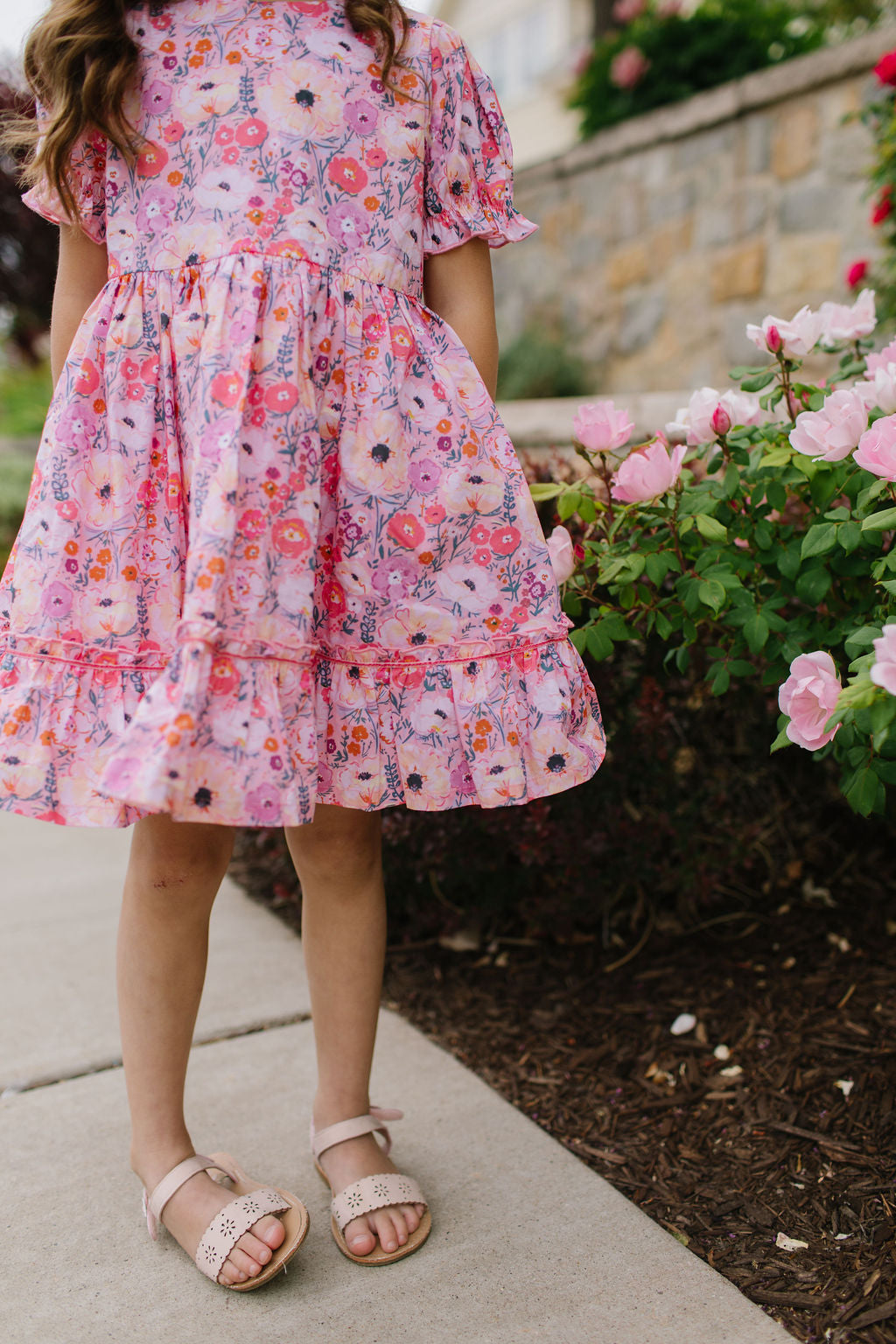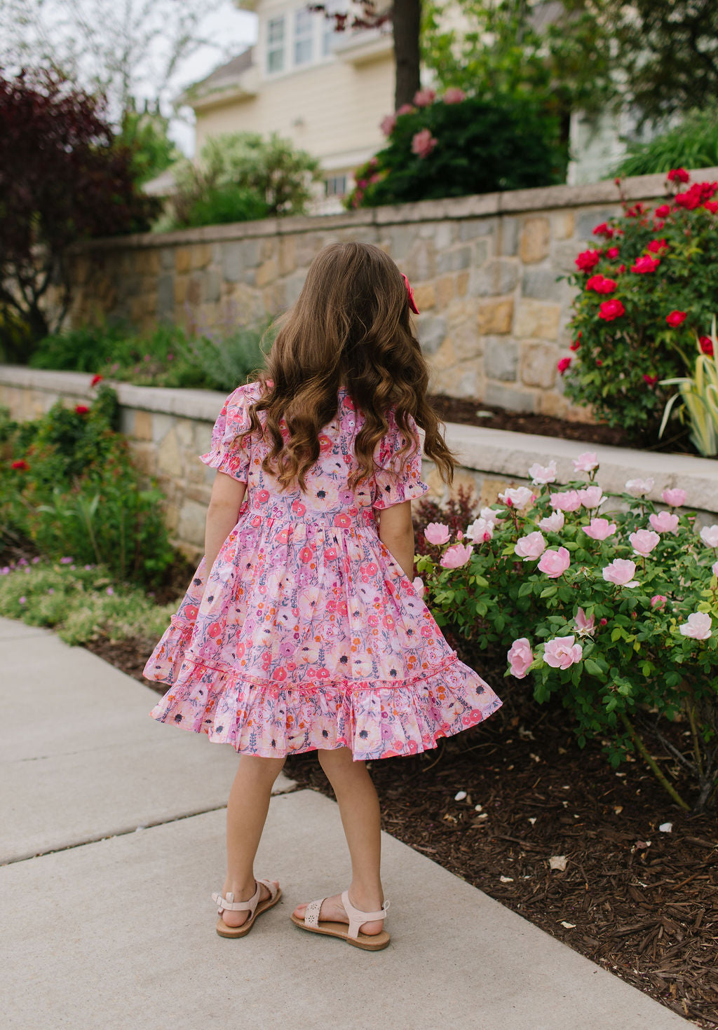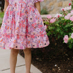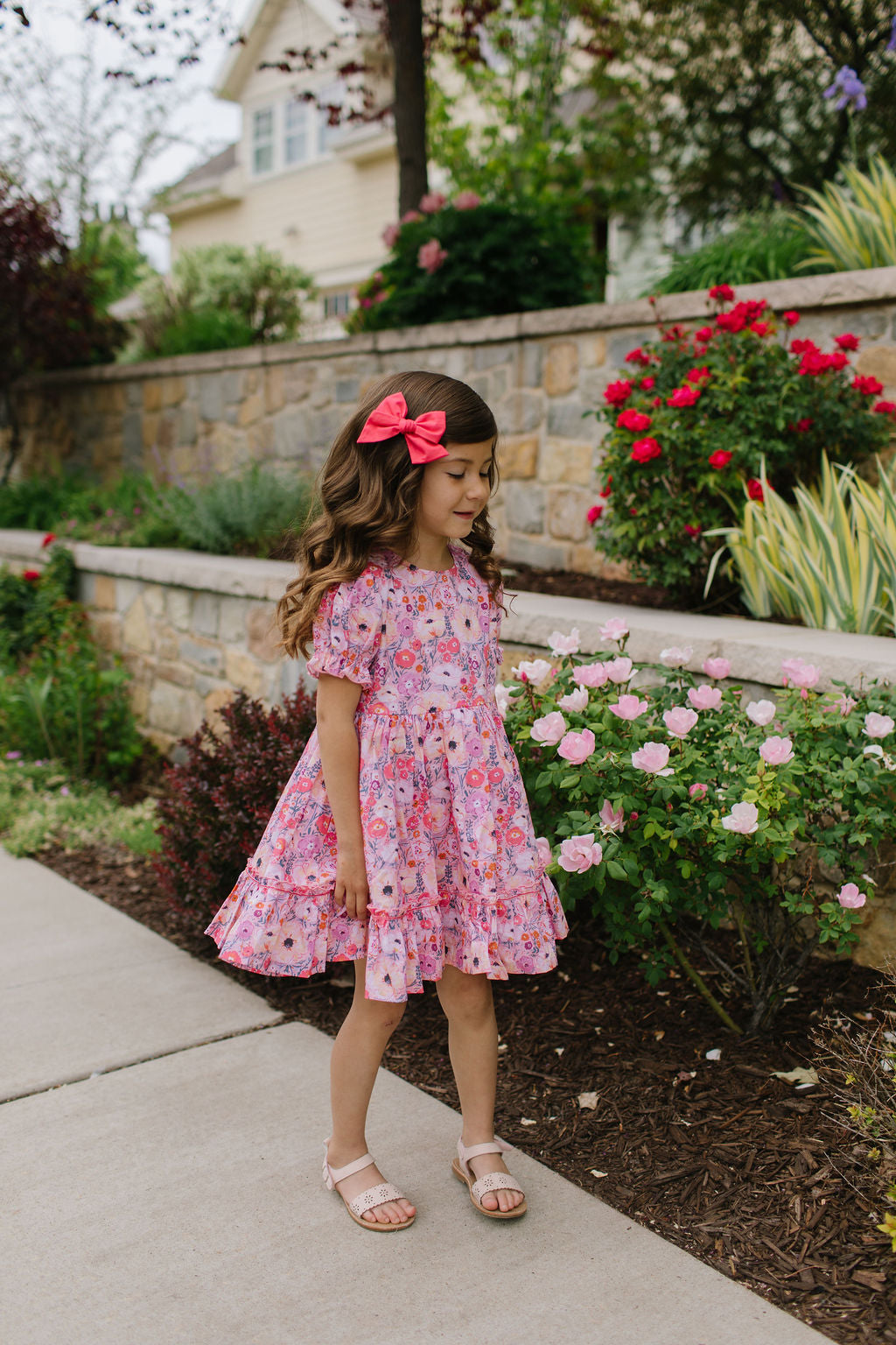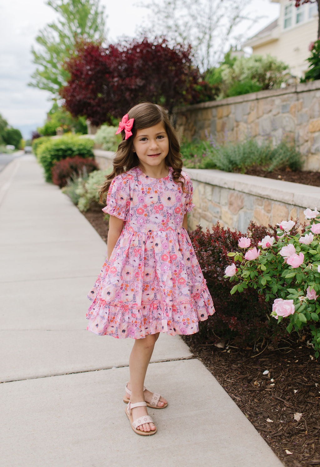 The Aura Dress is all about timeless charm with playful details. Featuring puffed short sleeves with delicate ruffled arm openings, a full skirt with trim and a sweet ruffle hem, this dress brings graceful movement and classic style to your little oneÕs wardrobe.
