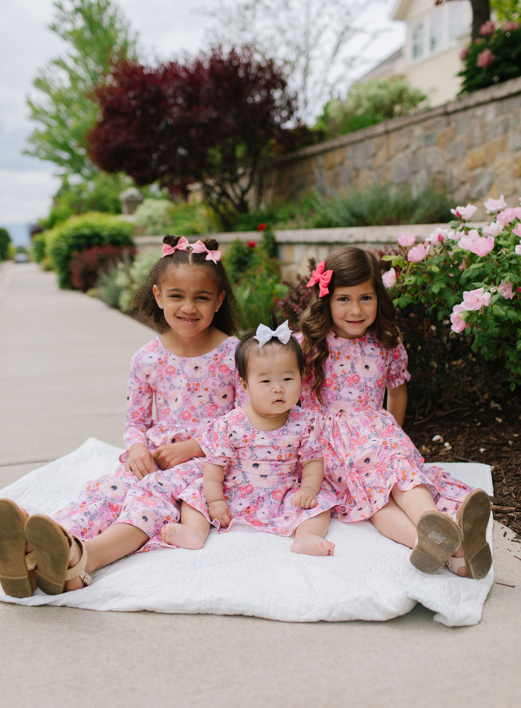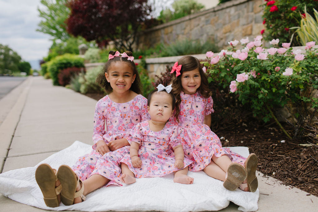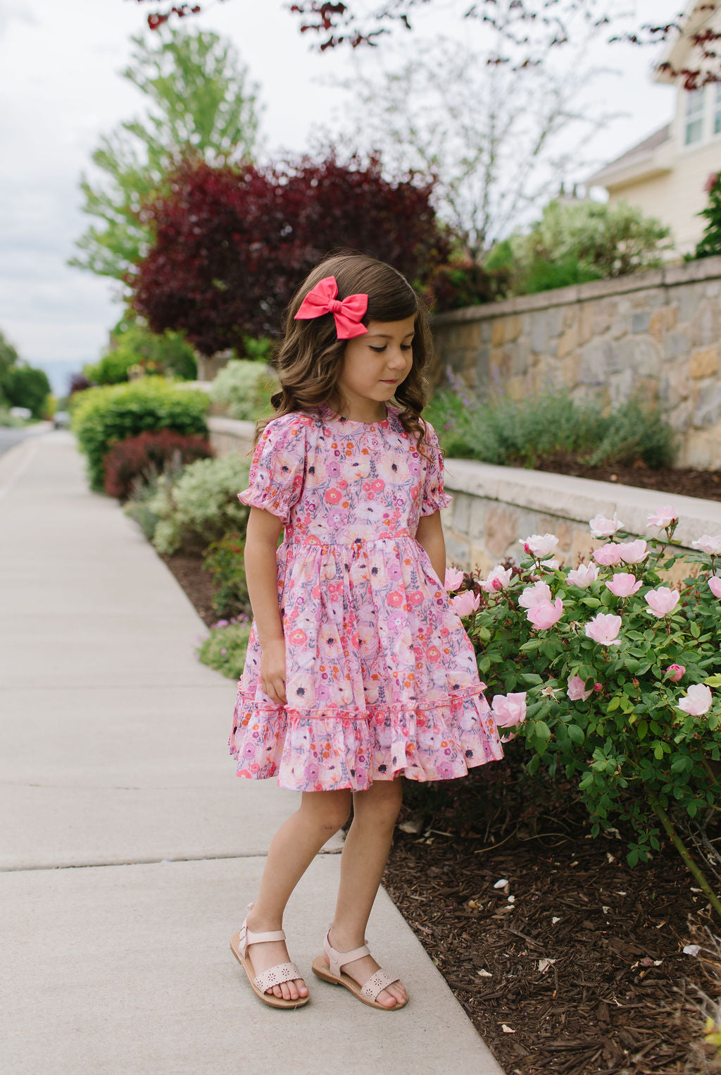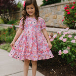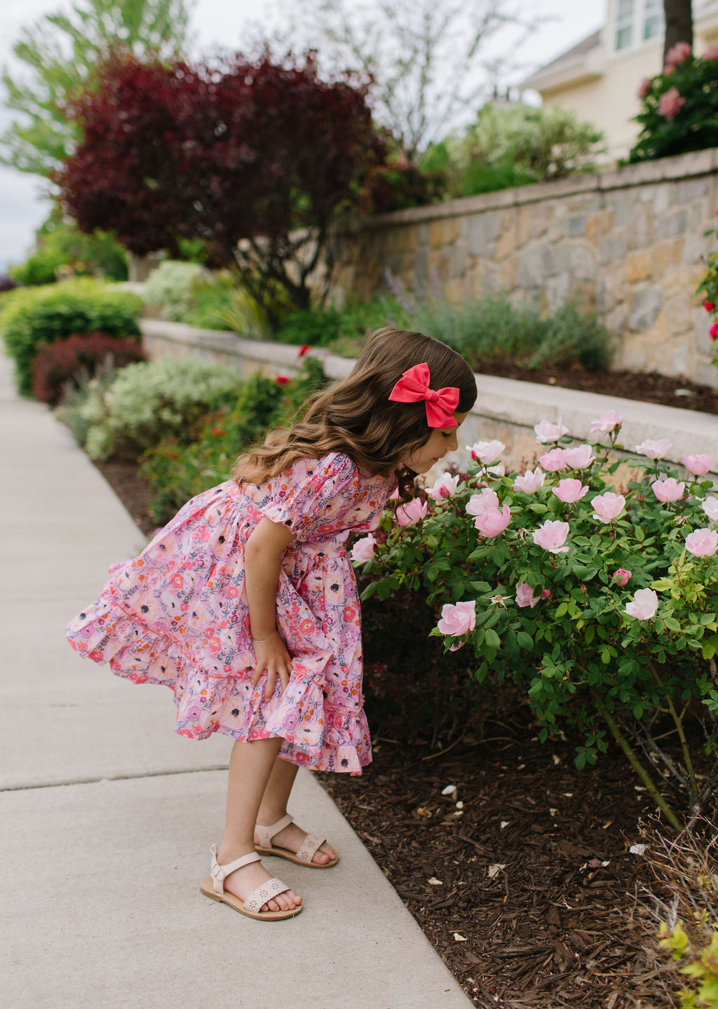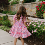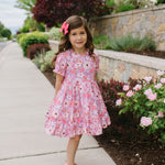 The Aura Dress is all about timeless charm with playful details. Featuring puffed short sleeves with delicate ruffled arm openings, a full skirt with trim and a sweet ruffle hem, this dress brings graceful movement and classic style to your little oneÕs wardrobe.