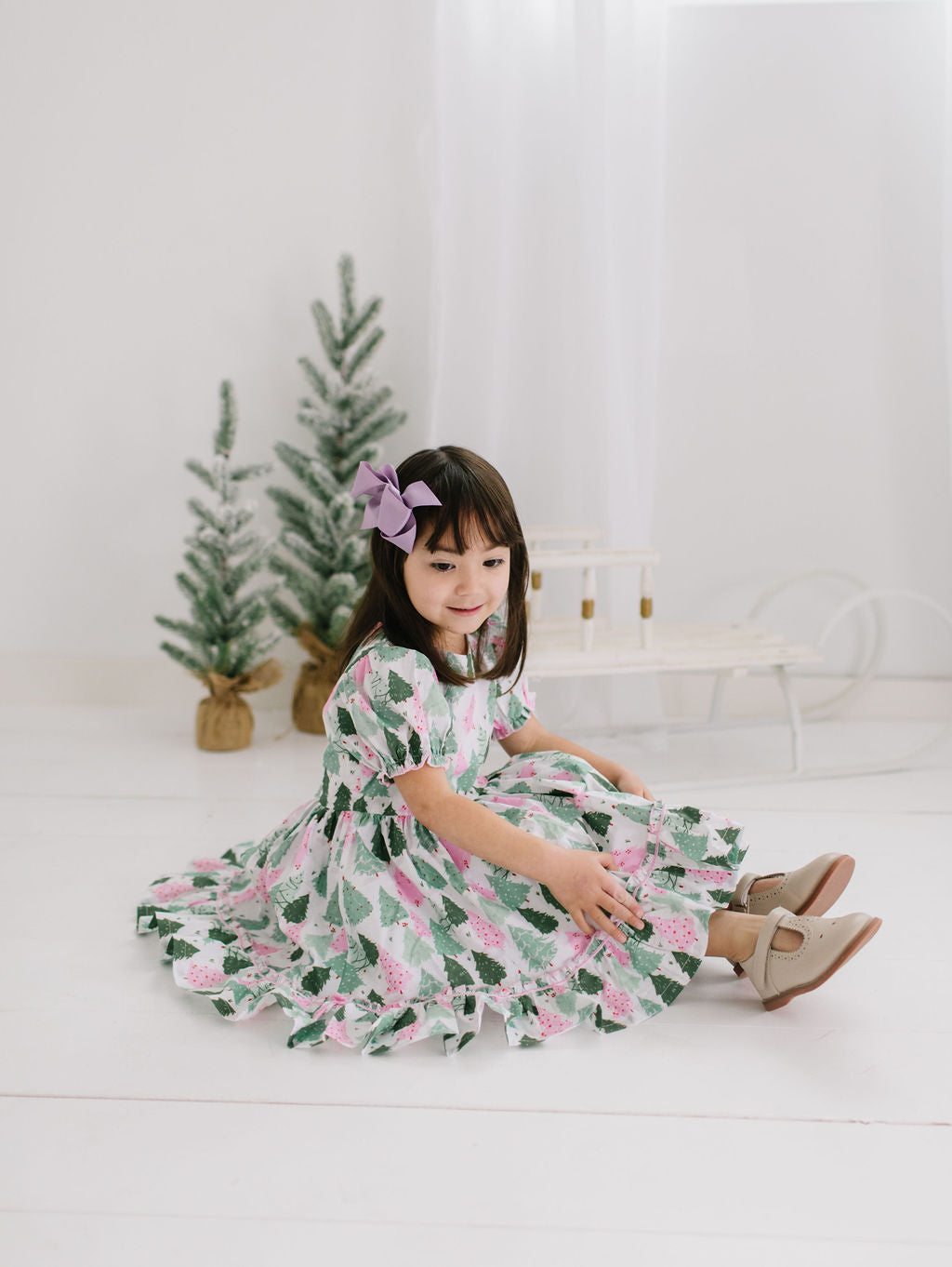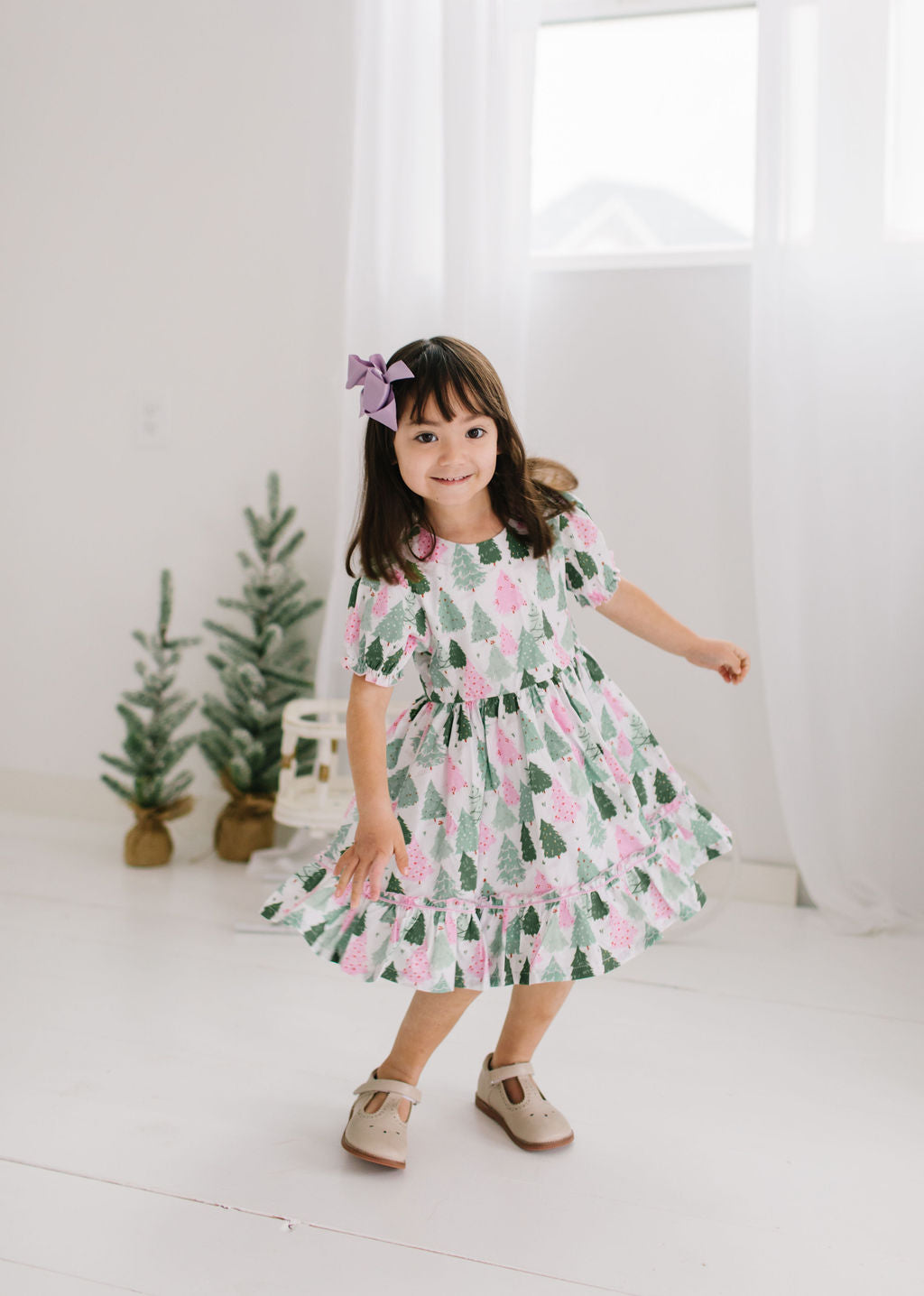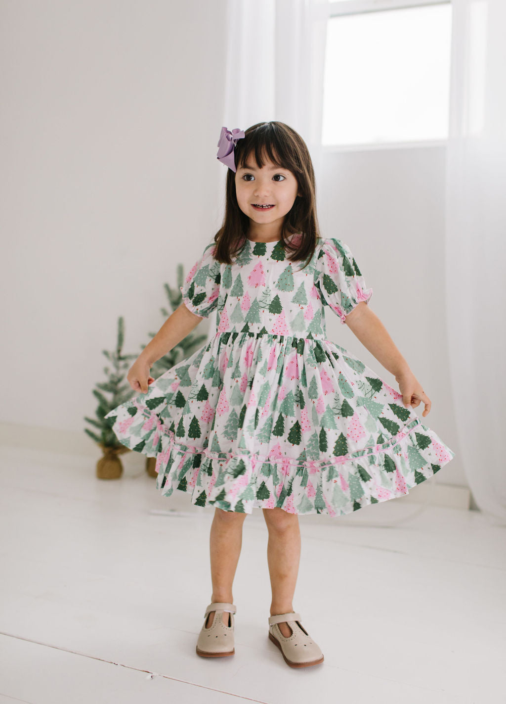 The Aura Dress is all about timeless charm with playful details. Featuring puffed short sleeves with delicate ruffled arm openings, a full skirt with trim and a sweet ruffle hem, this dress brings graceful movement and classic style to your little ones wardrobe.