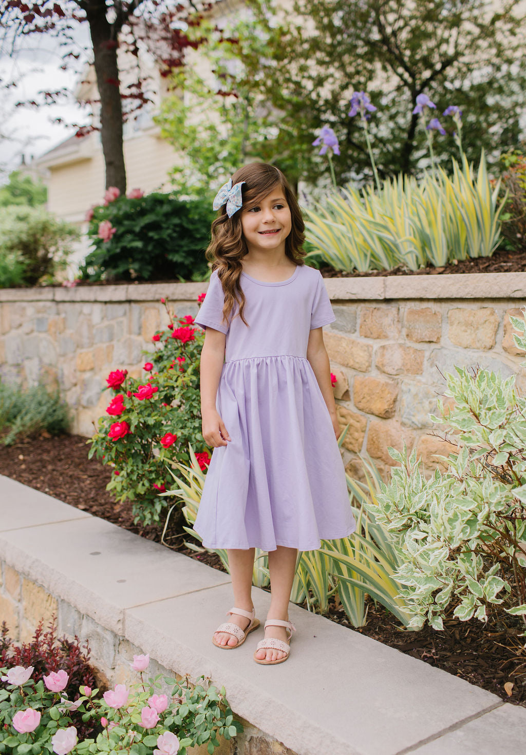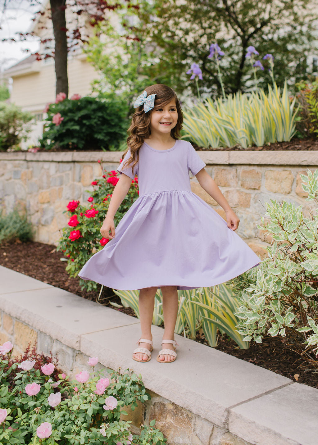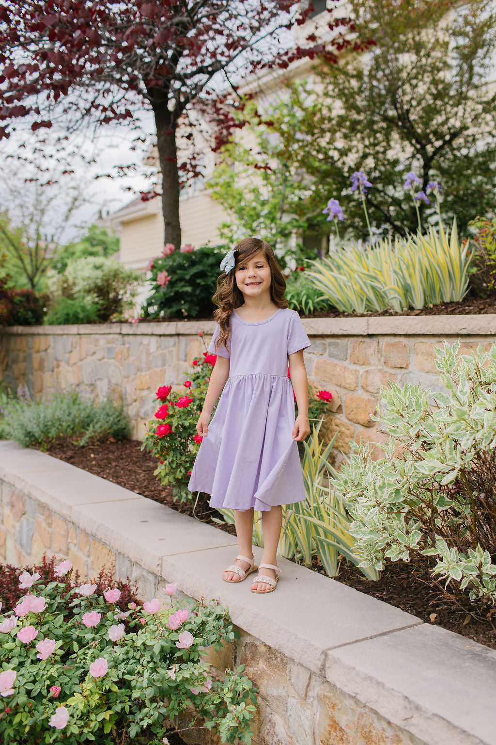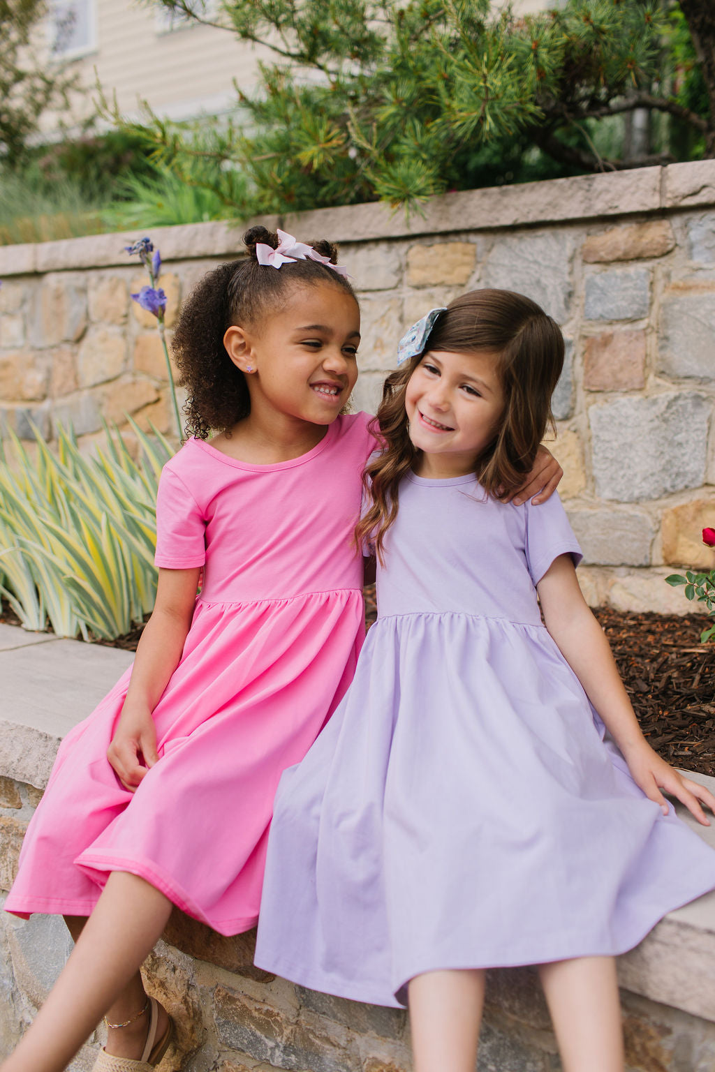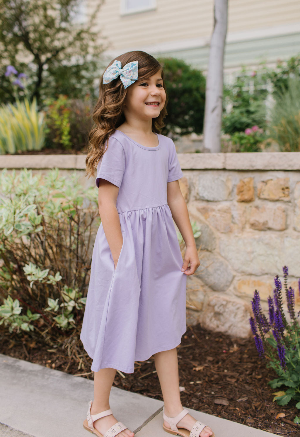 The Day Dress is designed for easy, everyday wear with extra soft and stretchy fabric that moves with her. Featuring handy side seam pockets and a gentle A-line silhouette, this dress combines comfort and style effortlessly.