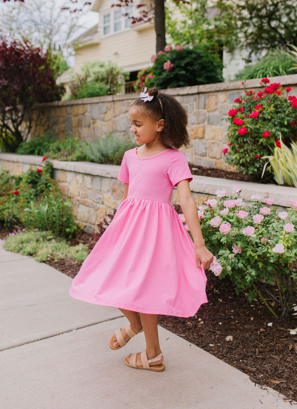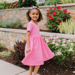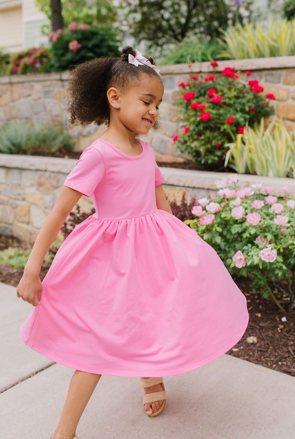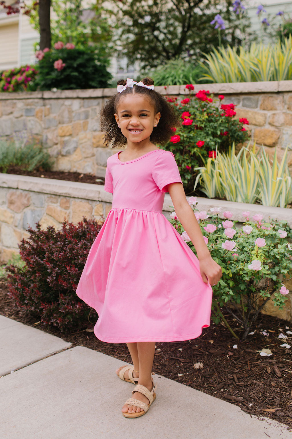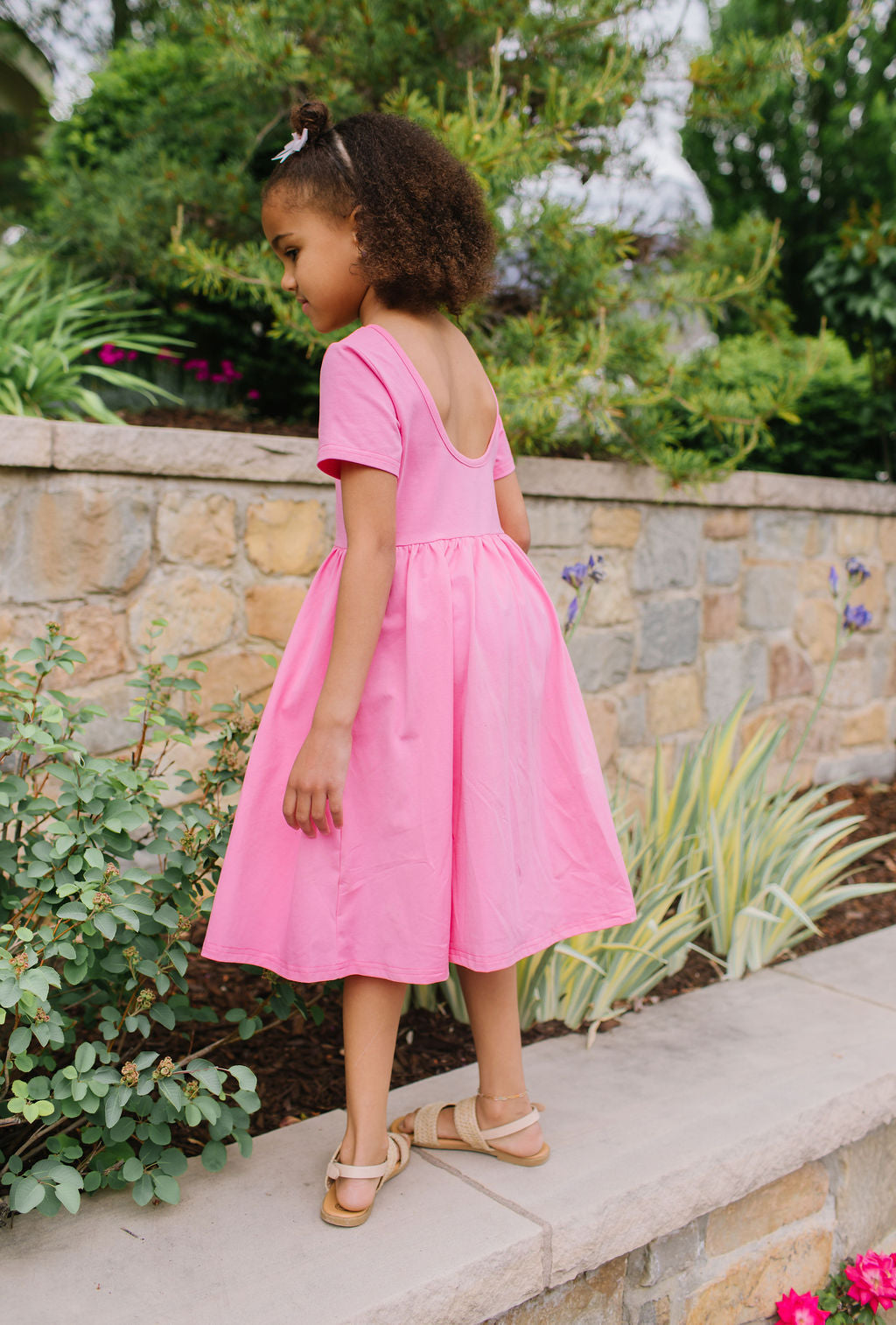 The Day Dress is designed for easy, everyday wear with extra soft and stretchy fabric that moves with her. Featuring handy side seam pockets and a gentle A-line silhouette, this dress combines comfort and style effortlessly.