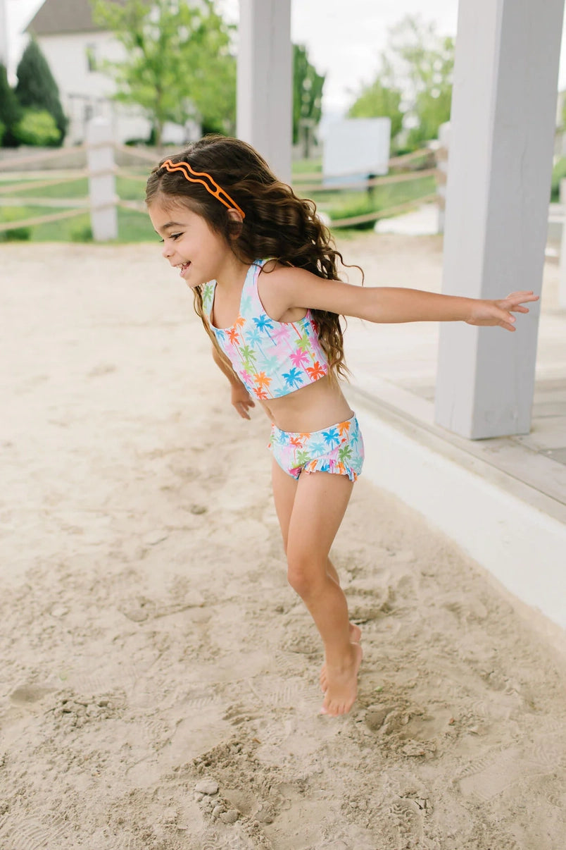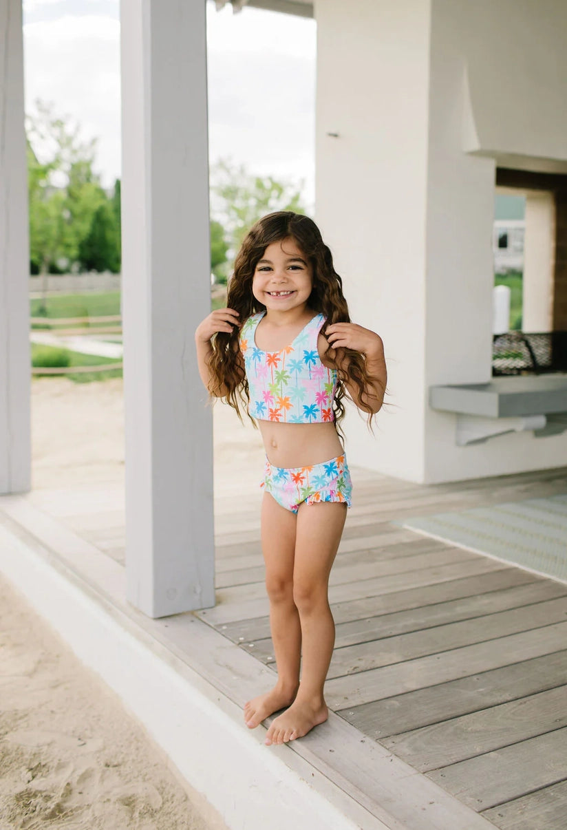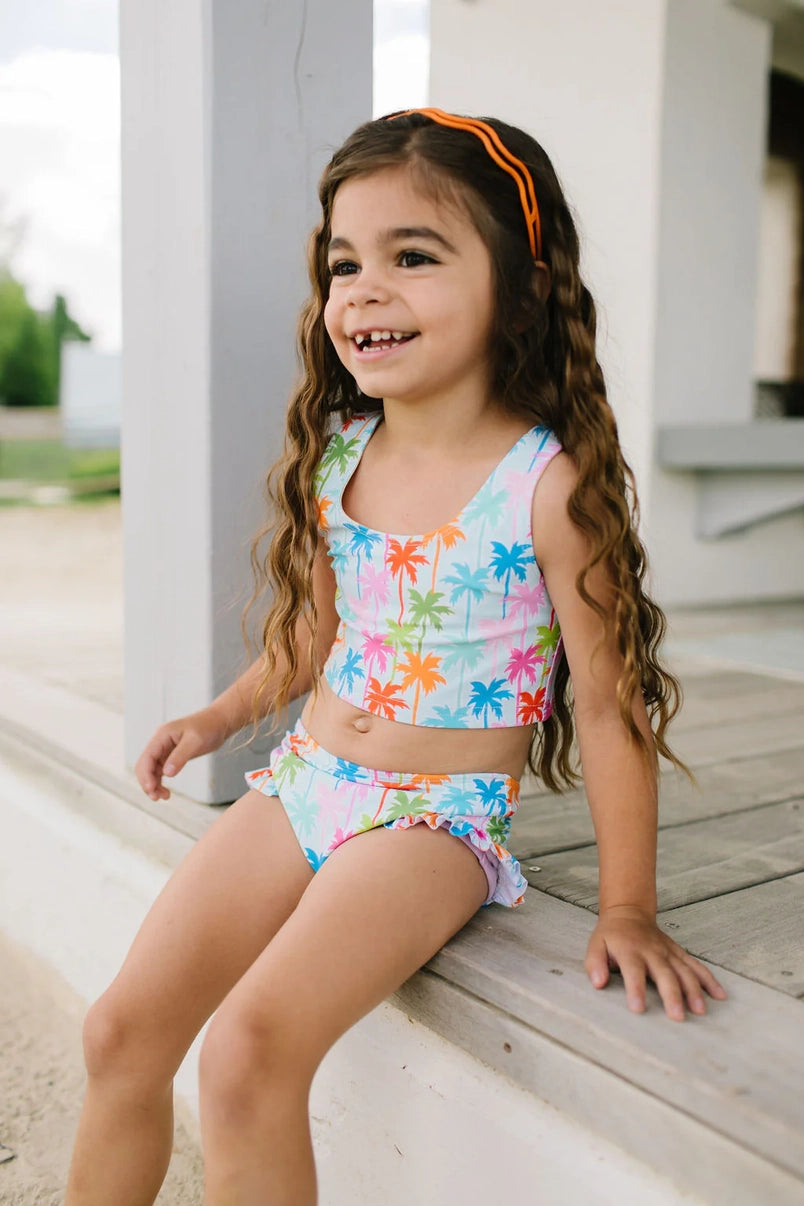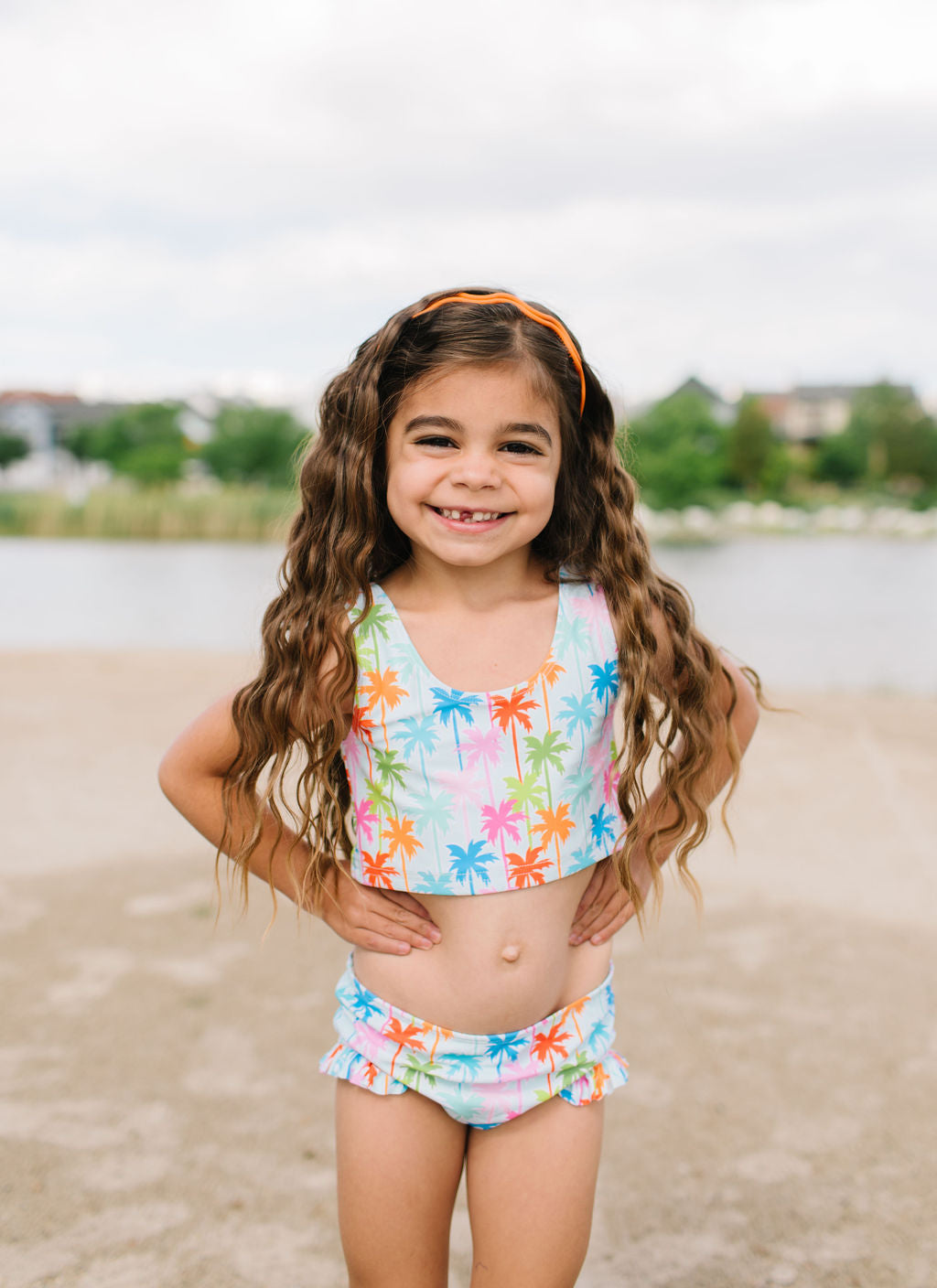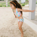 Make a splash this summer with the Ellie Swim Set, featuring a cropped tank-style top and matching bottoms, both adorned with sweet ruffle details. Crafted from UPF 50 protected fabric with a soft beige lining, this set keeps your little one protected while looking adorable in a summer print.