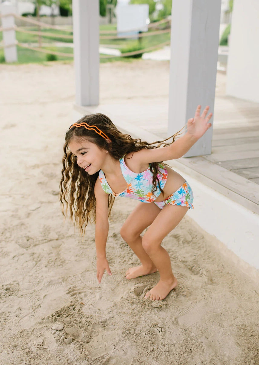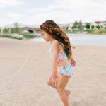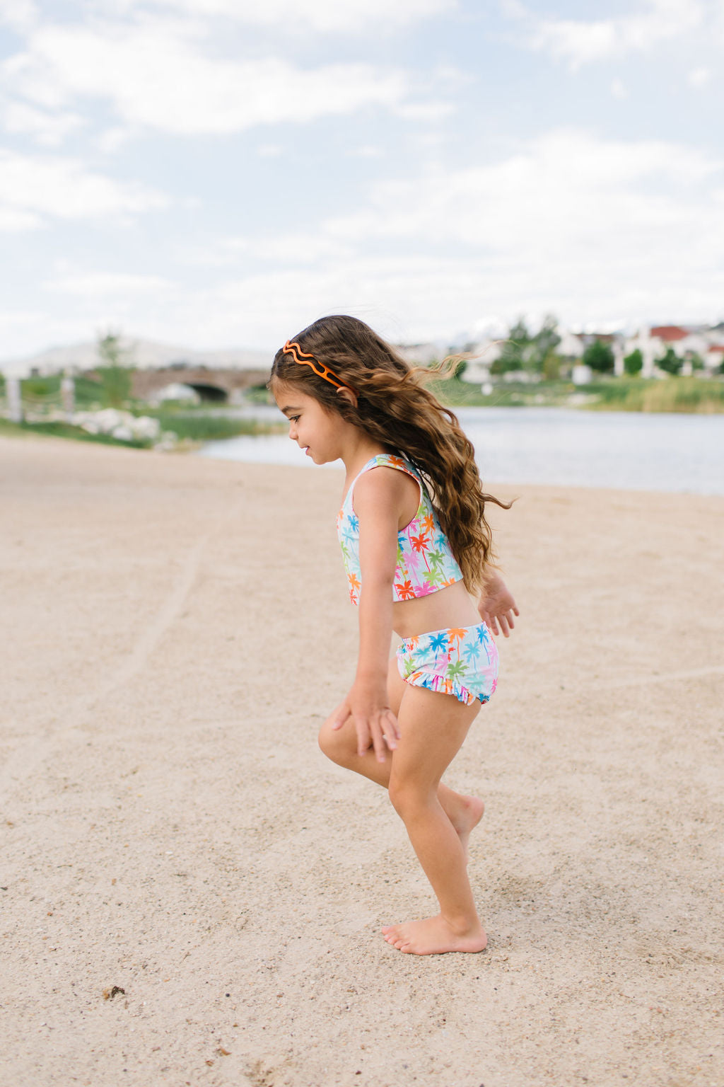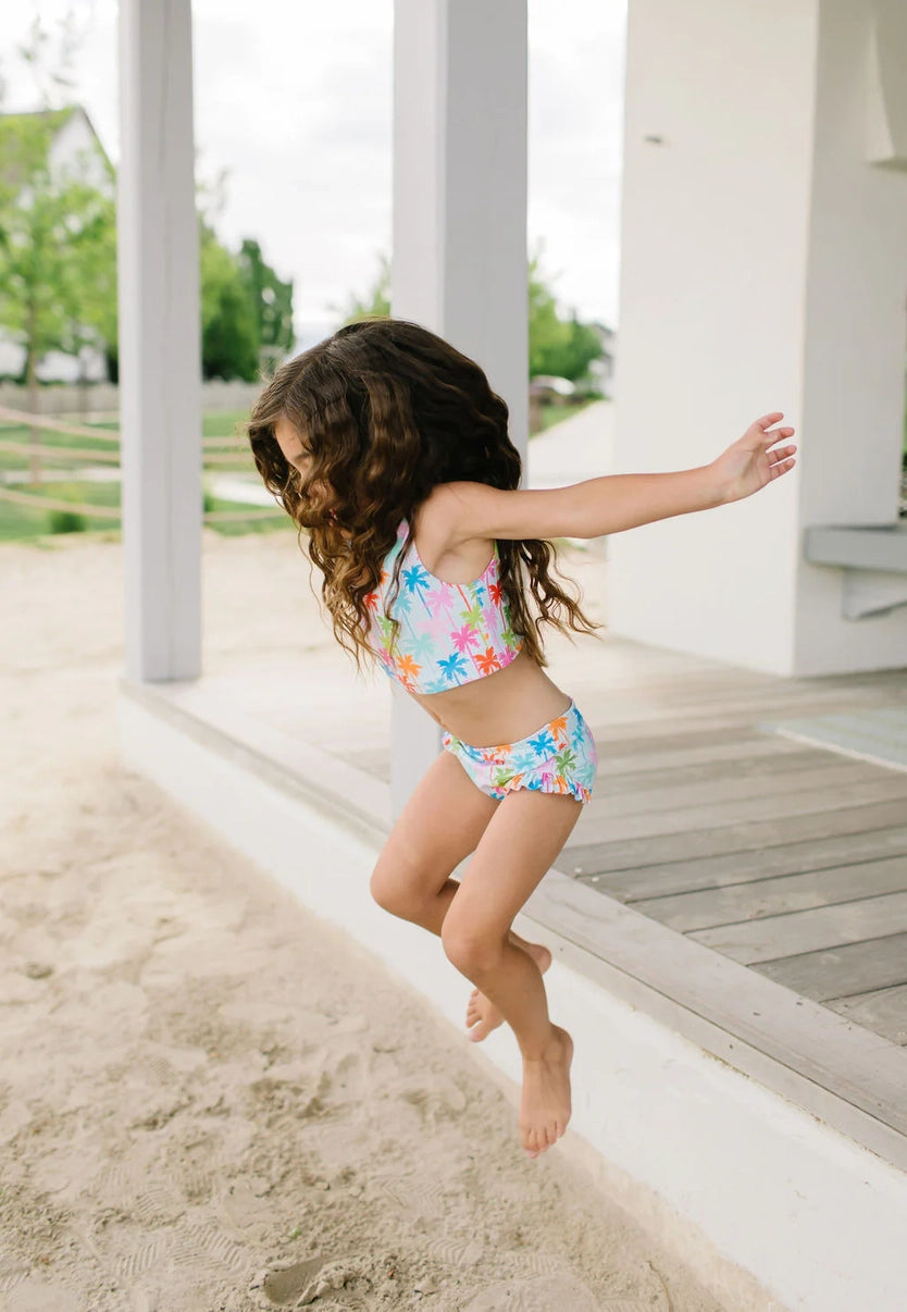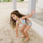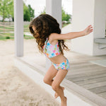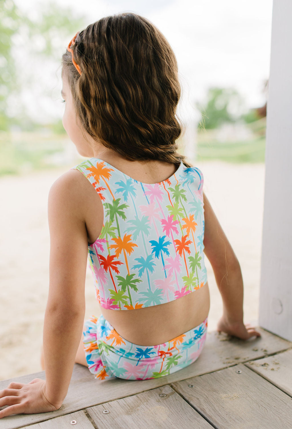 Make a splash this summer with the Ellie Swim Set, featuring a cropped tank-style top and matching bottoms, both adorned with sweet ruffle details. Crafted from UPF 50 protected fabric with a soft beige lining, this set keeps your little one protected while looking adorable in a summer print.