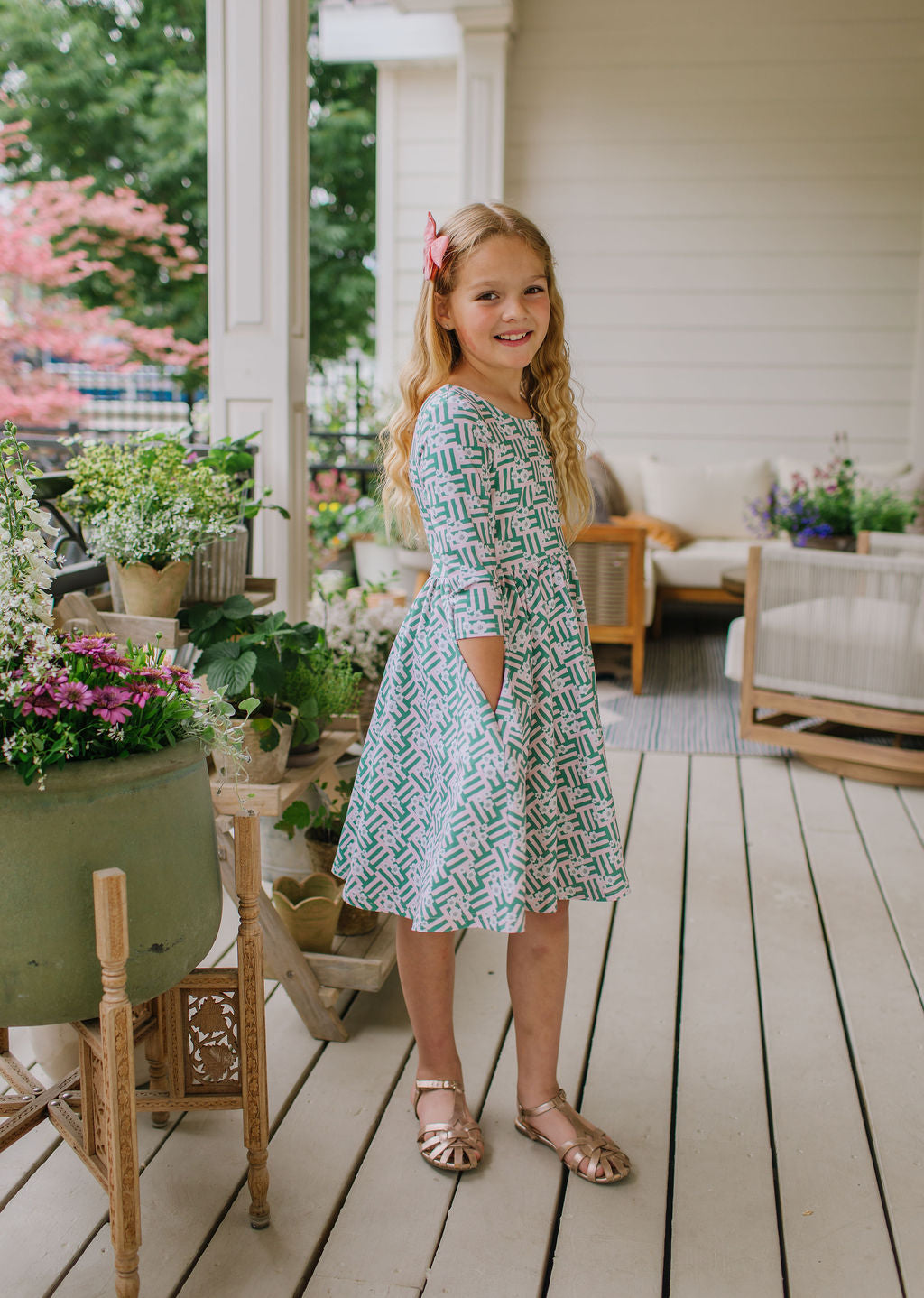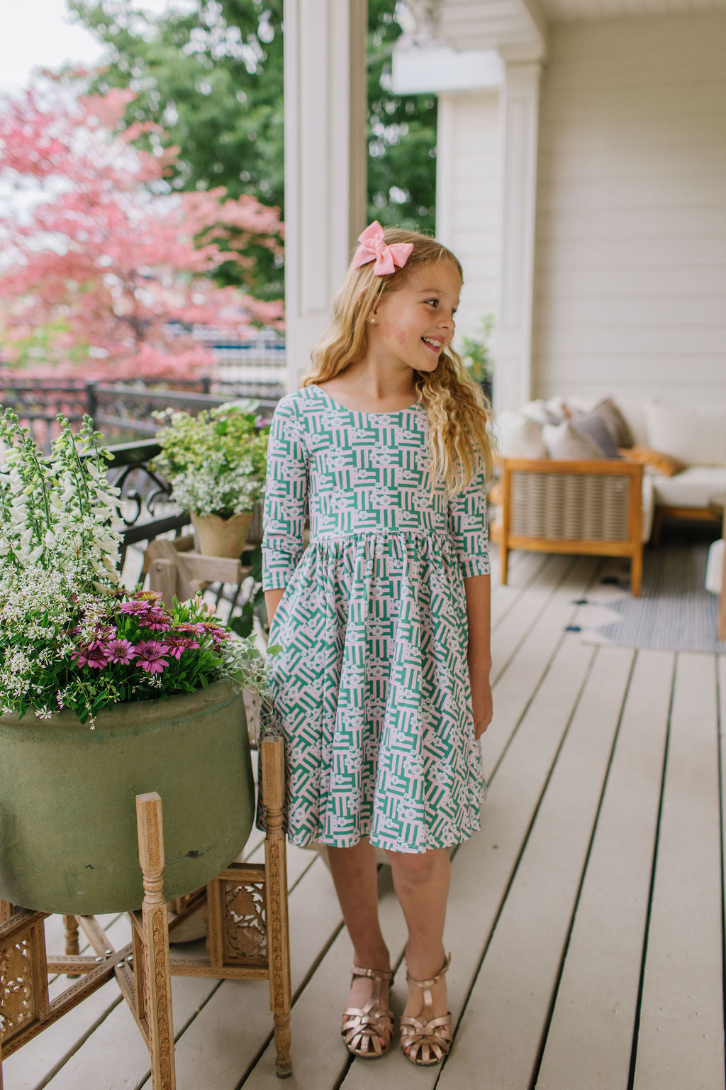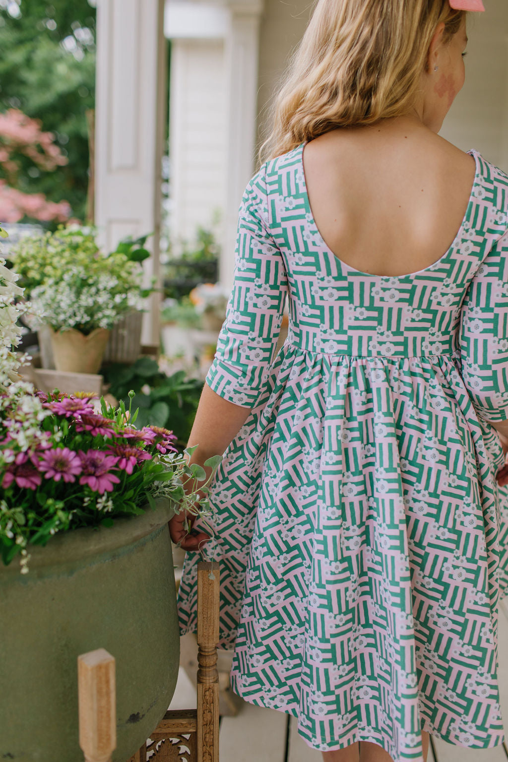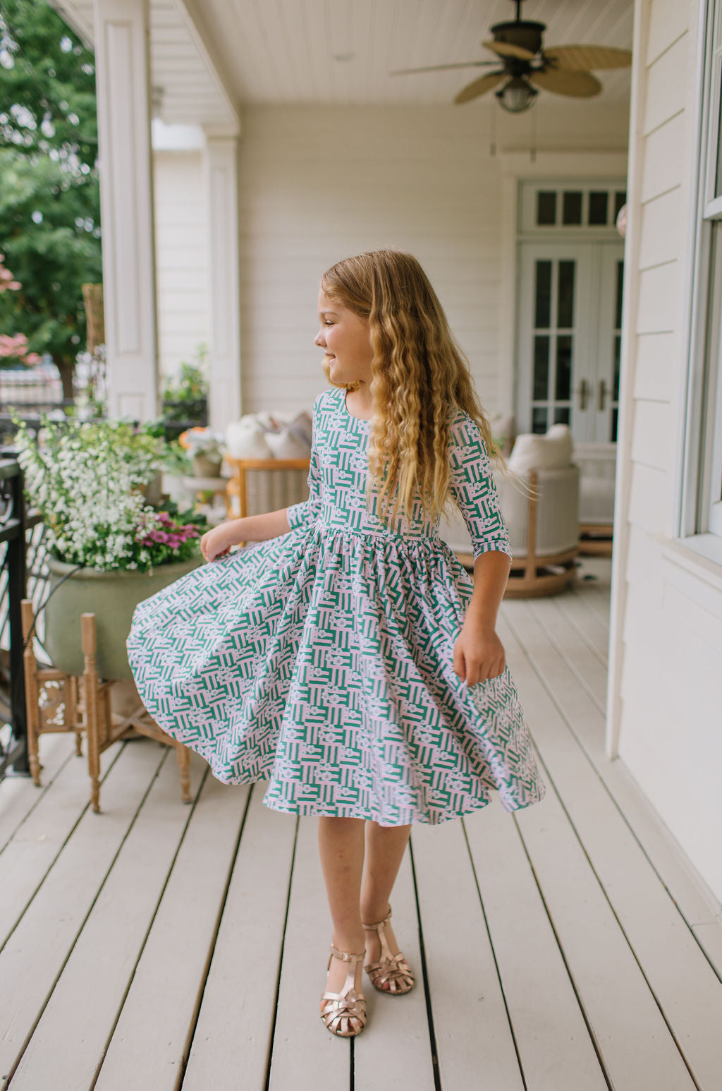 Our Emile Dress combines timeless style with cozy comfort. Featuring 3/4 sleeves, a graceful scoop back, and a full circle twirl skirt, this dress is designed for playful days and special moments alike. Hidden seam pockets add practicality without compromising style.