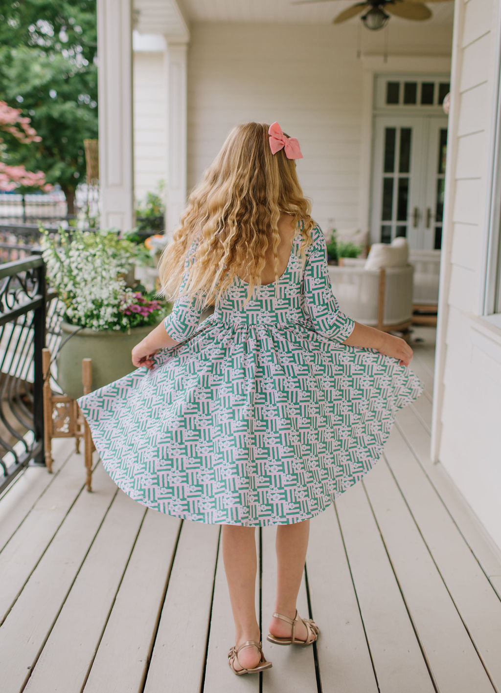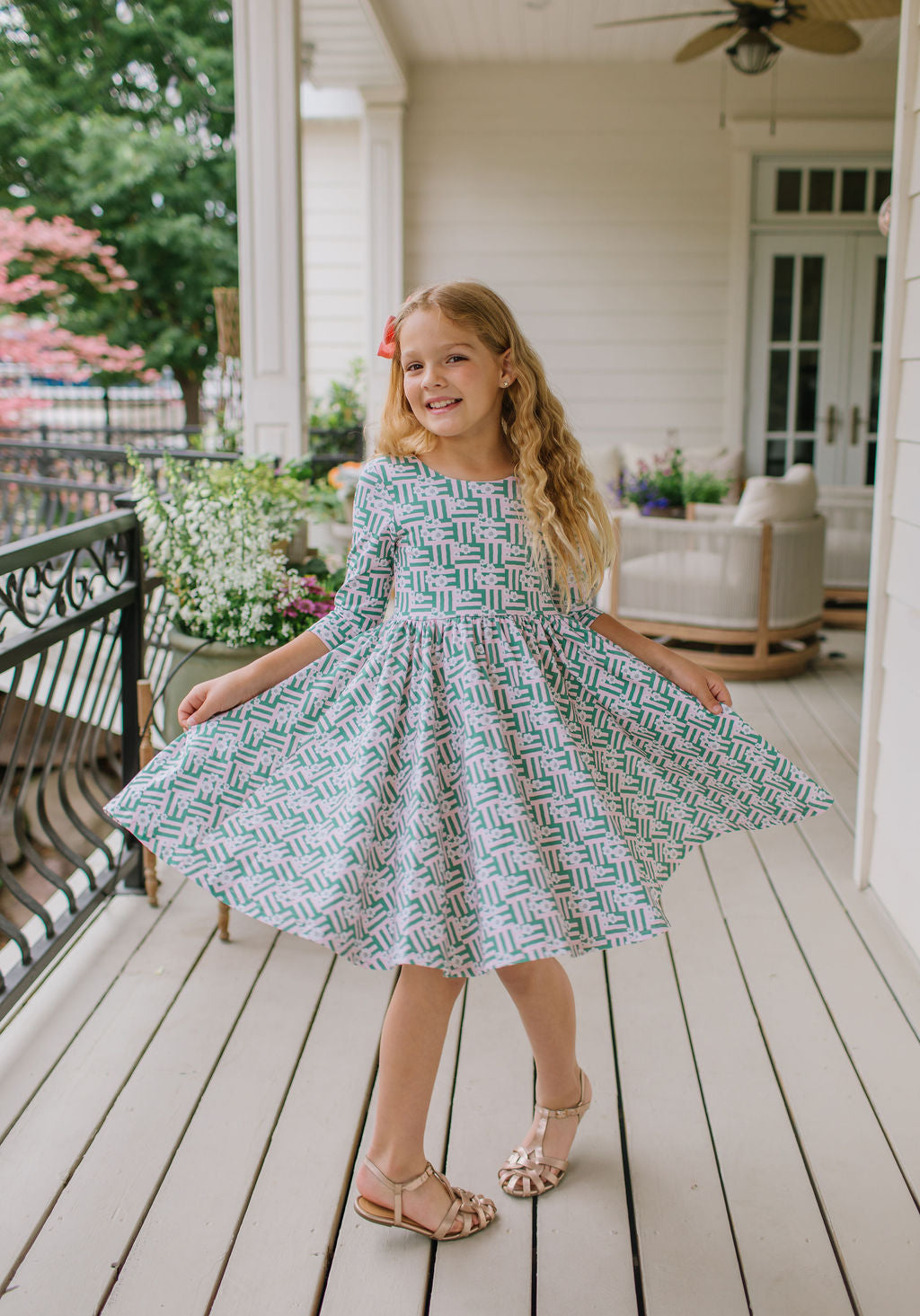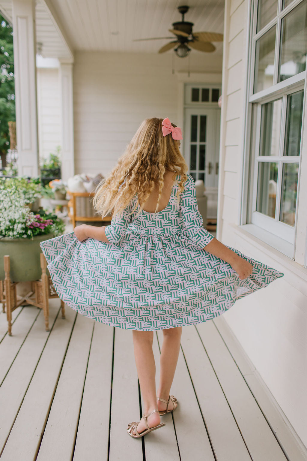 Our Emile Dress combines timeless style with cozy comfort. Featuring 3/4 sleeves, a graceful scoop back, and a full circle twirl skirt, this dress is designed for playful days and special moments alike. Hidden seam pockets add practicality without compromising style.