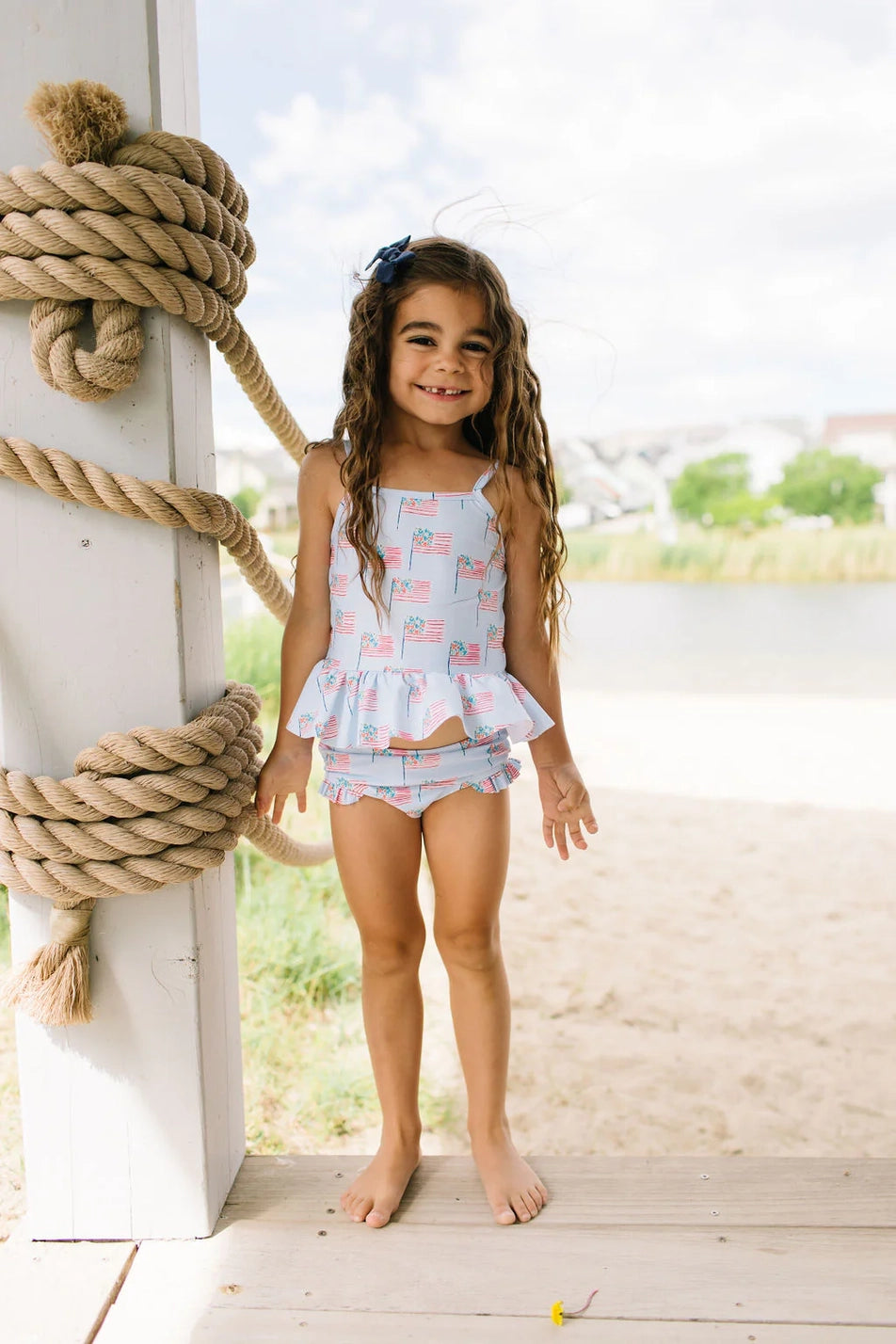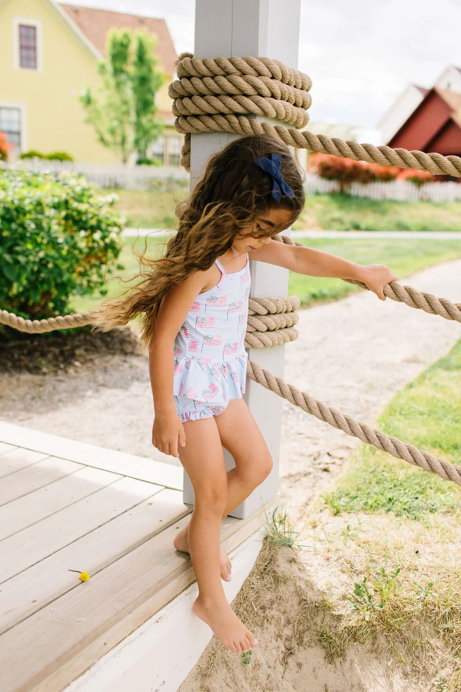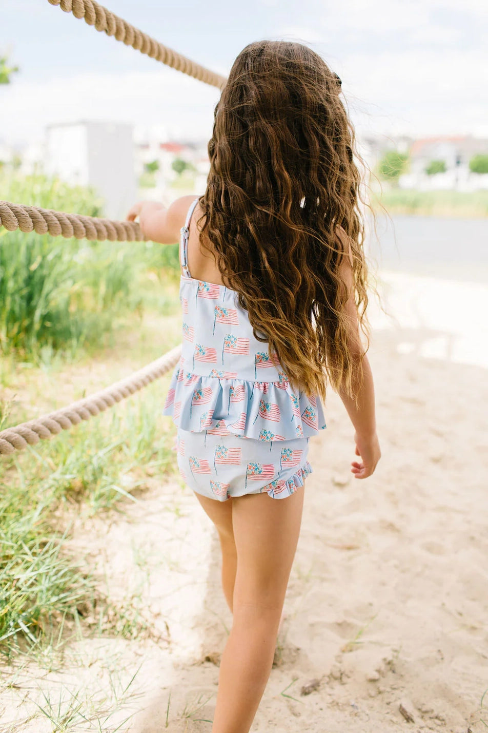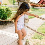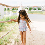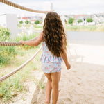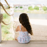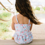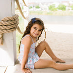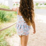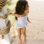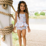 Make a splash this summer with the Emma Swim Set, featuring a wide-neck spaghetti strap tankini top with a charming peplum ruffle, paired with side-ruffled bikini bottoms for extra fun and flair. Crafted from UPF 50 protected fabric with a soft beige lining, this set offers both sun safety and adorable style in a lively summer print.