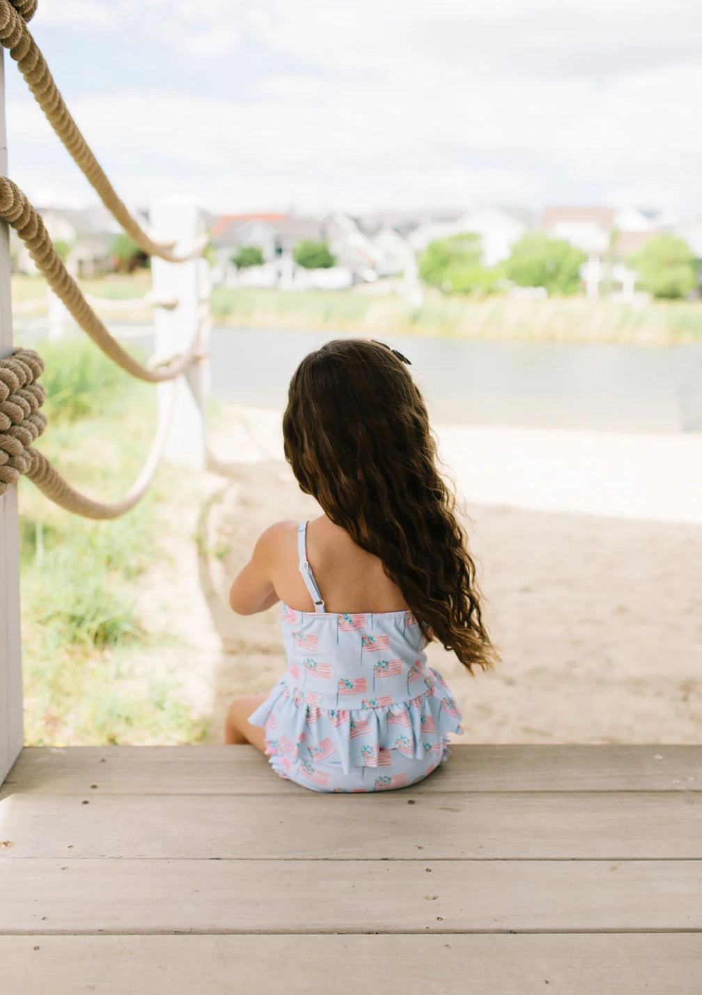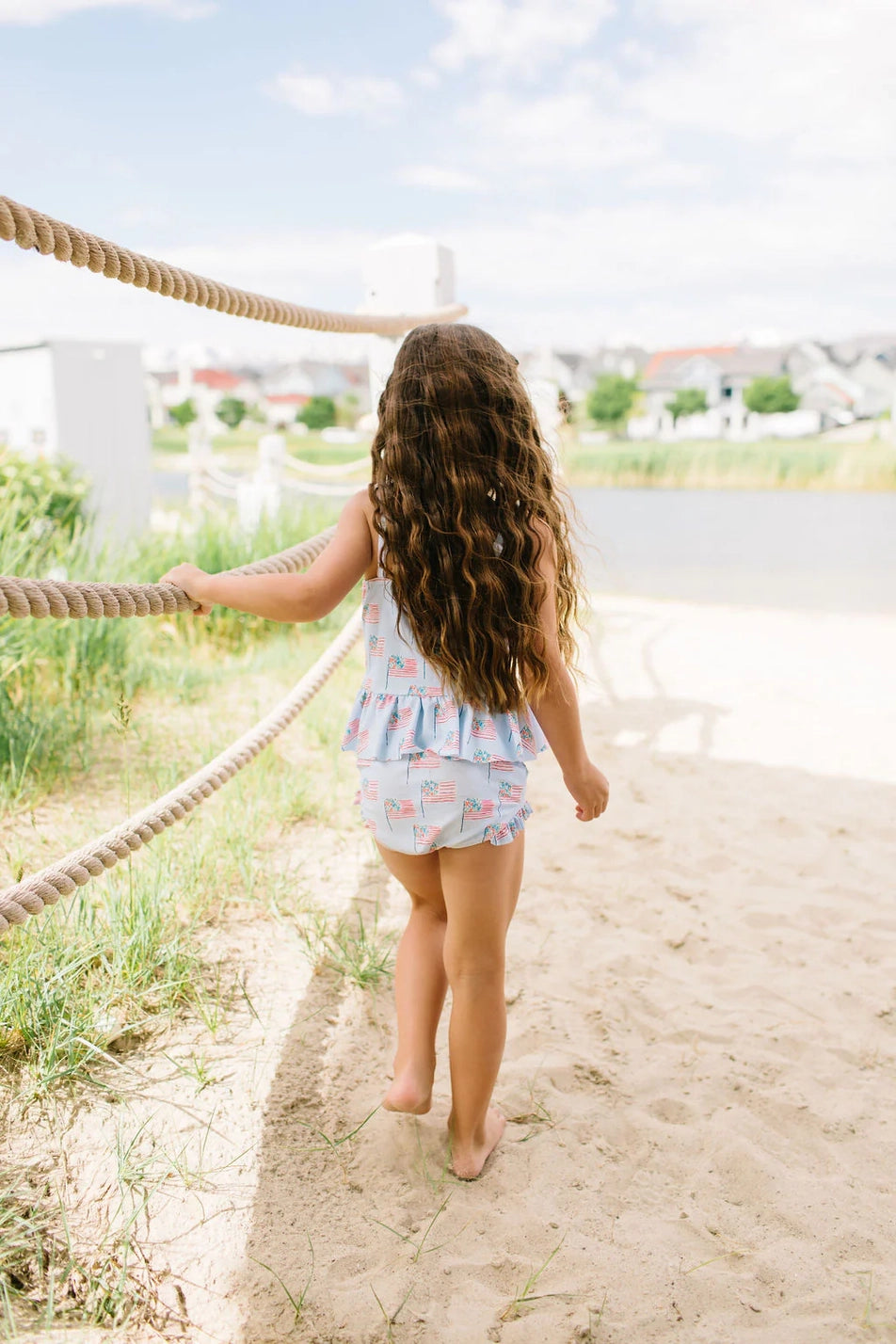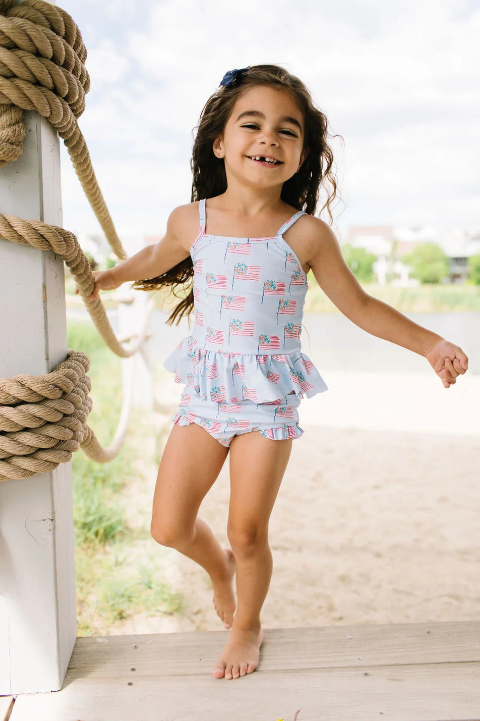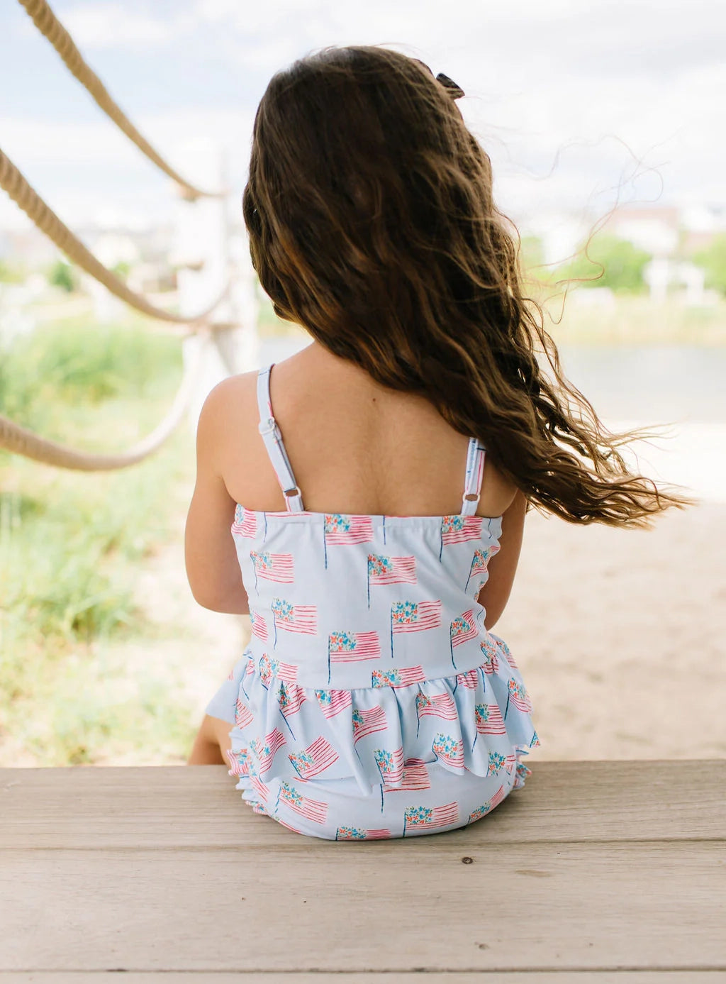 Make a splash this summer with the Emma Swim Set, featuring a wide-neck spaghetti strap tankini top with a charming peplum ruffle, paired with side-ruffled bikini bottoms for extra fun and flair. Crafted from UPF 50 protected fabric with a soft beige lining, this set offers both sun safety and adorable style in a lively summer print.