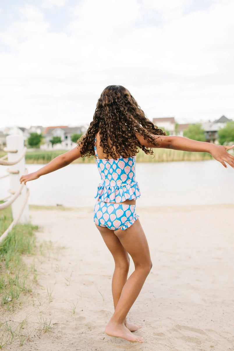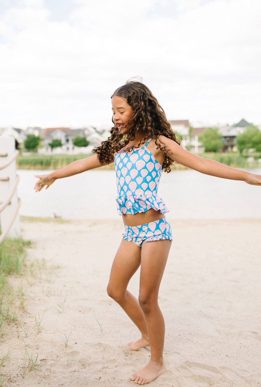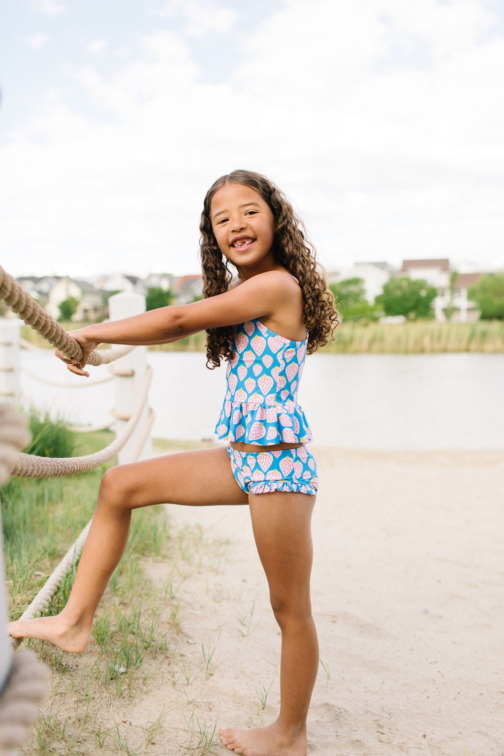 Make a splash this summer with the Emma Swim Set, featuring a wide-neck spaghetti strap tankini top with a charming peplum ruffle, paired with side-ruffled bikini bottoms for extra fun and flair. Crafted from UPF 50 protected fabric with a soft beige lining, this set offers both sun safety and adorable style in a lively summer print.
