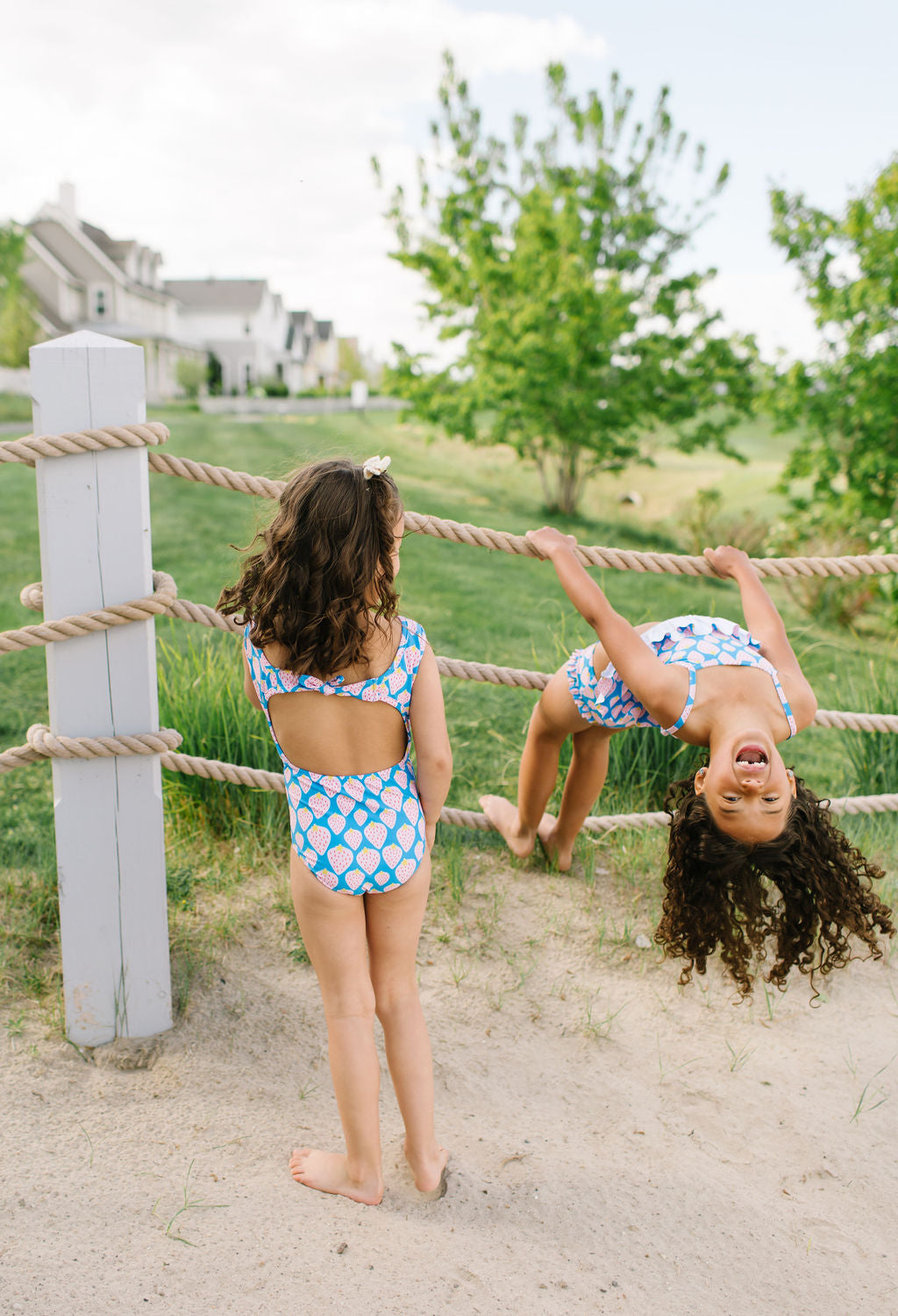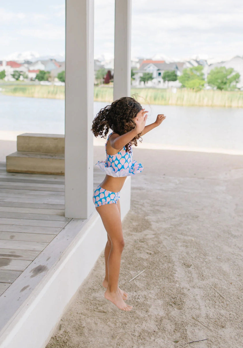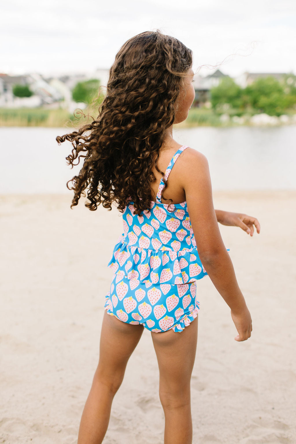 Make a splash this summer with the Emma Swim Set, featuring a wide-neck spaghetti strap tankini top with a charming peplum ruffle, paired with side-ruffled bikini bottoms for extra fun and flair. Crafted from UPF 50 protected fabric with a soft beige lining, this set offers both sun safety and adorable style in a lively summer print.