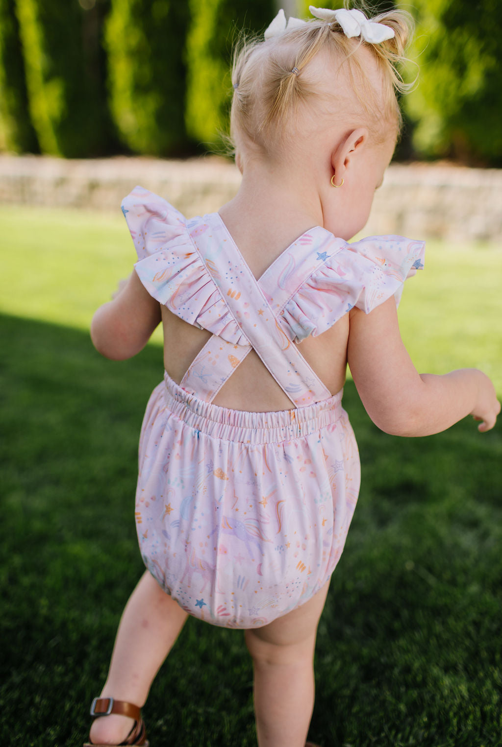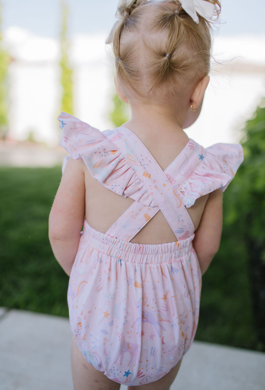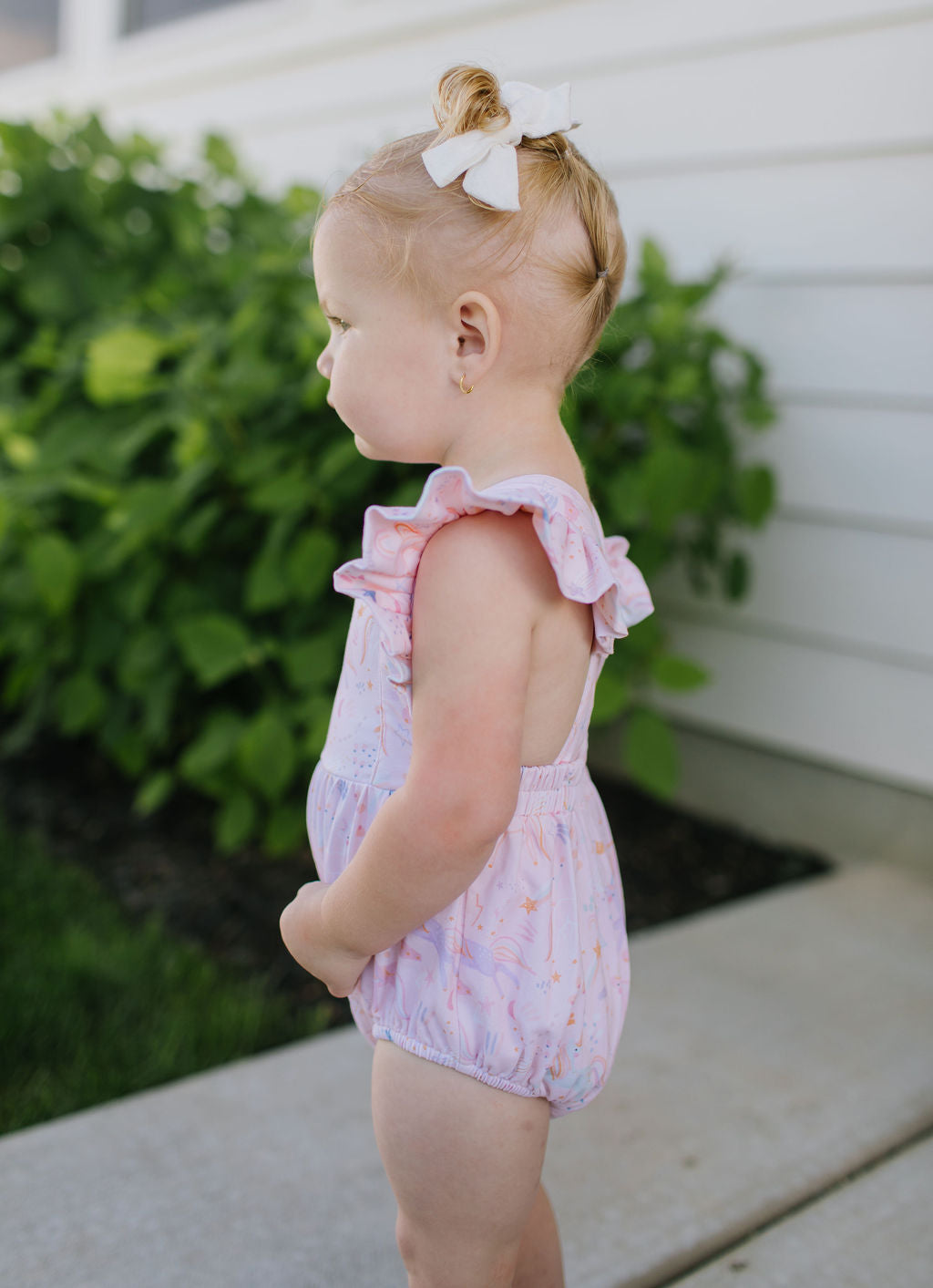 Designed for little movers, the Emmy Bubble combines comfort and style with its super soft, stretchy fabric that moves with your child. Delightful ruffled details adorn the shoulders and cascade down the back, adding a sweet touch. Plus, adjustable straps ensure a perfect fit as they grow.