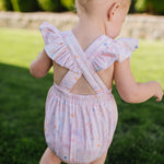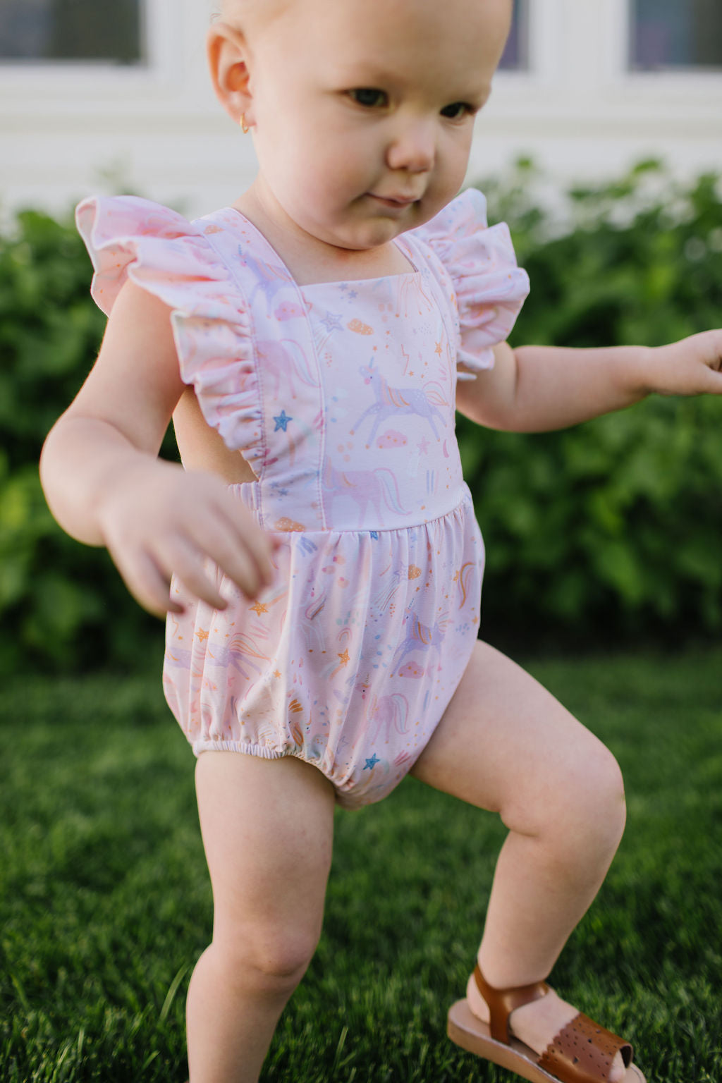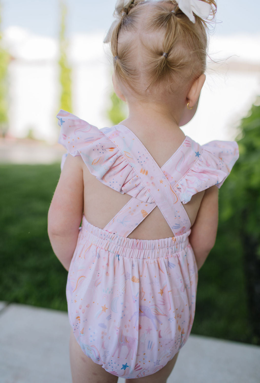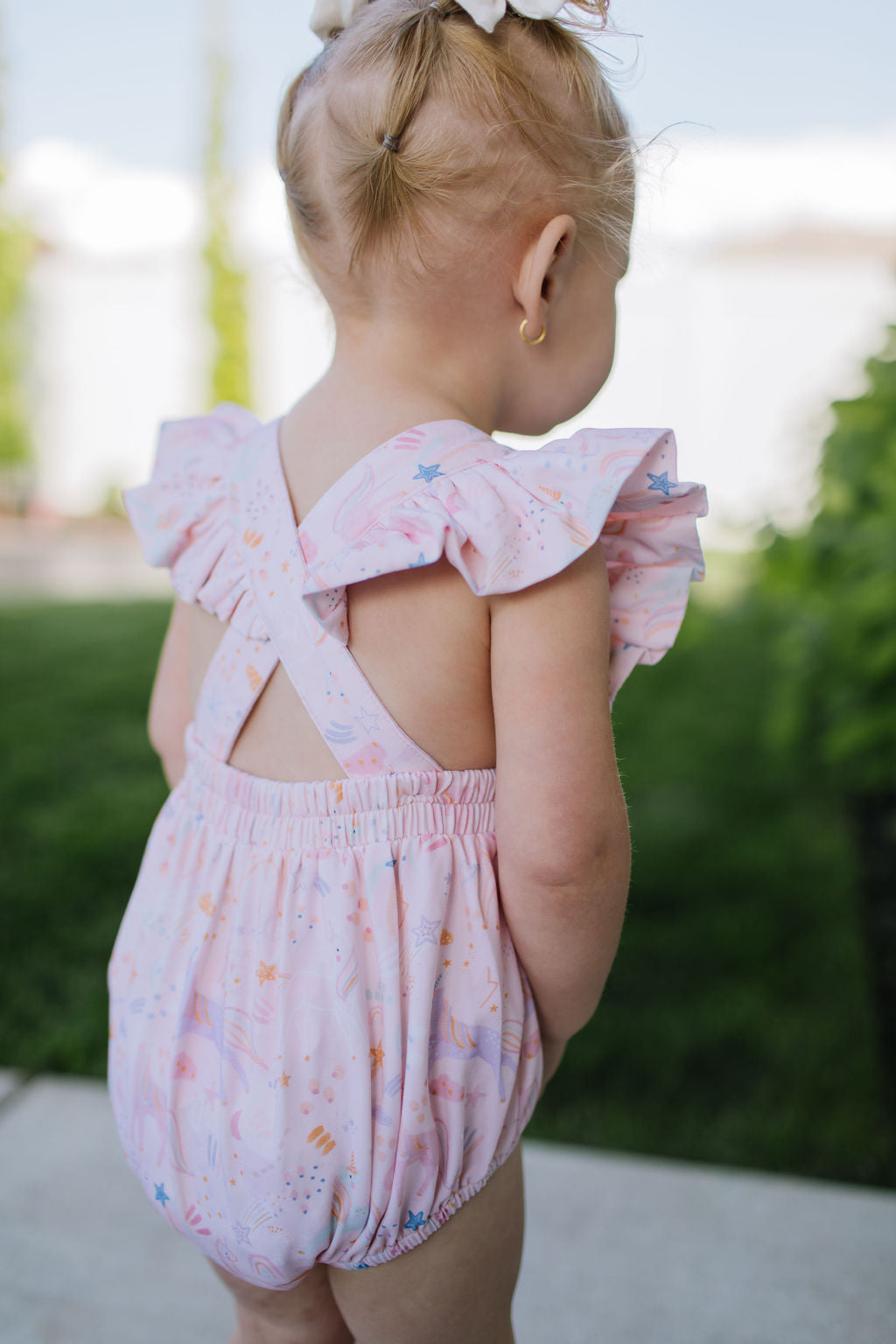 Designed for little movers, the Emmy Bubble combines comfort and style with its super soft, stretchy fabric that moves with your child. Delightful ruffled details adorn the shoulders and cascade down the back, adding a sweet touch. Plus, adjustable straps ensure a perfect fit as they grow.