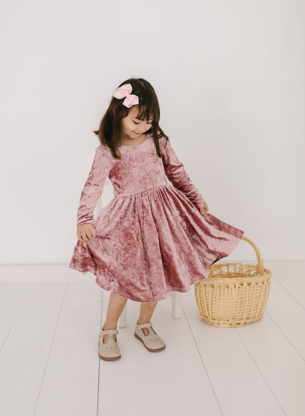The Gwendolyn Dress combines comfort and classic style with long sleeves, a flattering scoop back, and a full circle twirl skirt that’s perfect for playtime and special occasions alike. Hidden pockets in the seams add practical charm, while our super soft crushed velvet fabric ensures all-day comfort.