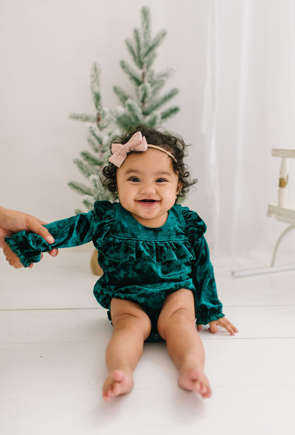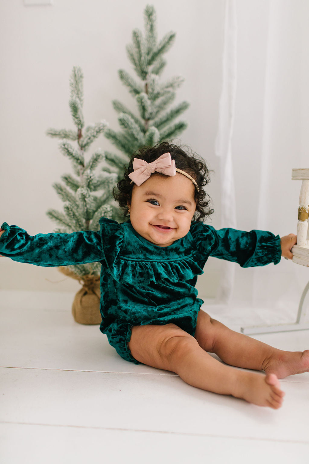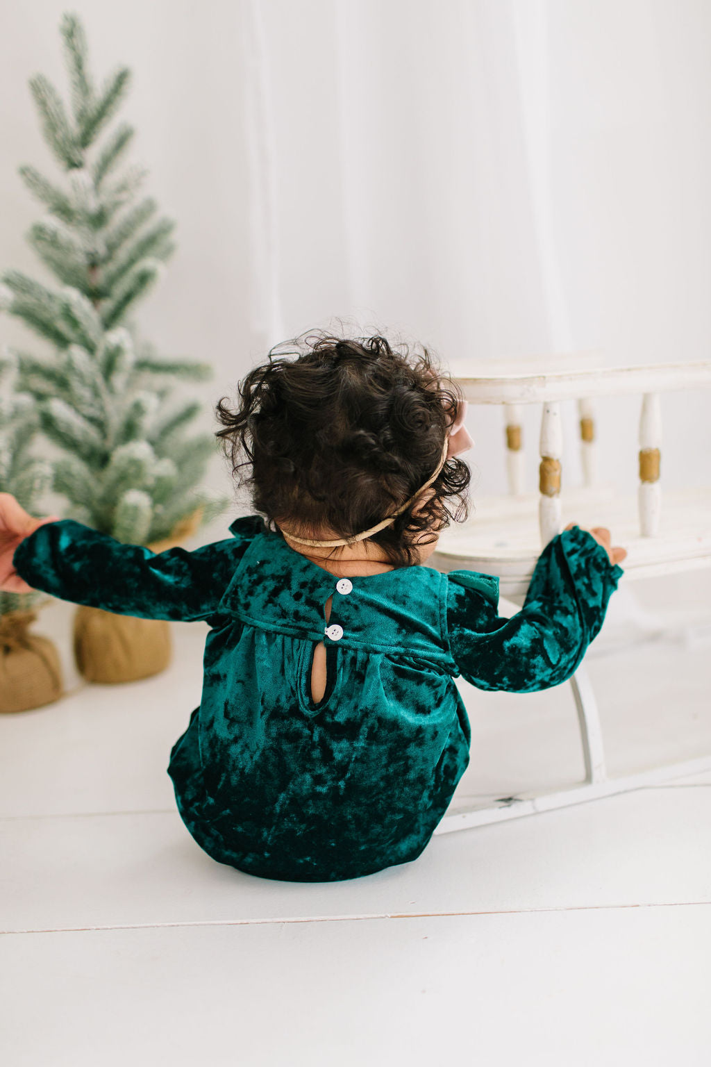 The Hayley Bubble is an elegant one-piece with thoughtful, vintage-inspired details. Made from soft and cozy velvet, it features flowy long sleeves with ruffled wrists, a square-shaped ruffle across the bodice, and a double button back with loop closure for easy dressing. A three-snap diaper closure ensures quick and simple changes.
