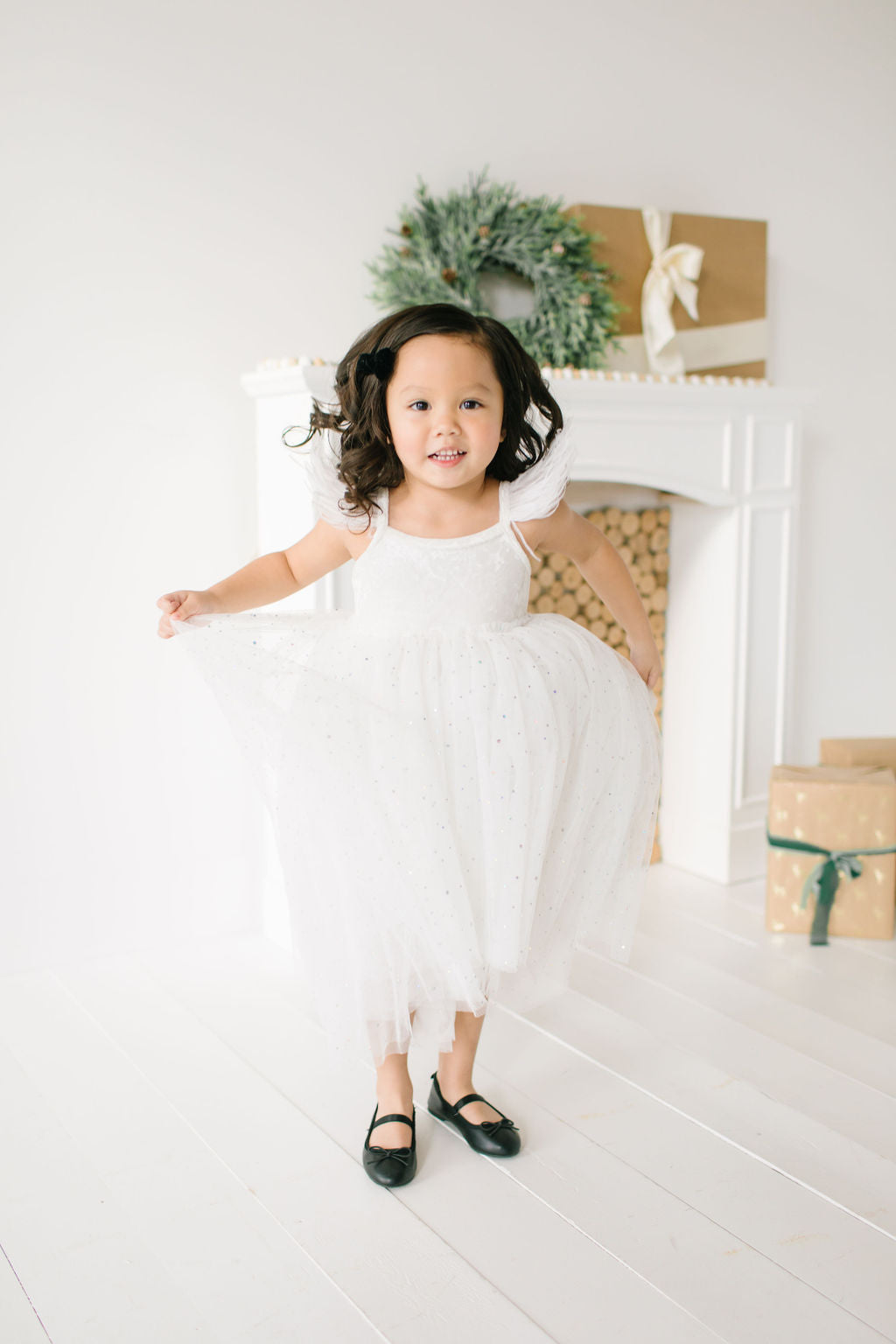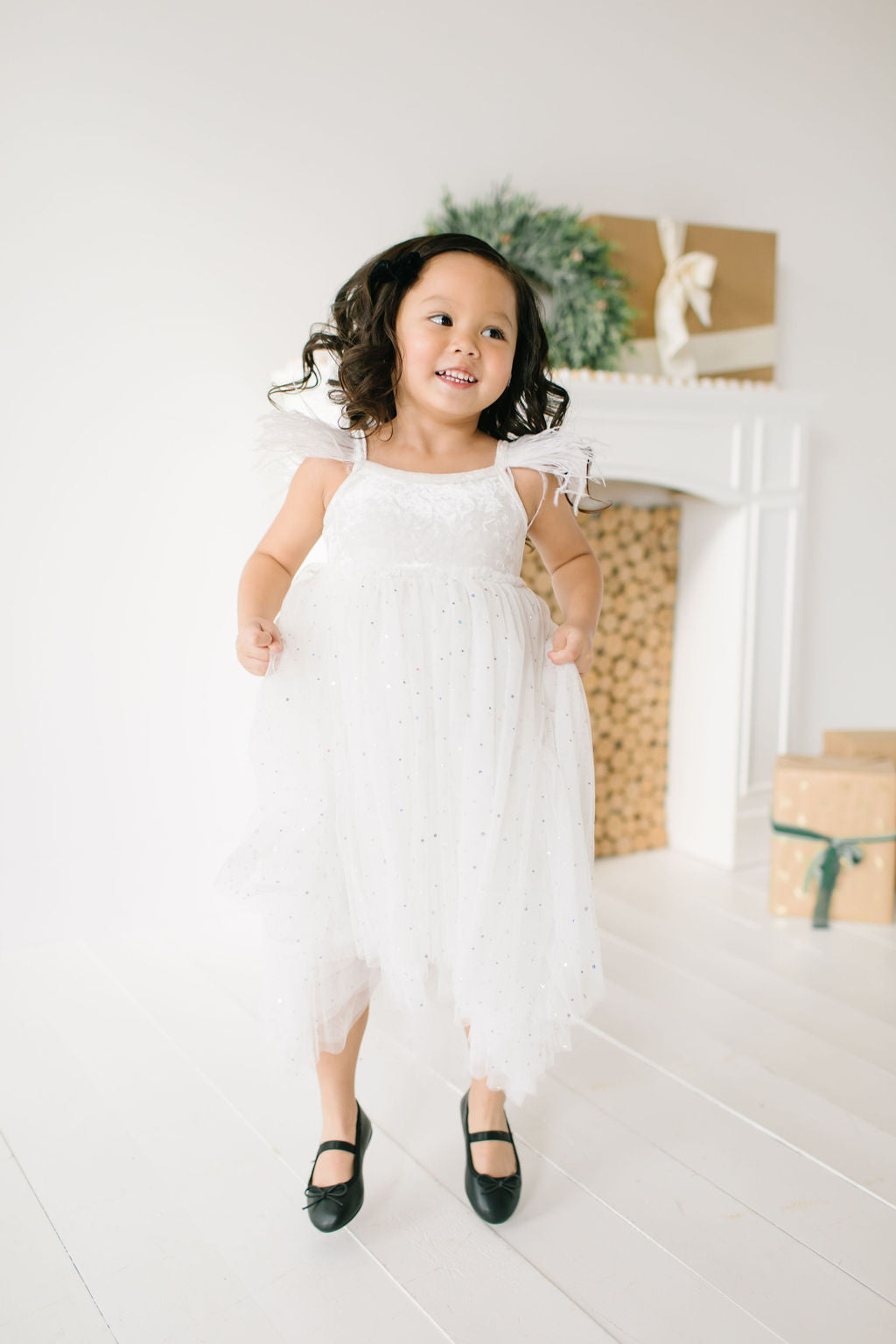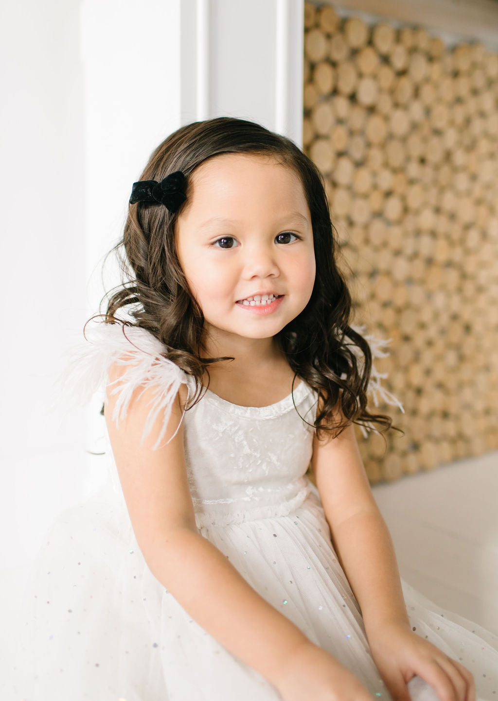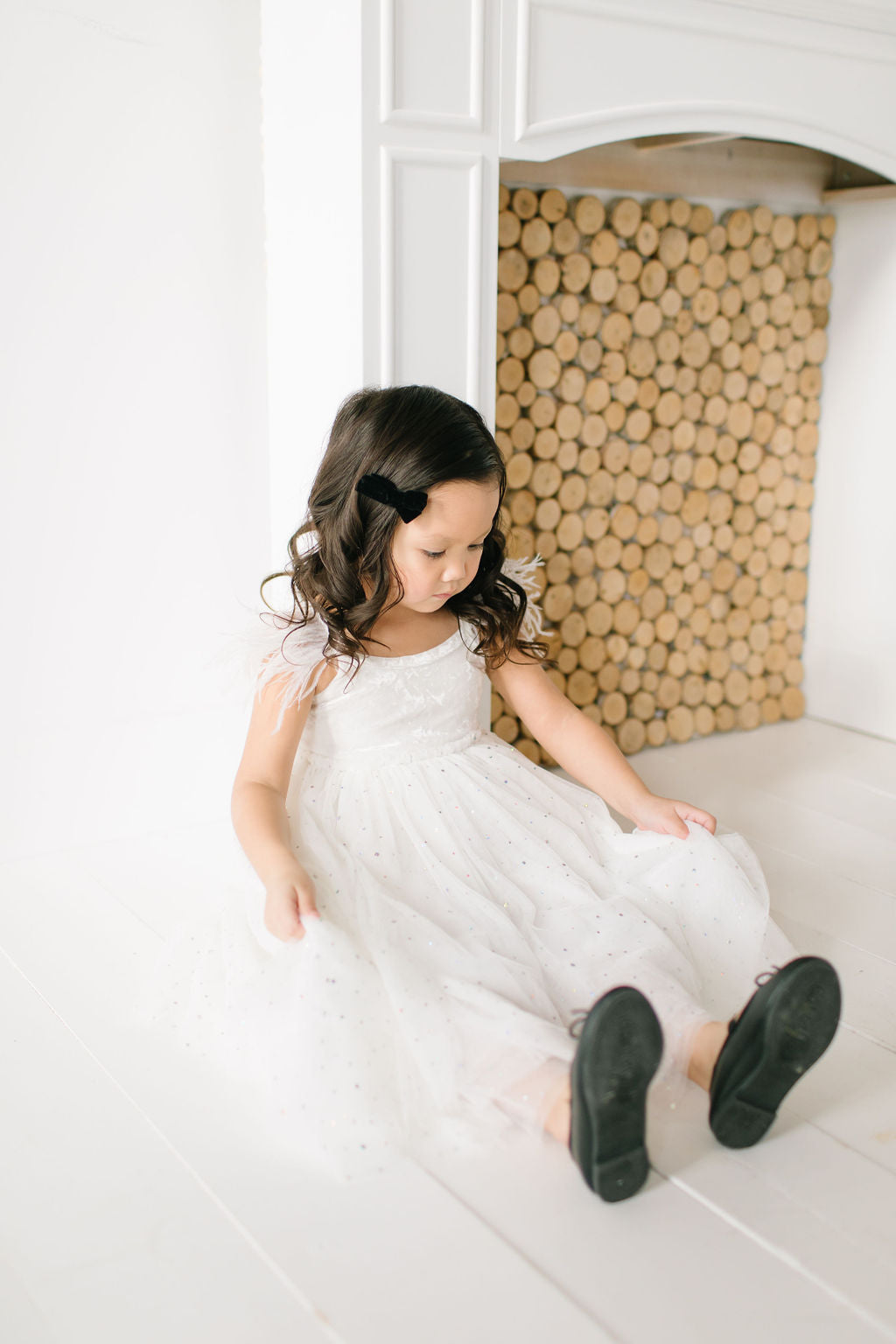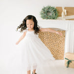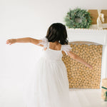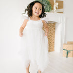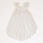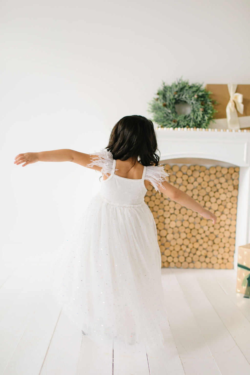 The Jolie Dress is a true showstopper, combining delicate textures with magical details. Featuring an elegant up-down style multi-layer tulle skirt and a soft velvet bodice with spaghetti straps, this dress brings drama and grace to any special occasion. The sleeves are adorned with full, delicate feathers, adding a touch of fairy-tale flair that’s sure to turn heads.