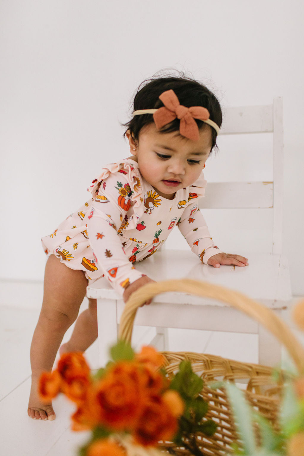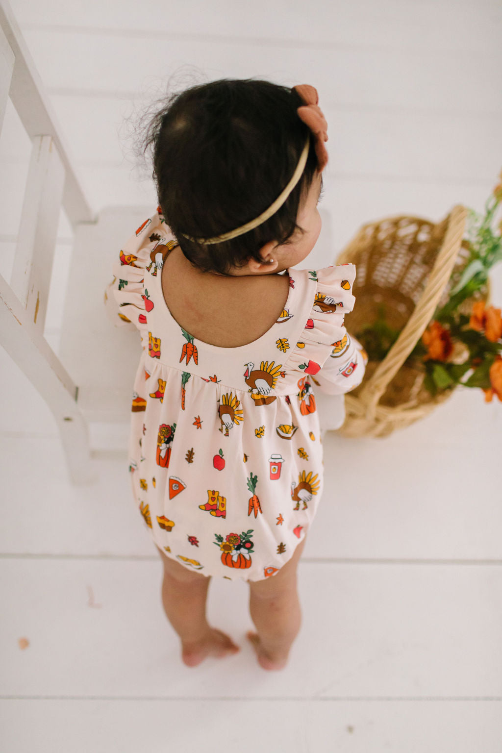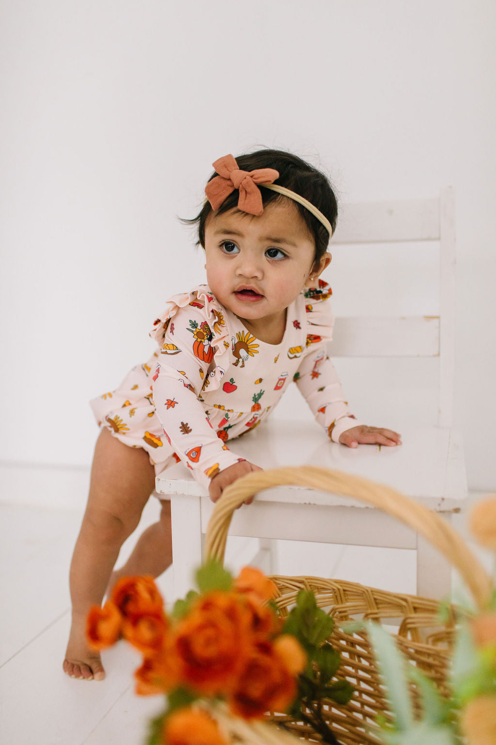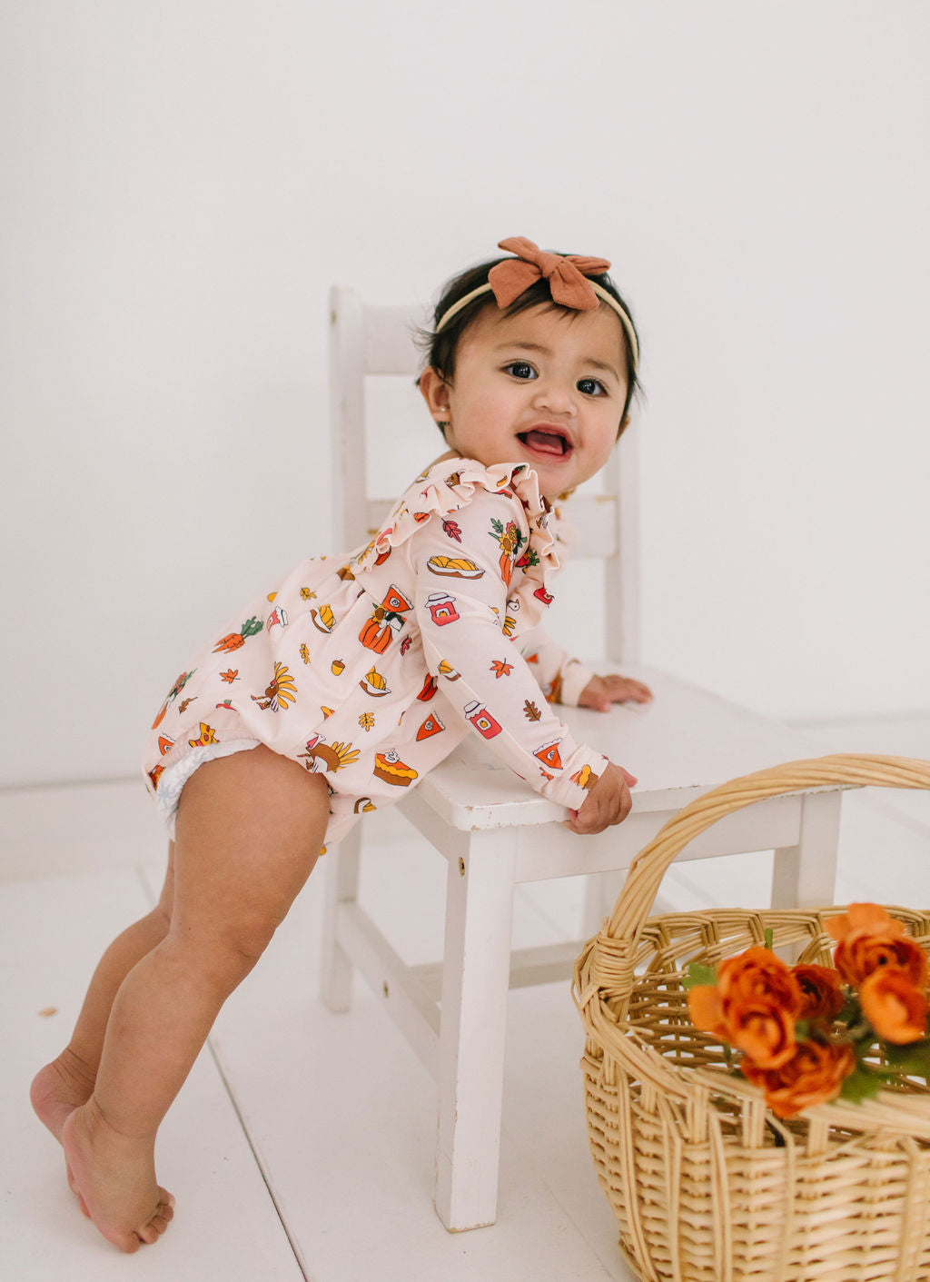 The Leah Romper is a charming and practical piece for little ones, featuring long sleeves and ruffles that wrap across the shoulder line in the front and back for a soft, playful touch. The design also includes a scooped back for added style, and a three-snap closure at the bottom for quick and easy diaper changes.