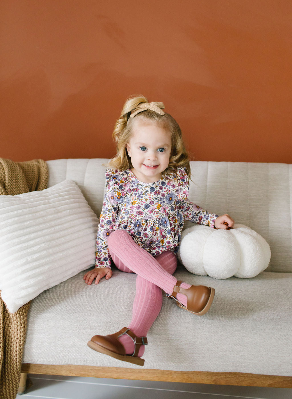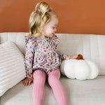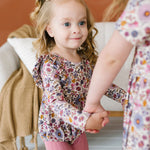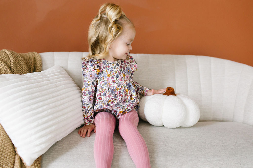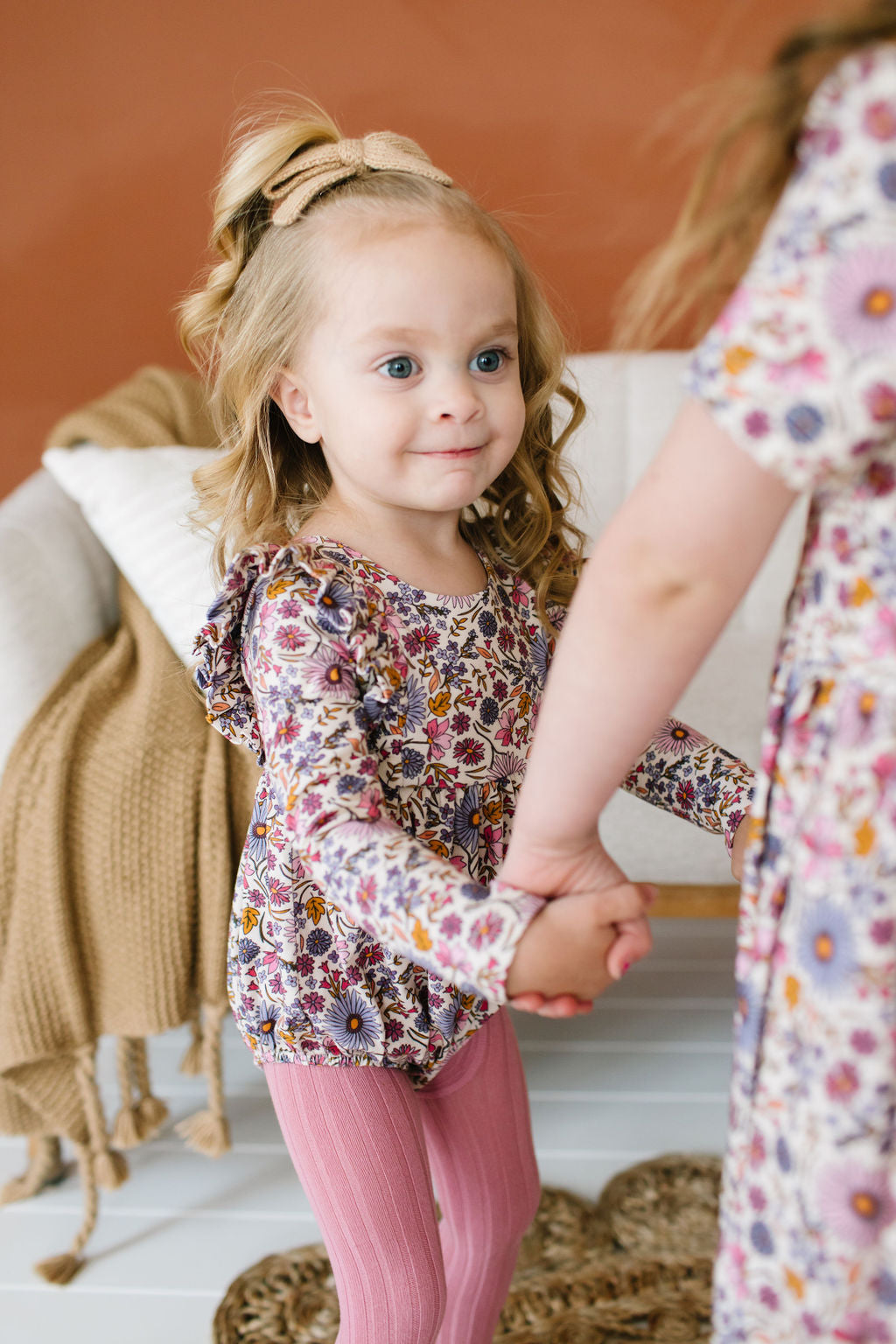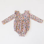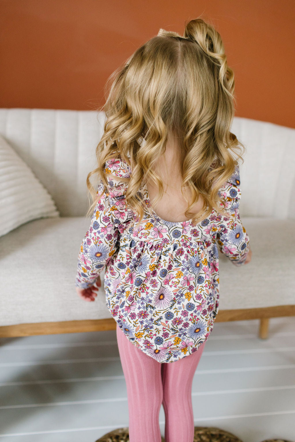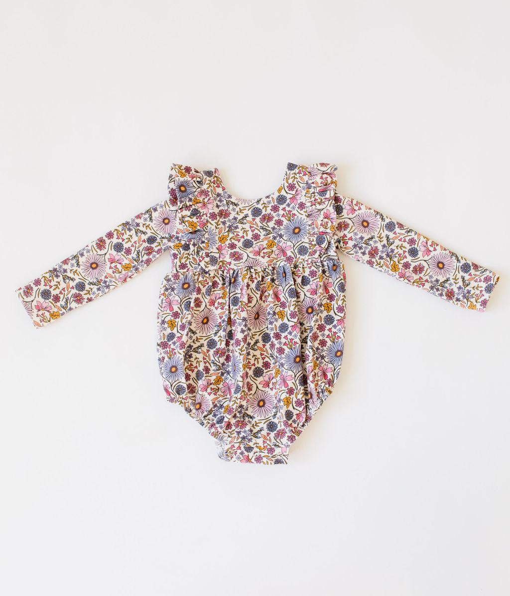 The Leah Romper is a charming and practical piece for little ones, featuring long sleeves and ruffles that wrap across the shoulder line in the front and back for a soft, playful touch. The design also includes a scooped back for added style, and a three-snap closure at the bottom for quick and easy diaper changes.
