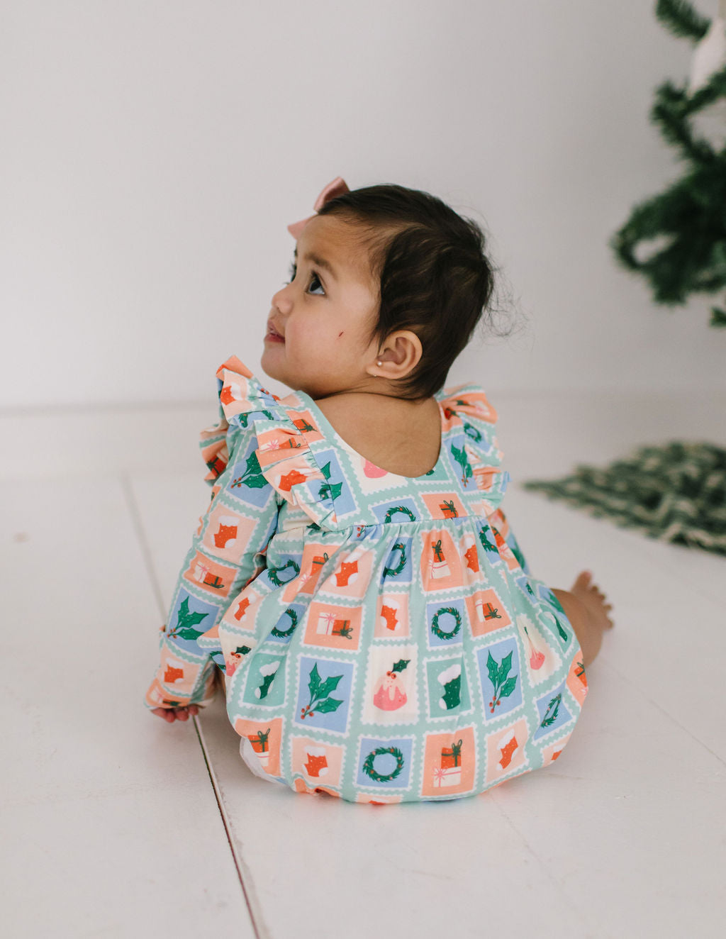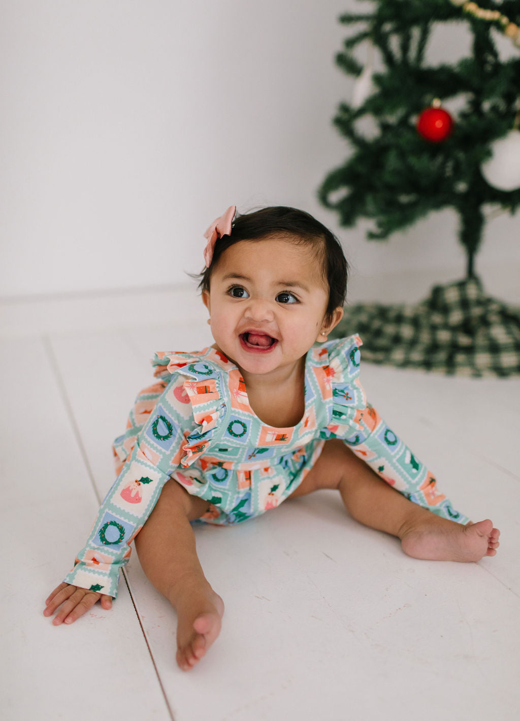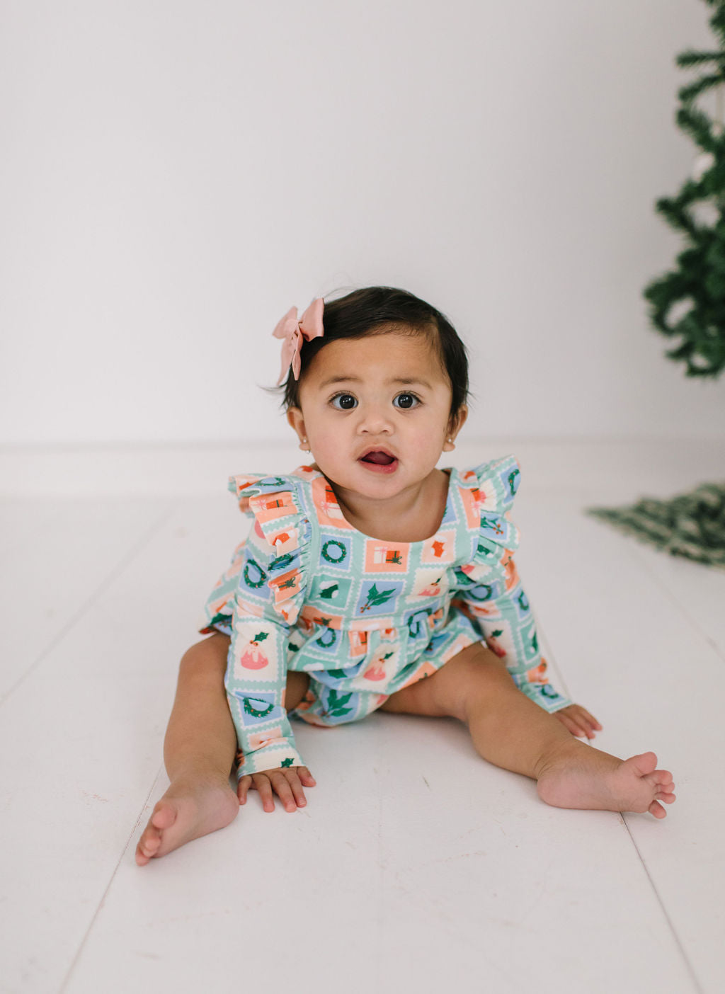 The Leah Romper is a charming and practical piece for little ones, featuring long sleeves and ruffles that wrap across the shoulder line in the front and back for a soft, playful touch. The design also includes a scooped back for added style, and a three-snap closure at the bottom for quick and easy diaper changes.