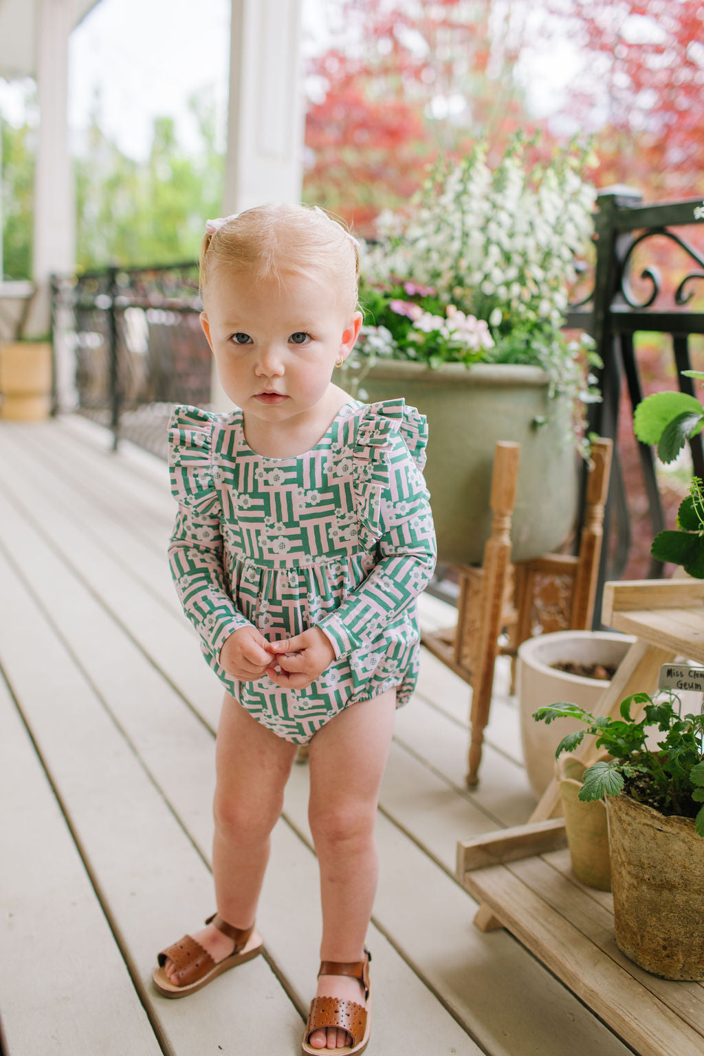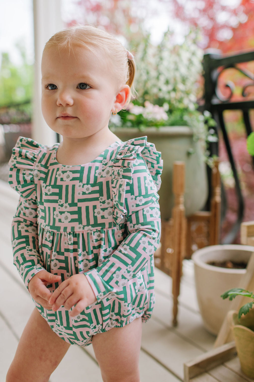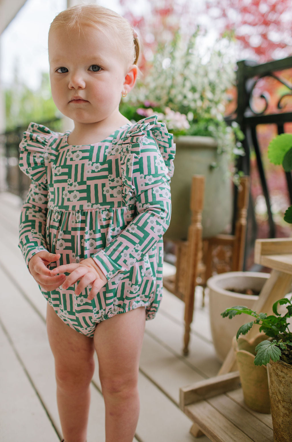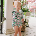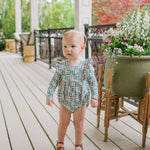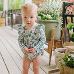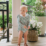 The Leah Romper is a charming and practical piece for little ones, featuring long sleeves and ruffles that wrap across the shoulder line in the front and back for a soft, playful touch. The design also includes a scooped back for added style, and a three-snap closure at the bottom for quick and easy diaper changes.