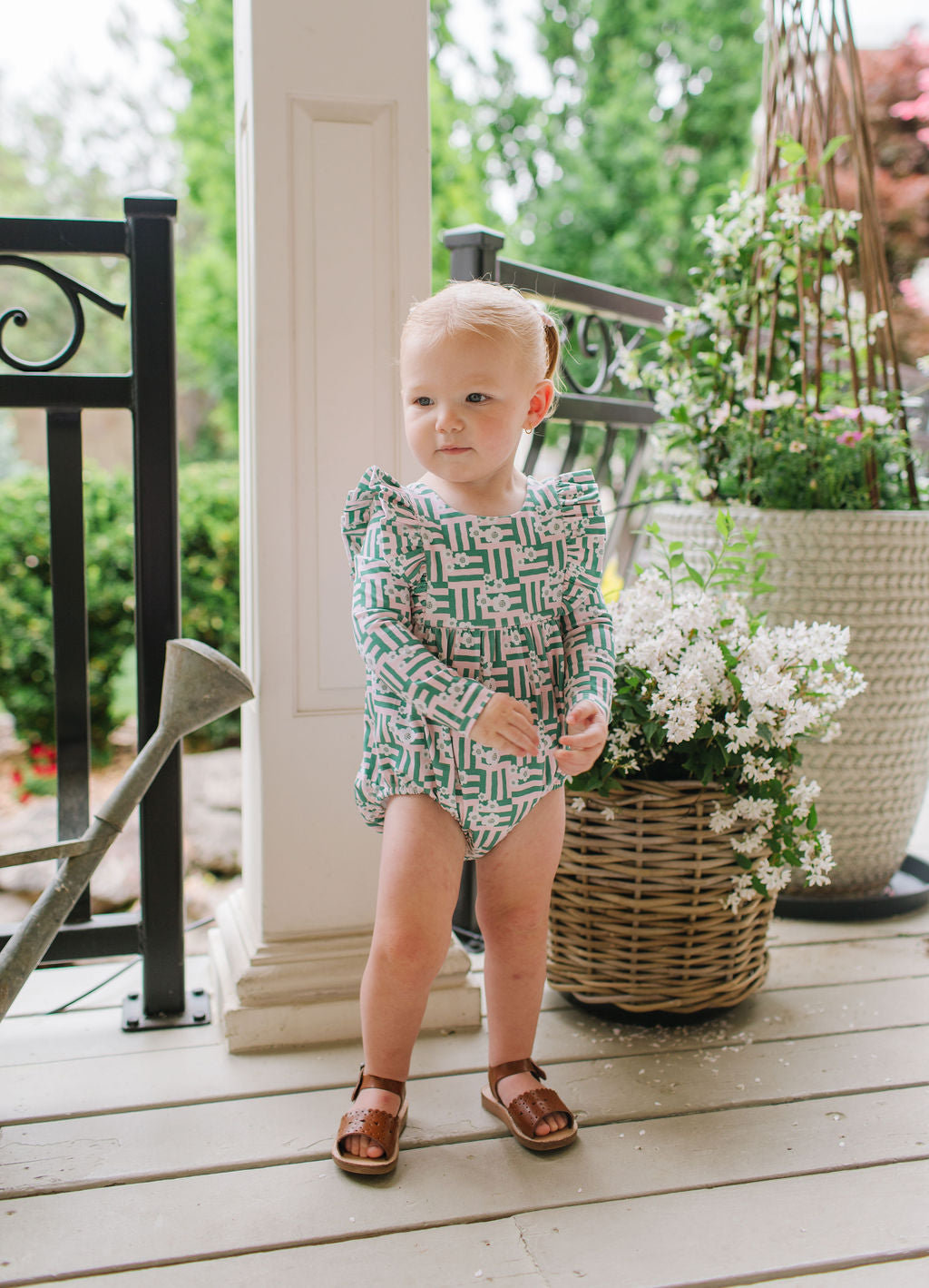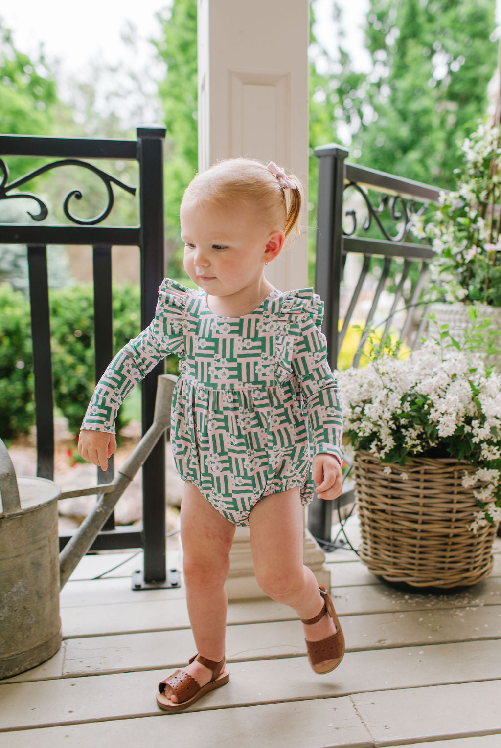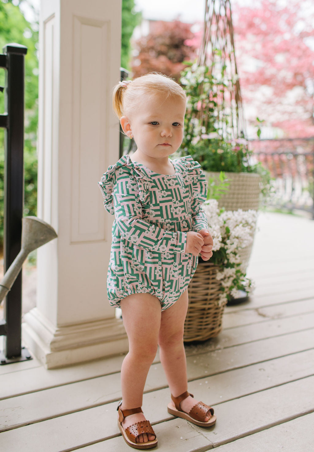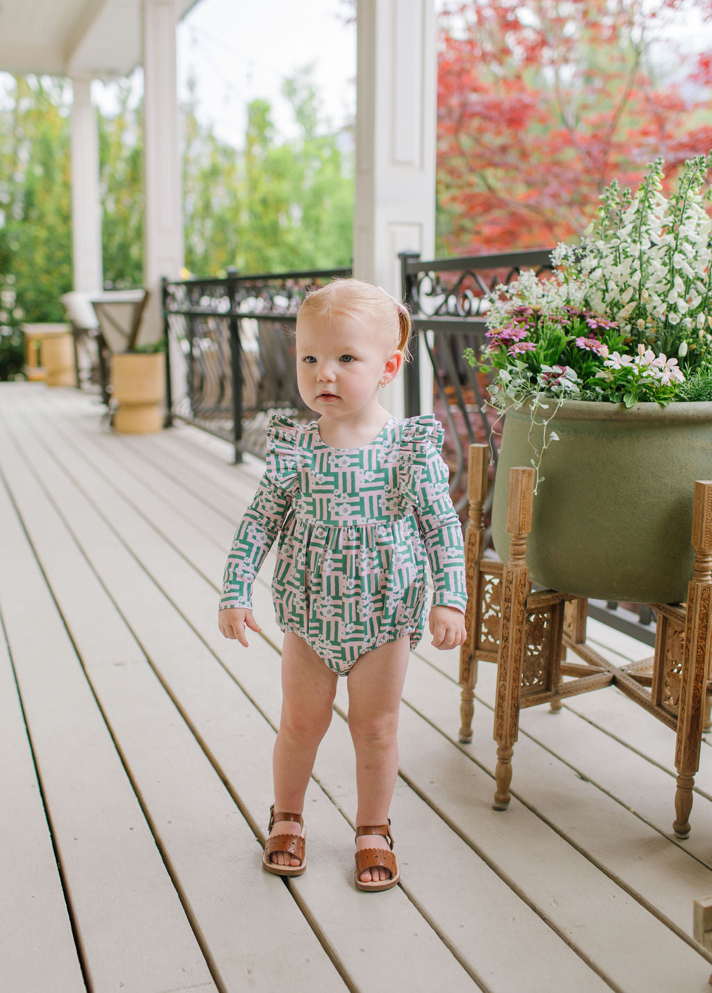 The Leah Romper is a charming and practical piece for little ones, featuring long sleeves and ruffles that wrap across the shoulder line in the front and back for a soft, playful touch. The design also includes a scooped back for added style, and a three-snap closure at the bottom for quick and easy diaper changes.