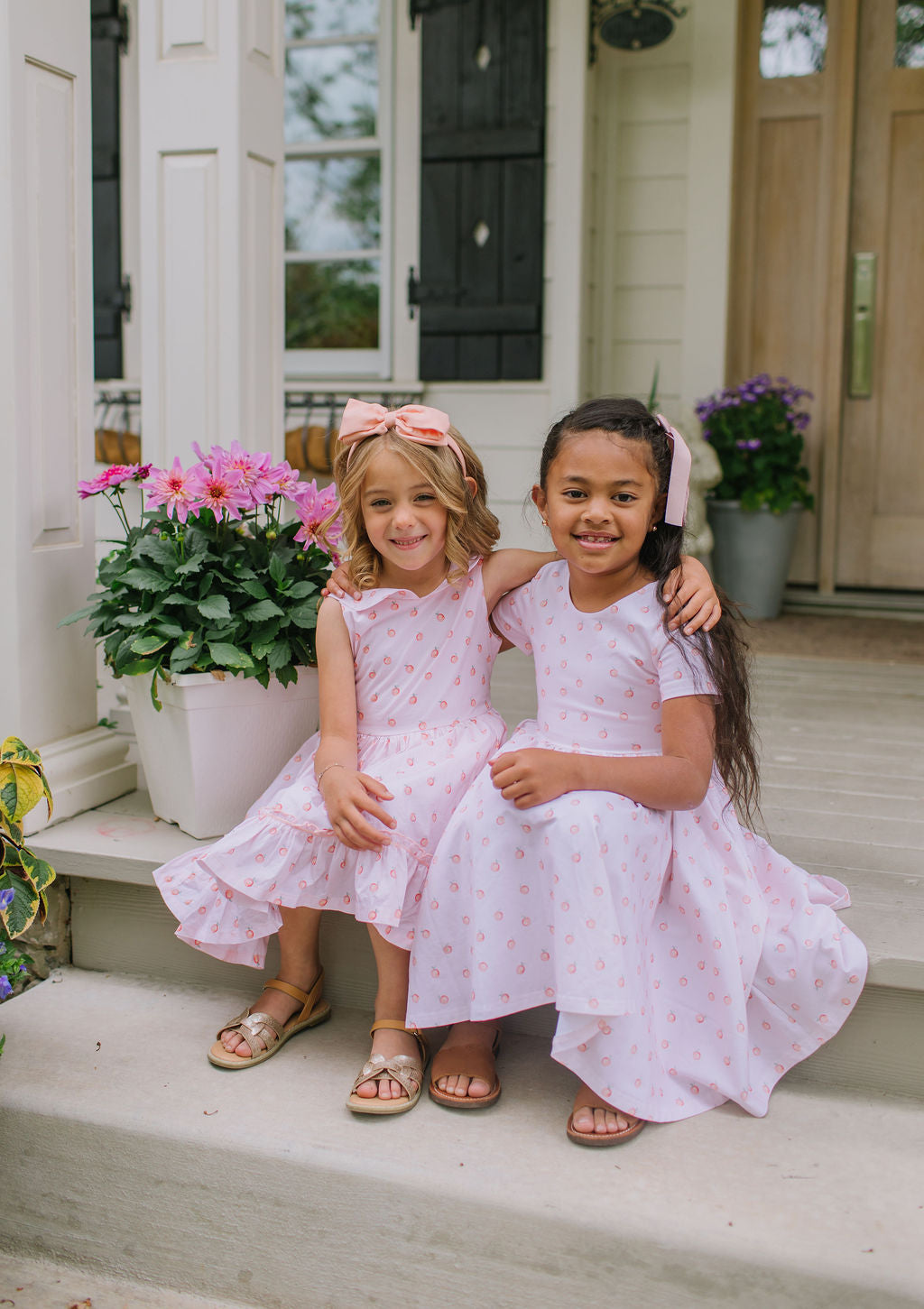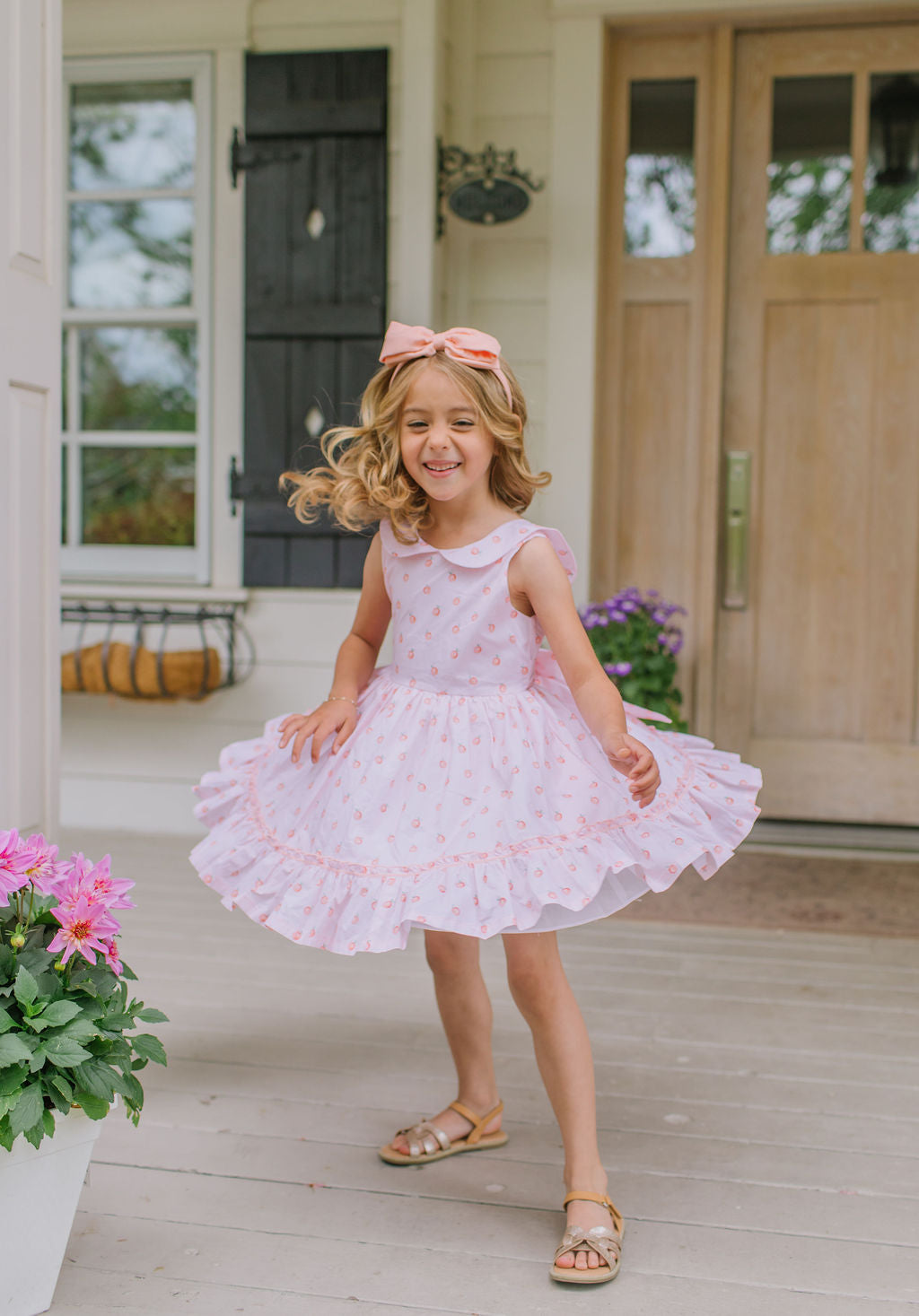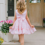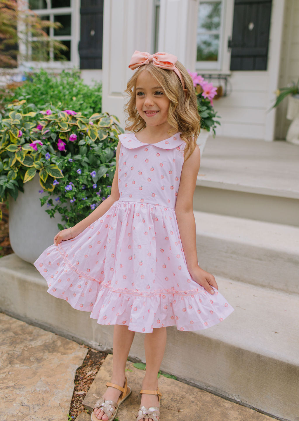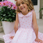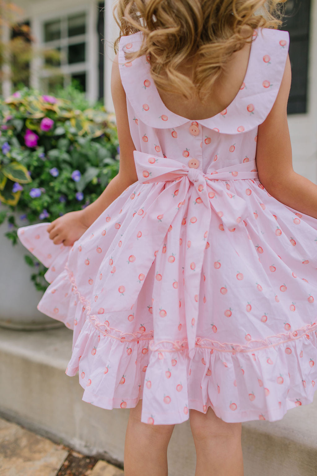 The Lara Dress is a classic beauty with heirloom-inspired charm. Featuring a full skirt with trim and a sweet ruffle hem, this dress is crafted from crisp 100% poplin cotton with a soft cotton liner for comfort. The standout detail is the Peter Pan wrap-around collar, which gently scoops in the back, finished with two delicate buttons and a sash that ties into a bow for a picture-perfect silhouette.