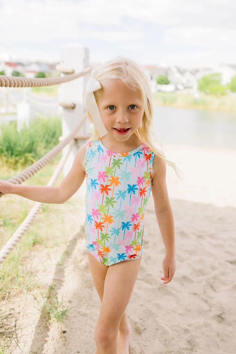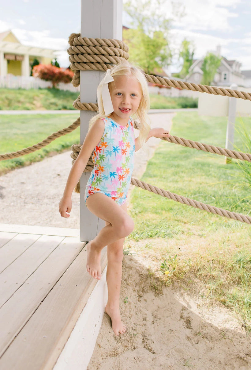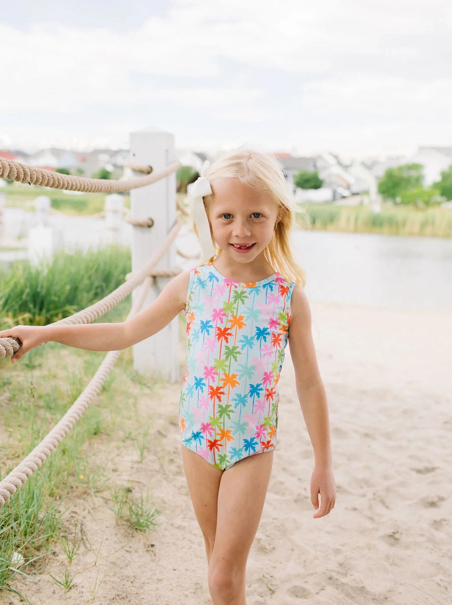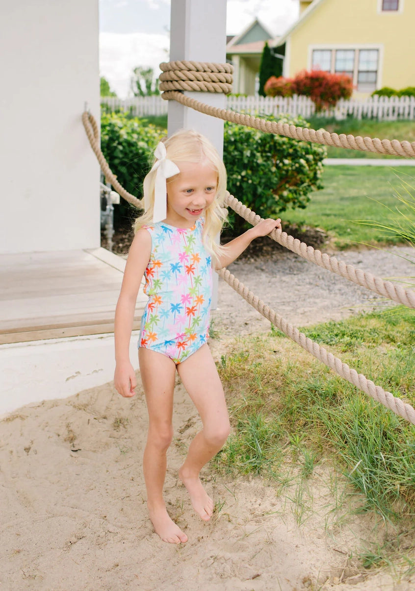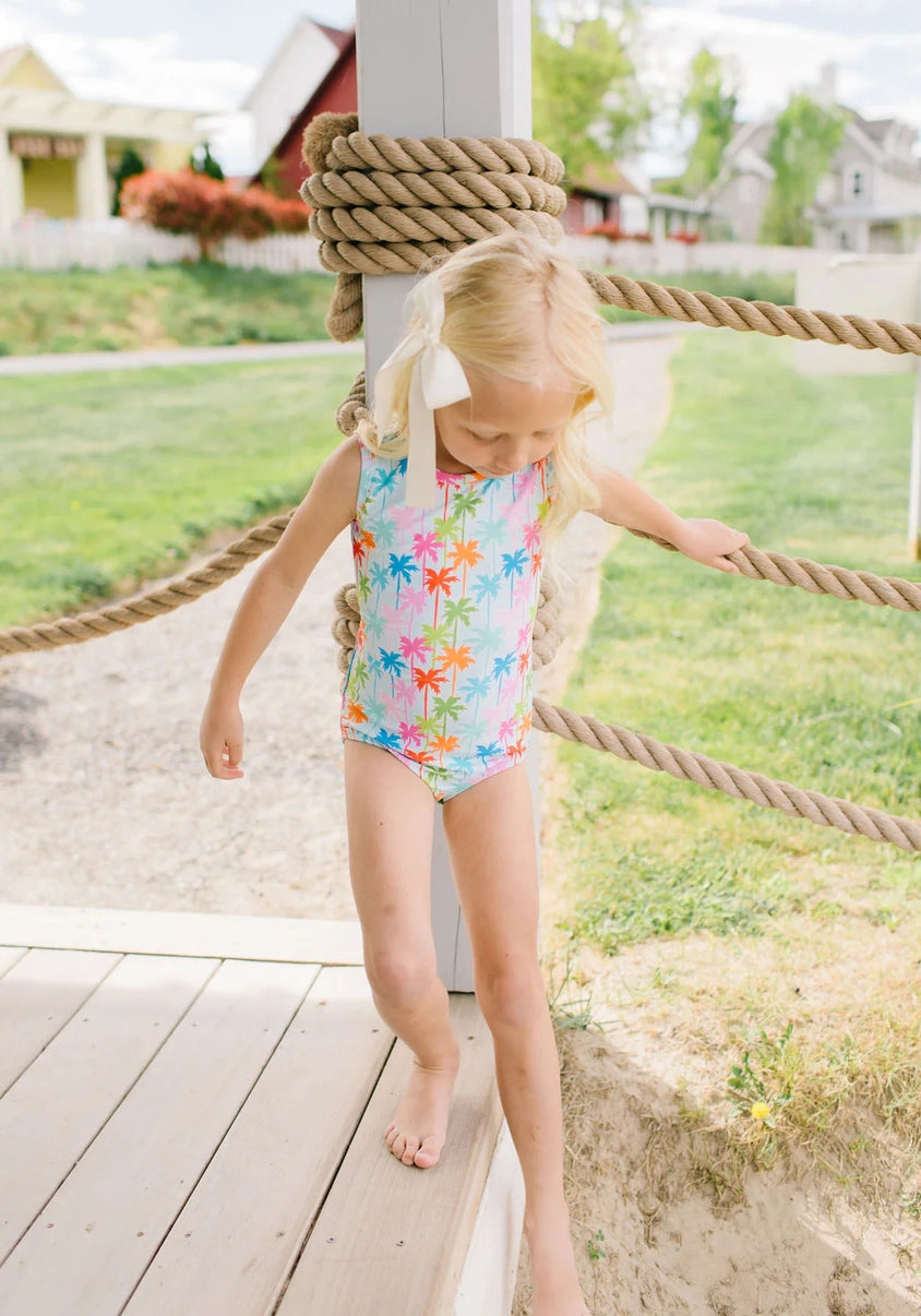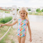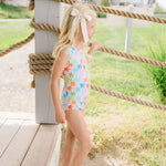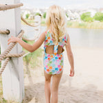 The Lucy One-Piece Swim features a stylish open back tied together with a charming bow, crafted from UPF 50 protected fabric to keep your little one safe in the sun. With a fun, vibrant summer print and a comfortable, stretchy fit, this swimsuit is perfect for beach days and poolside adventures.