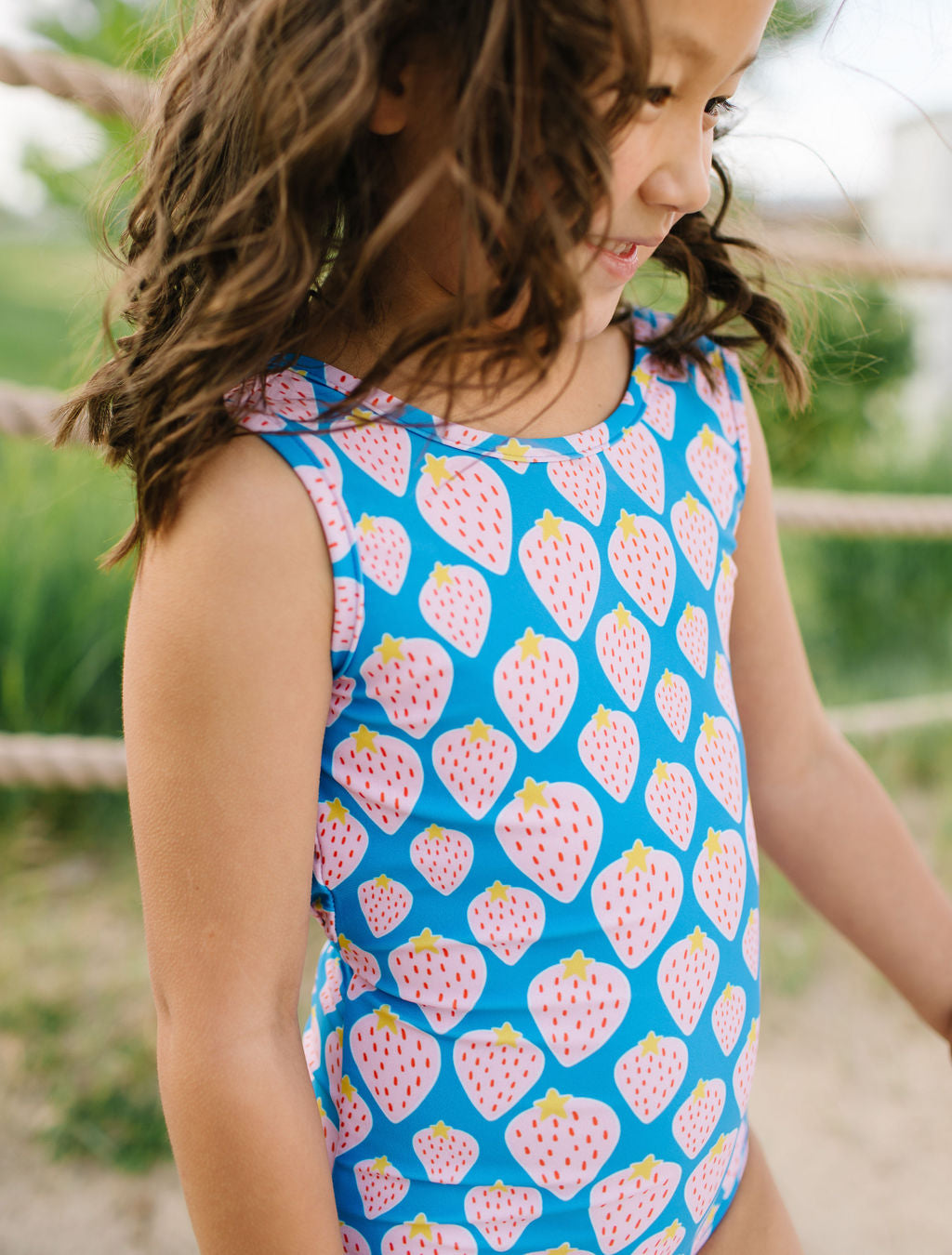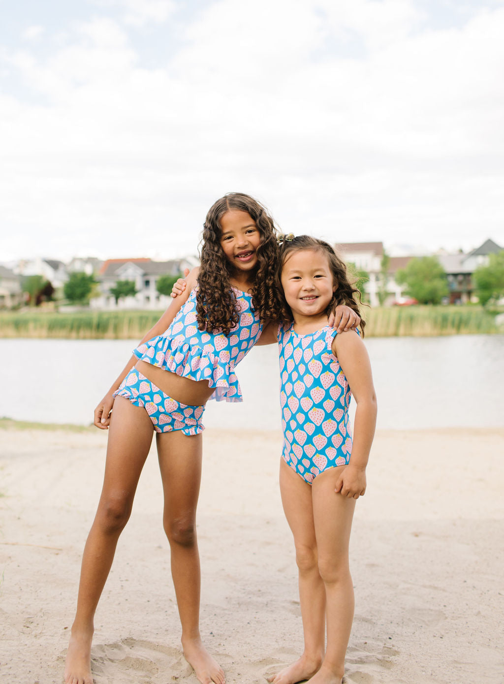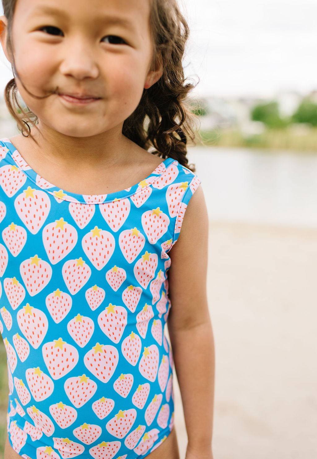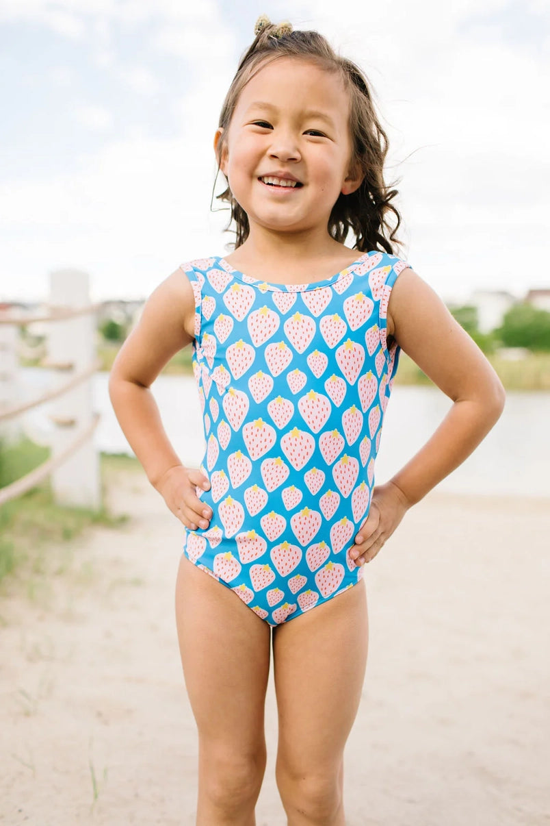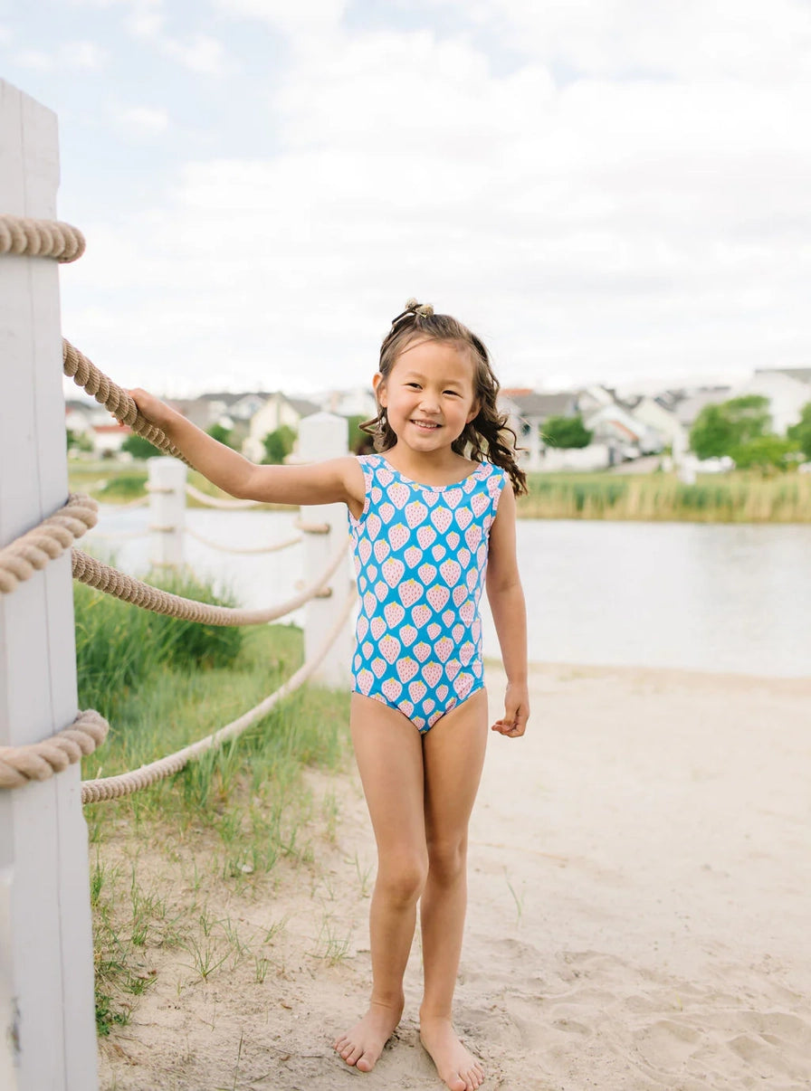 The Lucy One-Piece Swim features a stylish open back tied together with a charming bow, crafted from UPF 50 protected fabric to keep your little one safe in the sun. With a fun, vibrant summer print and a comfortable, stretchy fit, this swimsuit is perfect for beach days and poolside adventures.