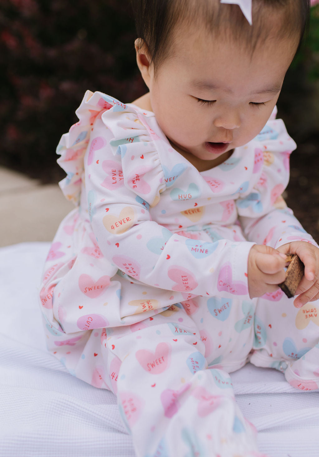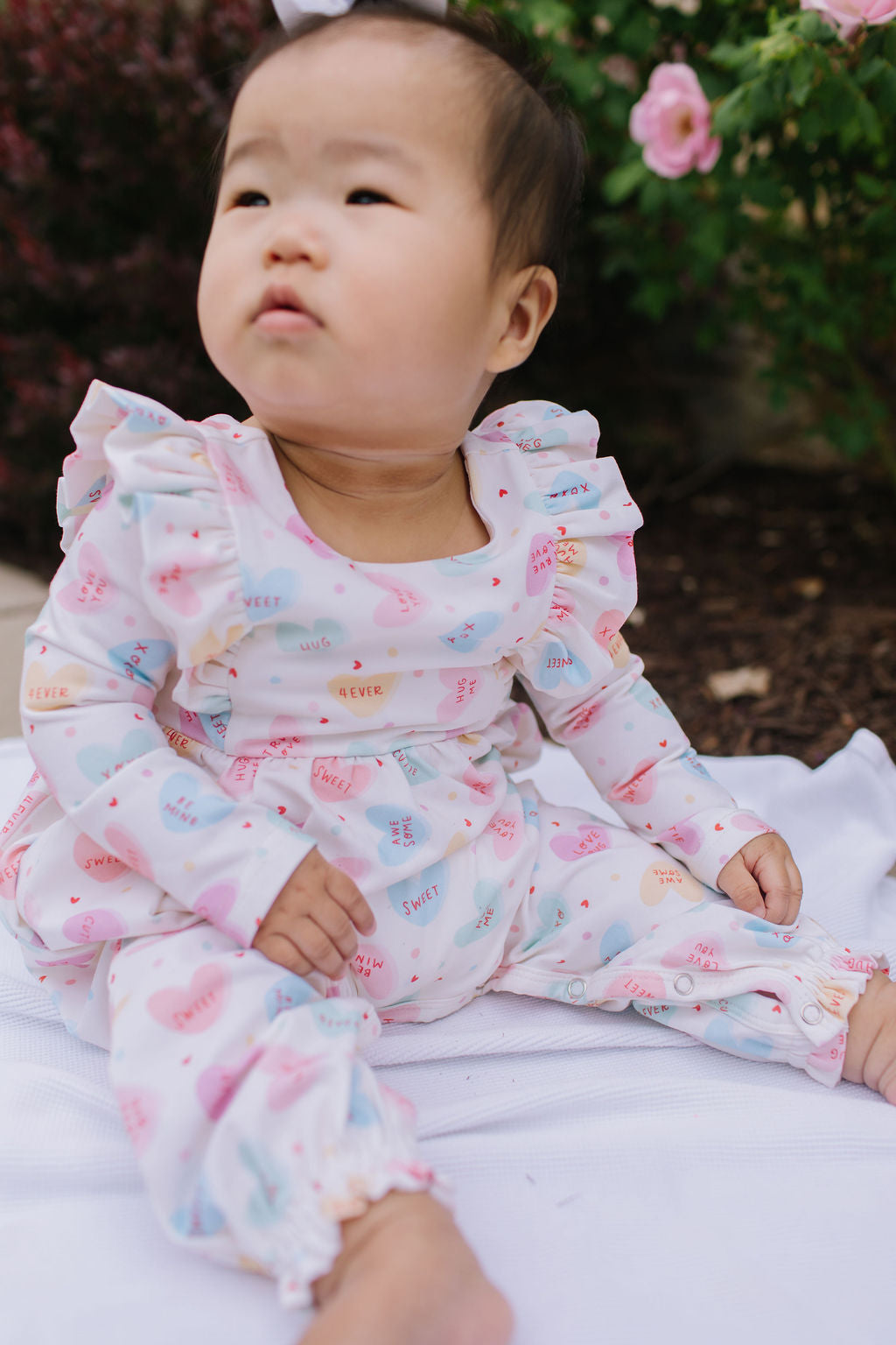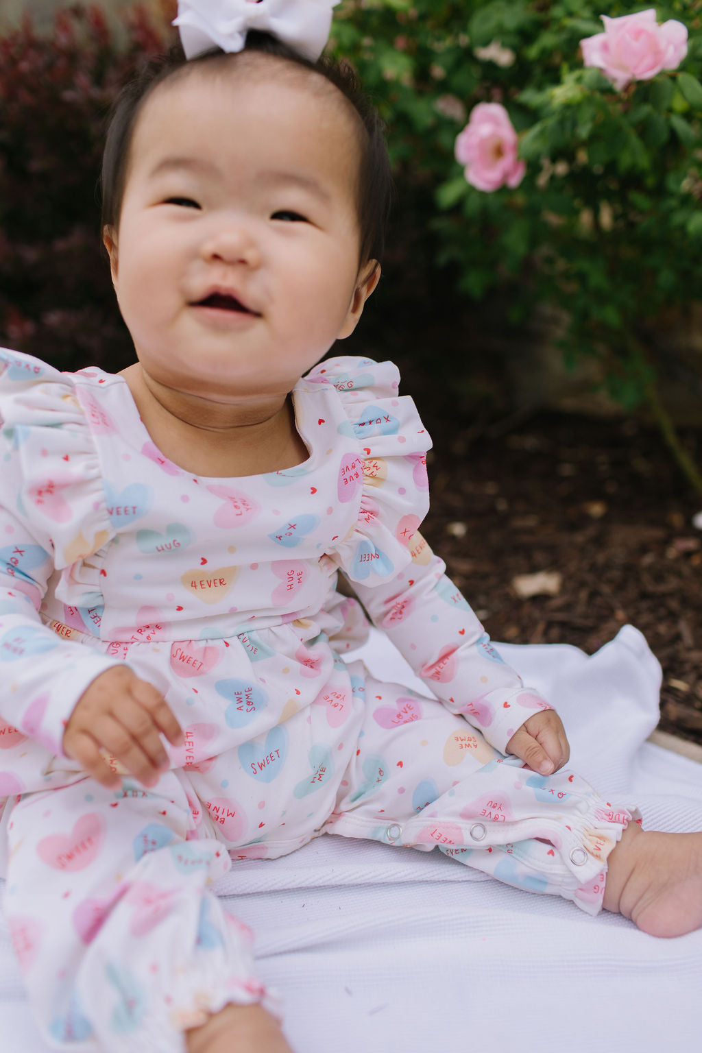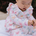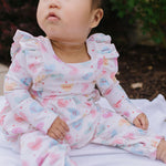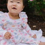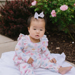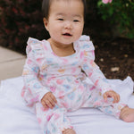 Our Mabel Bubble baby romper is crafted from our signature extra soft and stretchy fabric, designed to keep your little one comfy and cute all day long. Featuring an adorable ruffle that runs over the shoulders and highlights the charming scoop back detail, this romper pairs a snug bodysuit with cozy pants. Practical snap closures around the inseam make diaper changes quick and easy, while elastic ankle bands ensure a perfect fit.