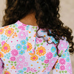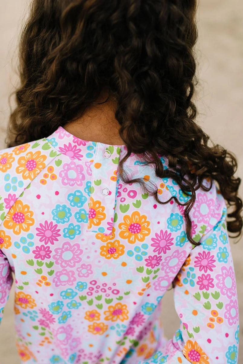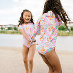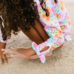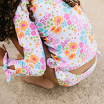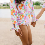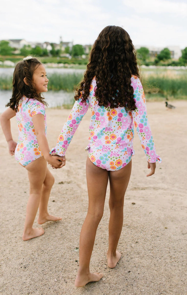 The Mia Swimsuit features a protective long sleeve rash guard designed with delicate keyhole openings at the wrists, each accented with a sweet bow detail. The back of the swim top includes three snaps for easy on and off. The look is perfectly complemented by detached bottoms adorned with matching bows, combining function and style for sun-safe swim days.