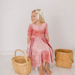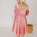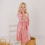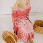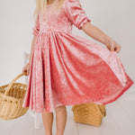 The Pippa Dress combines cozy comfort with charming style. Made from soft velvet fabric, it features 3/4 sleeves with elastic ruffle cuffs, a full circle skirt with handy pockets, and a flattering scoop back—perfect for twirling and everyday wear alike.