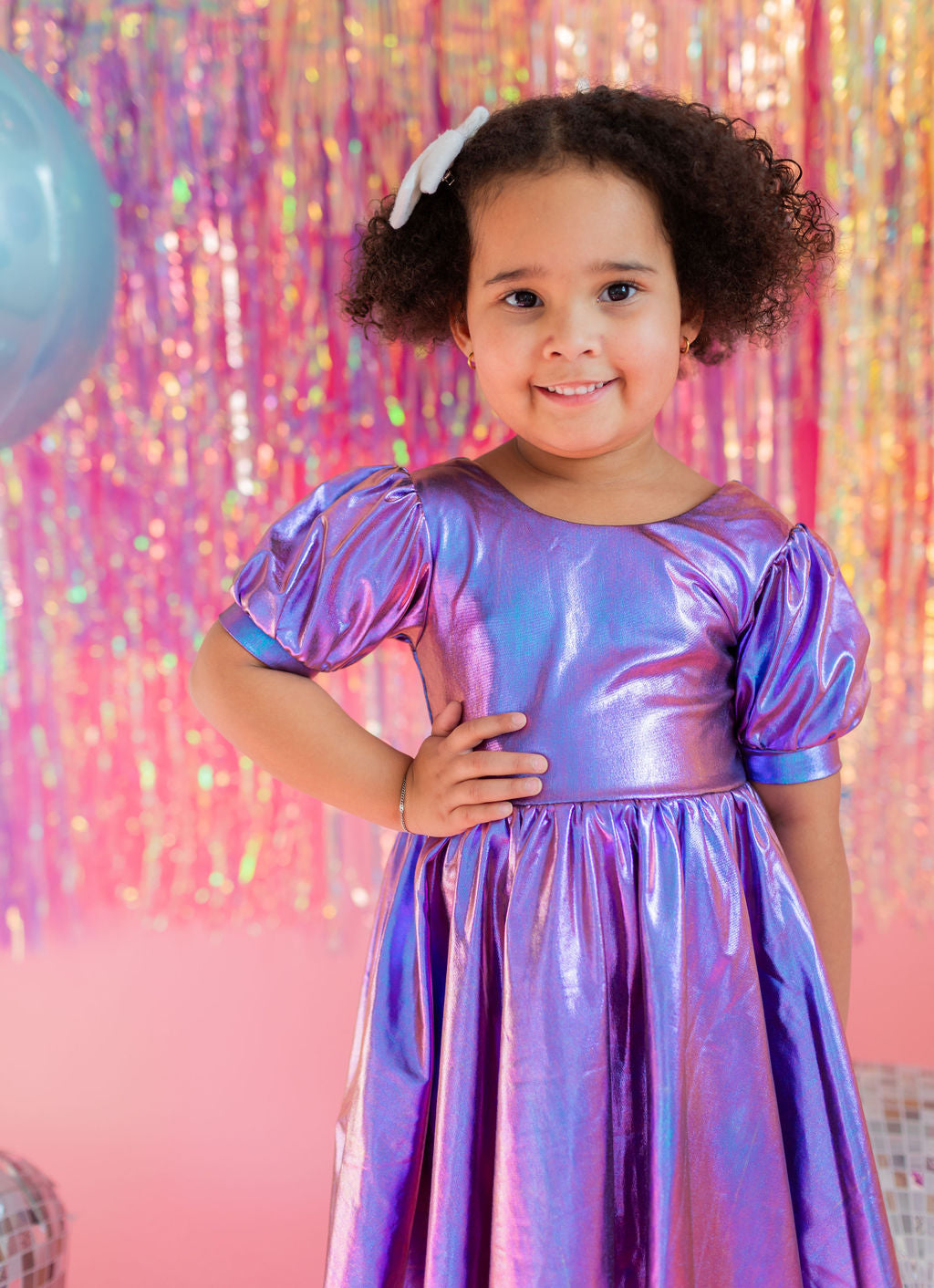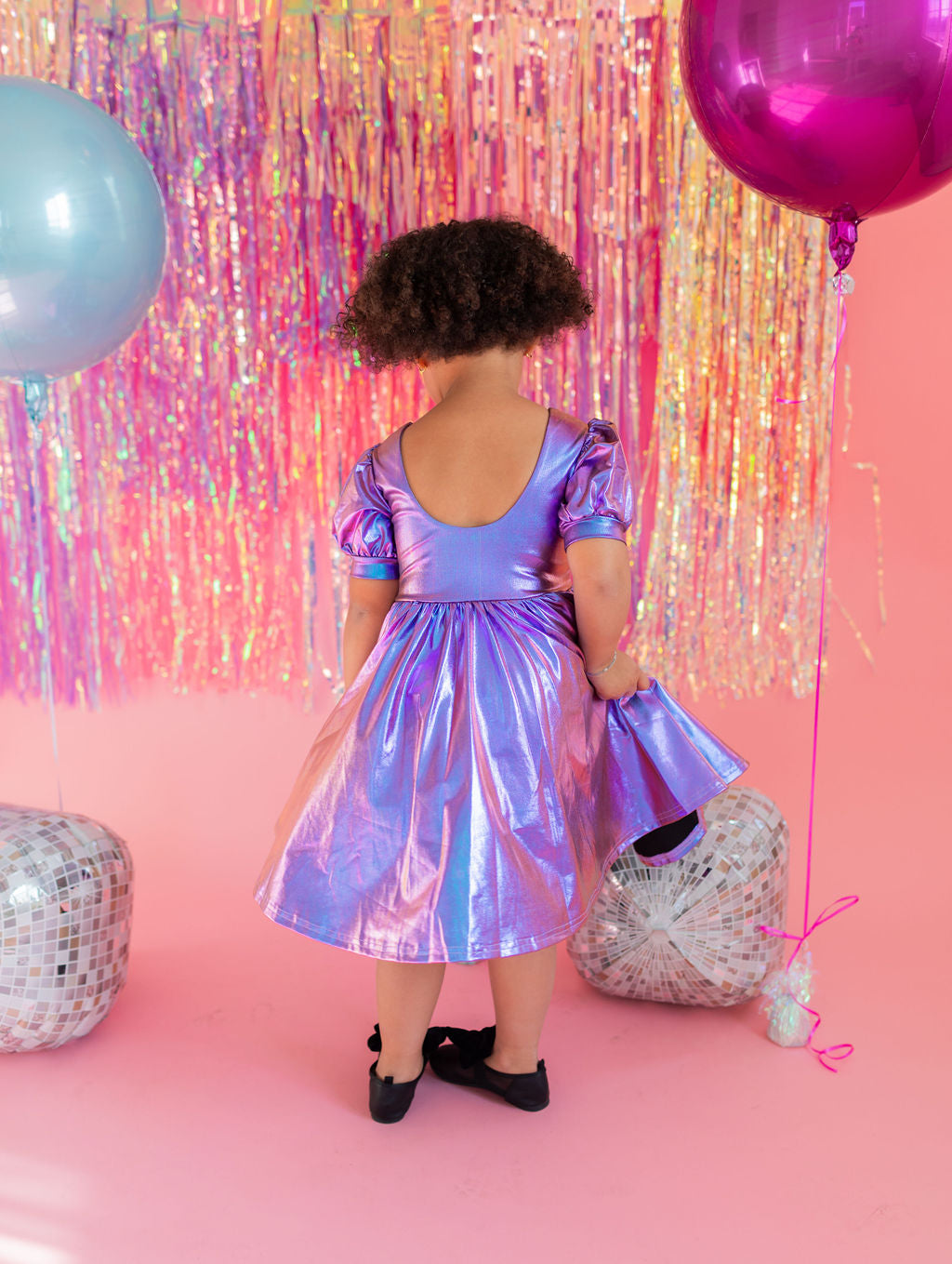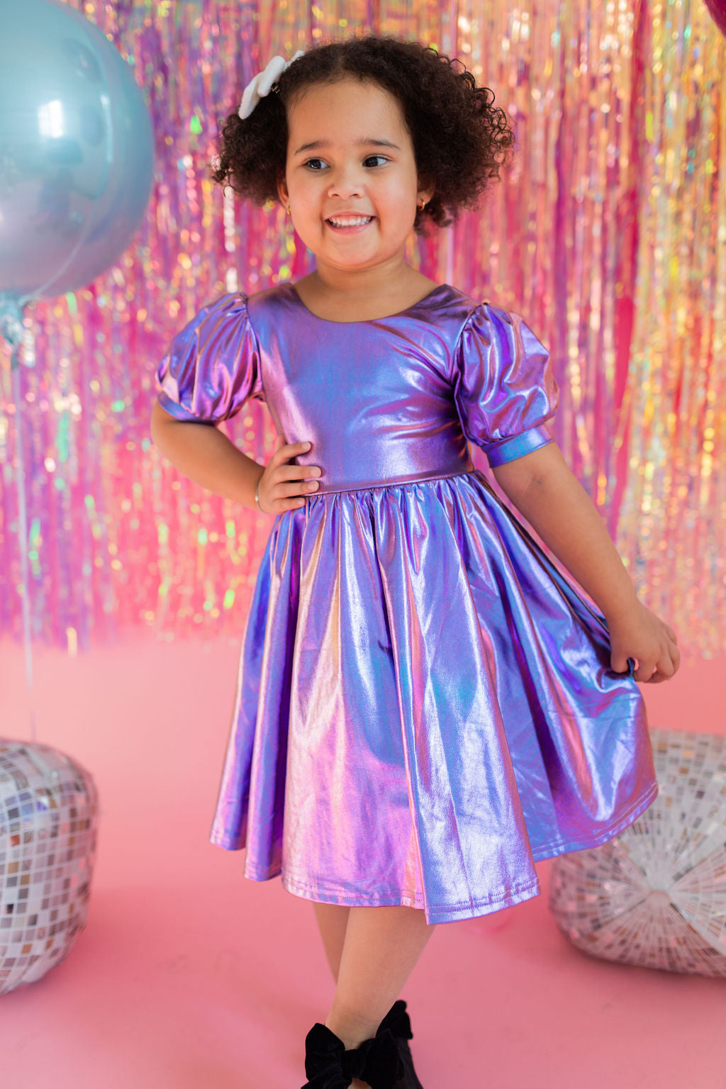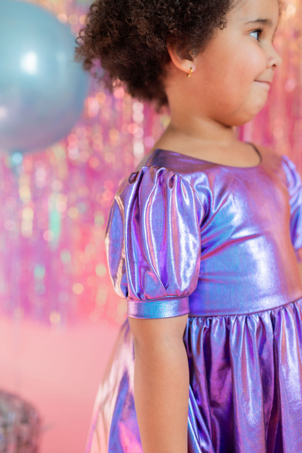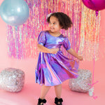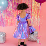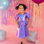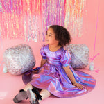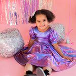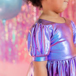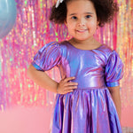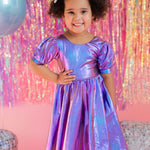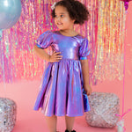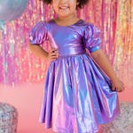 Get the party started with our Puff Dress in Lamè! This show-stopping dress features a fun short puffy sleeve, a flattering scoop back, and a full skirt designed for maximum twirl power. Crafted from a shimmering purple lamè fabric with hints of blue, it shines bright at every occasion. The crew neck and comfortable elastic waist ensure a perfect fit for all-day wear.