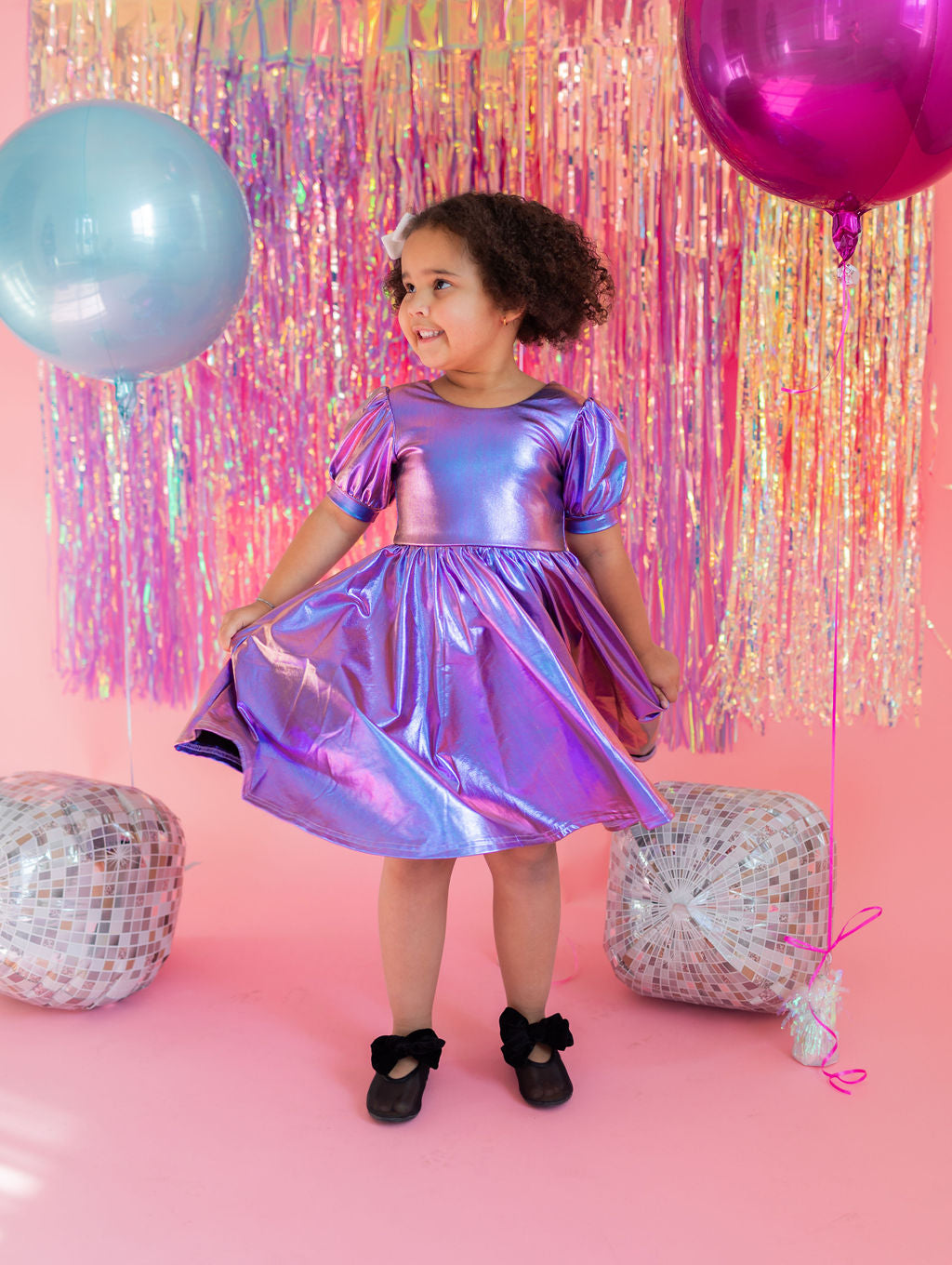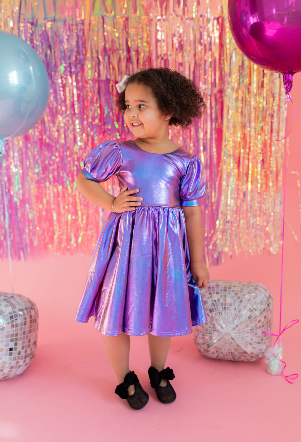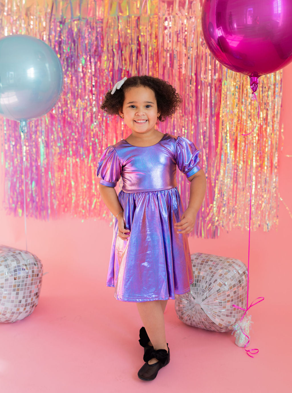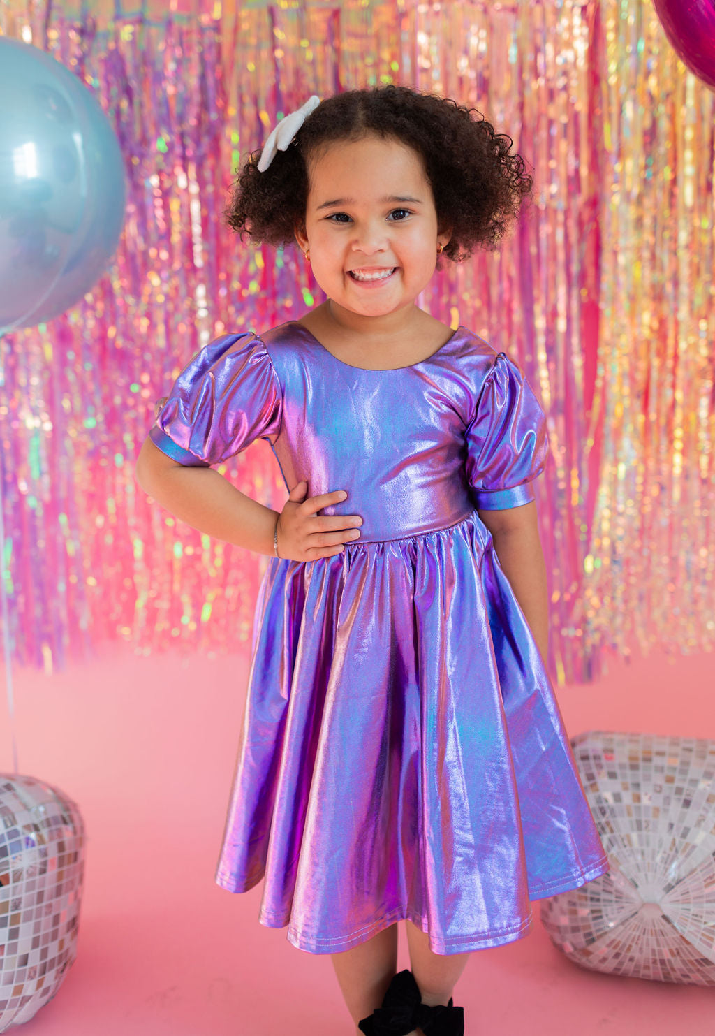 Get the party started with our Puff Dress in Lamè! This show-stopping dress features a fun short puffy sleeve, a flattering scoop back, and a full skirt designed for maximum twirl power. Crafted from a shimmering purple lamè fabric with hints of blue, it shines bright at every occasion. The crew neck and comfortable elastic waist ensure a perfect fit for all-day wear.