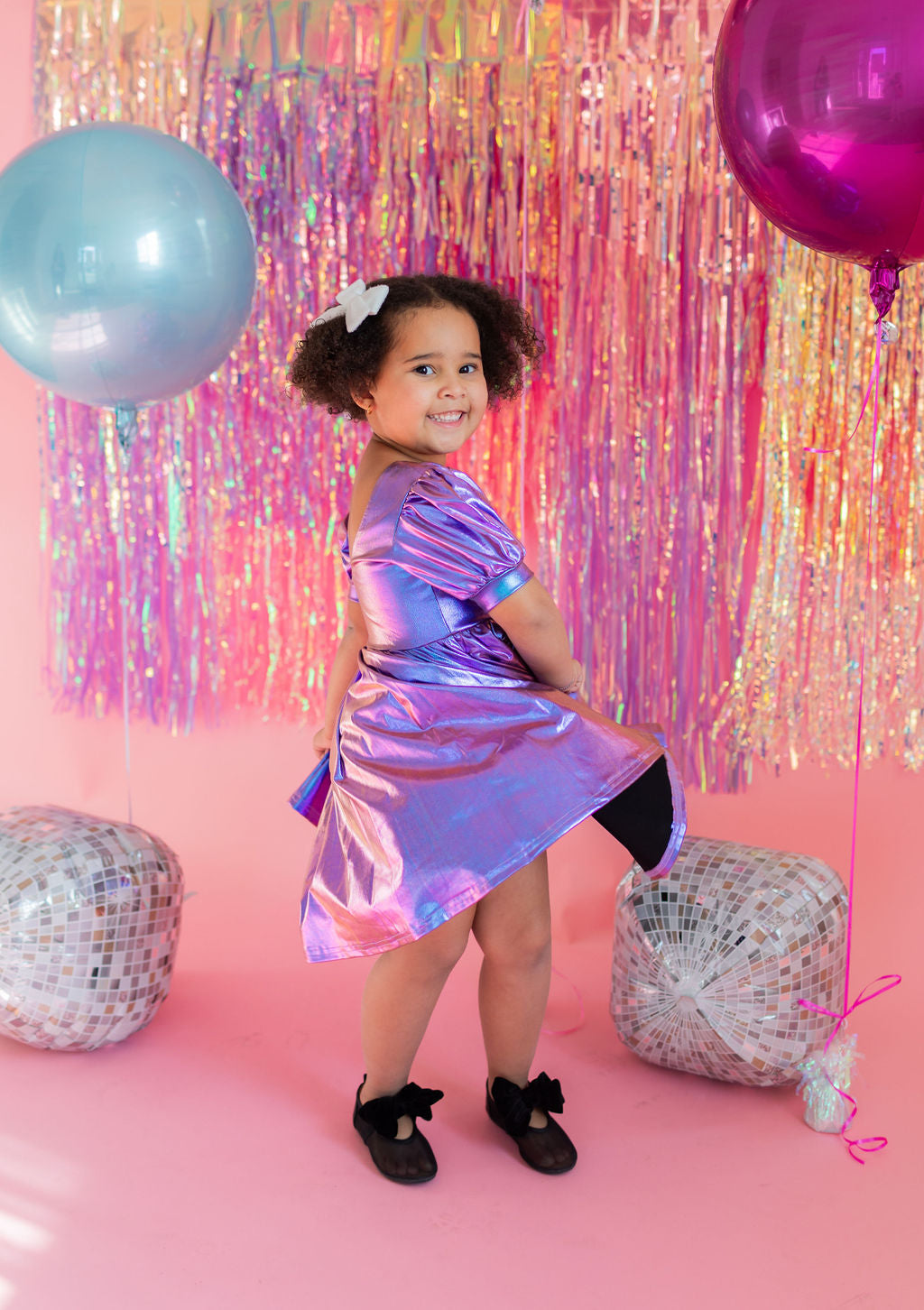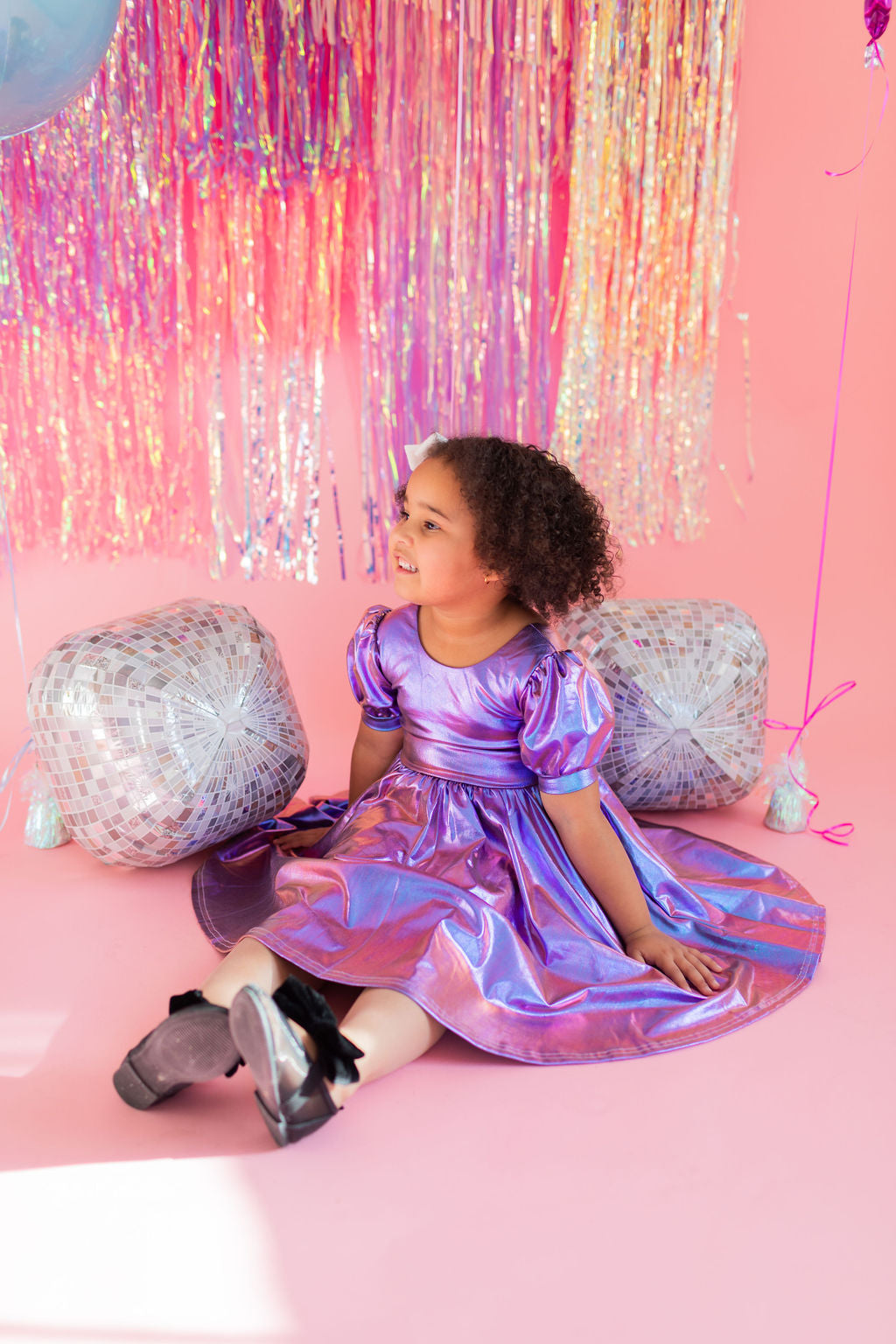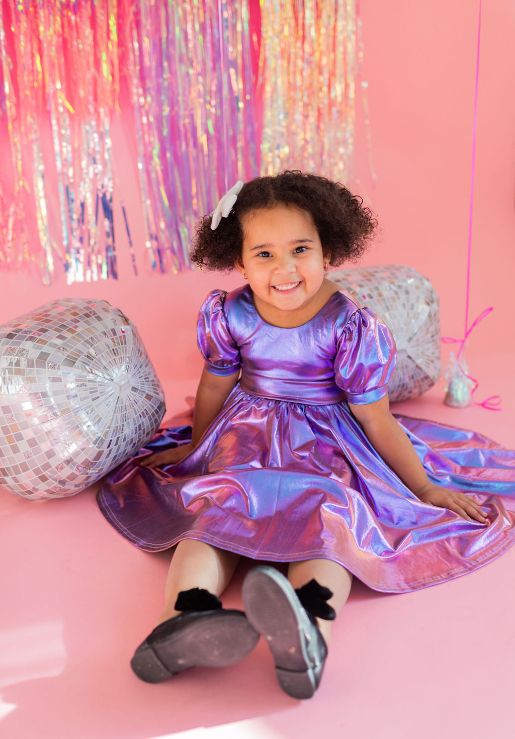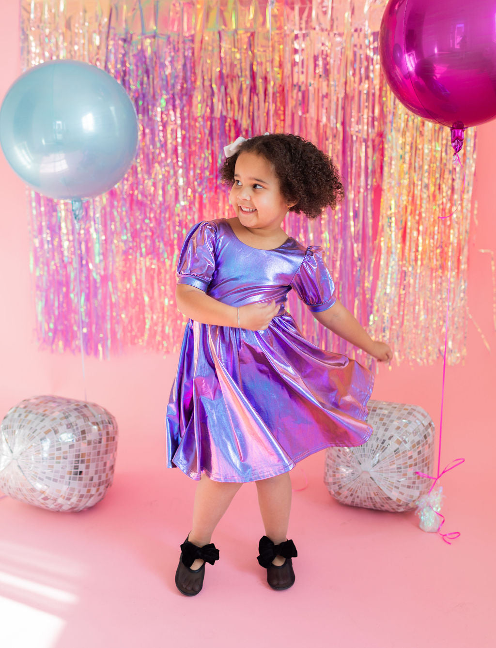 Get the party started with our Puff Dress in Lamè! This show-stopping dress features a fun short puffy sleeve, a flattering scoop back, and a full skirt designed for maximum twirl power. Crafted from a shimmering purple lamè fabric with hints of blue, it shines bright at every occasion. The crew neck and comfortable elastic waist ensure a perfect fit for all-day wear.