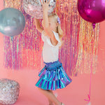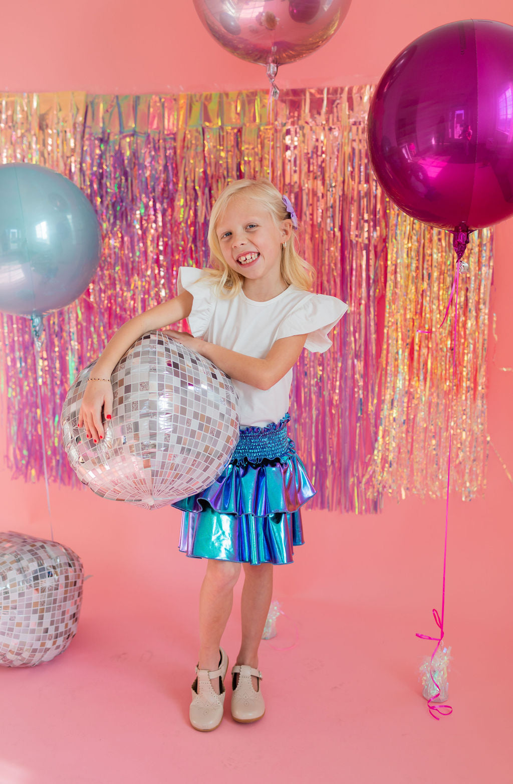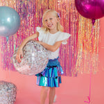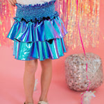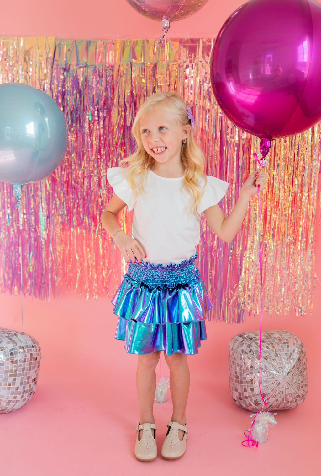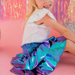 Add a little shimmer to their day with our Lamè Skirt! This fun and playful piece features a ruffled, shiny Lamè overlay with soft polyester shorts underneath for coverage and comfort. A comfortable smocked elastic waistband makes it easy to pull on and wear all day long. Perfect for parties, playdates, or adding sparkle to everyday looks.