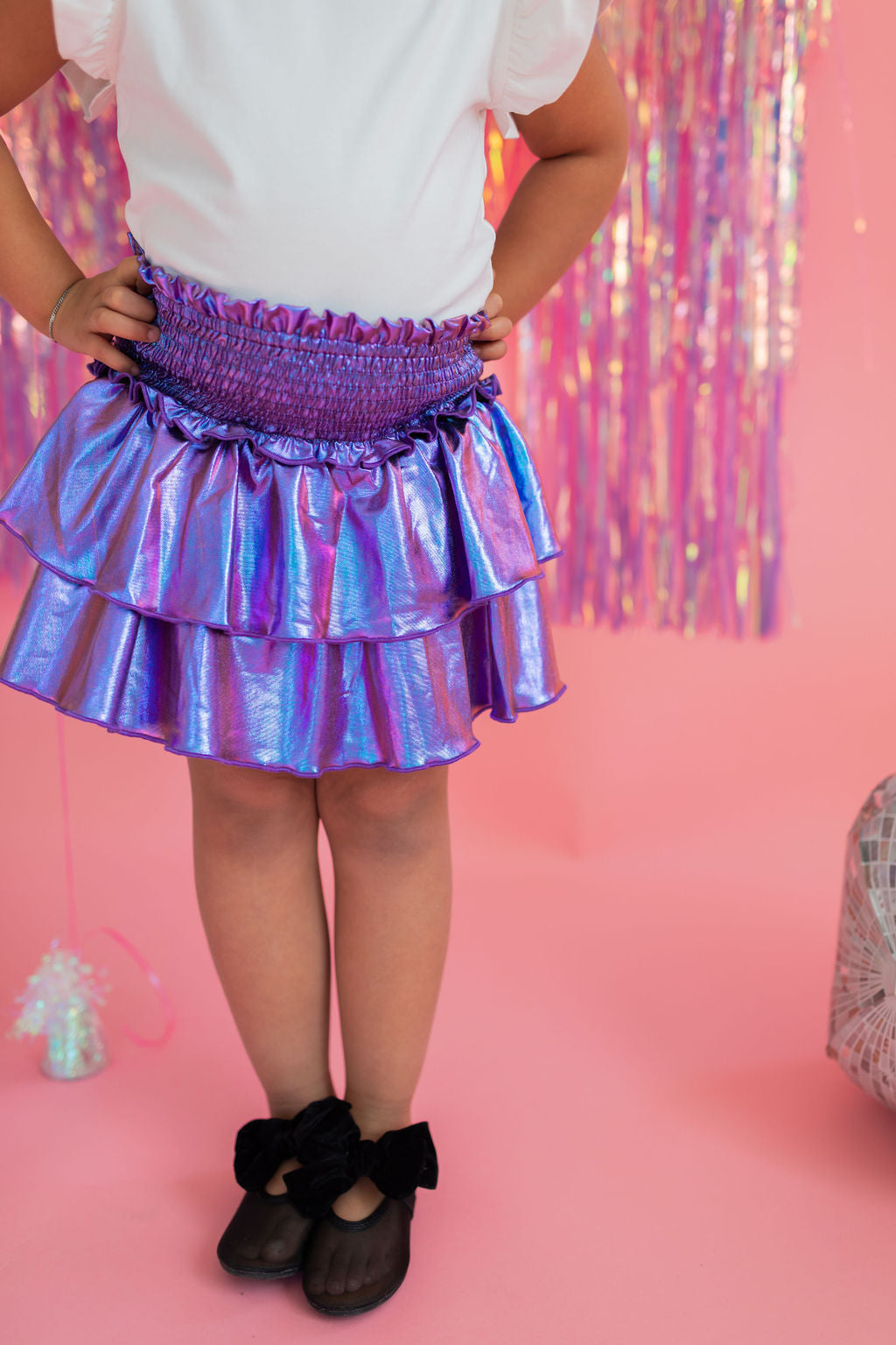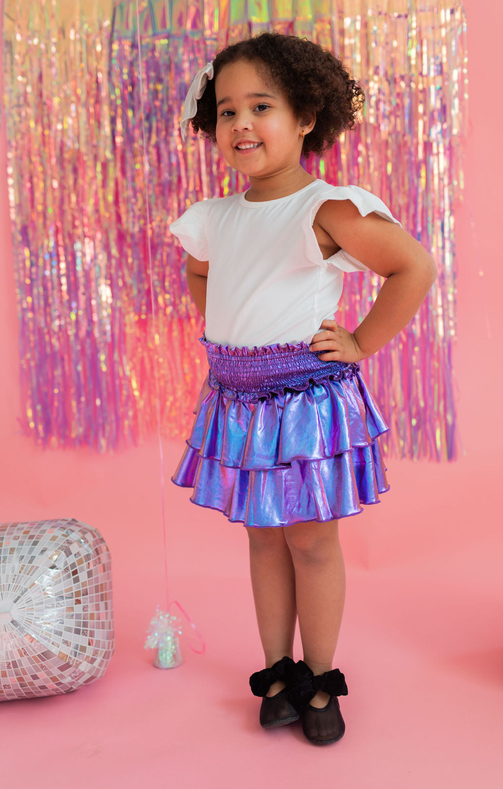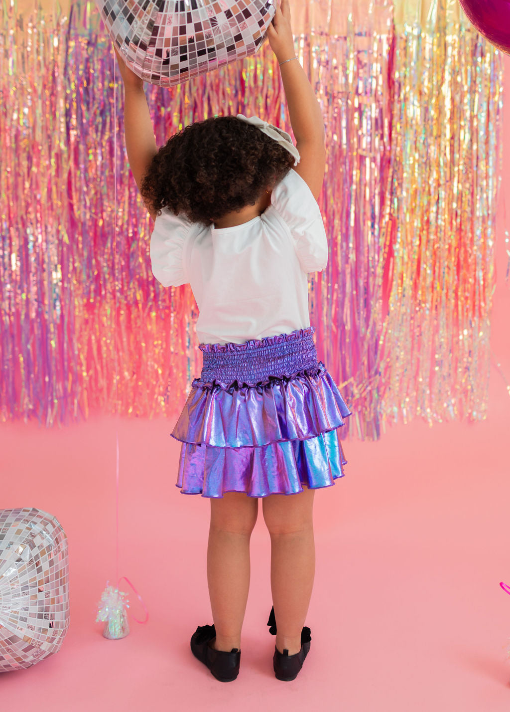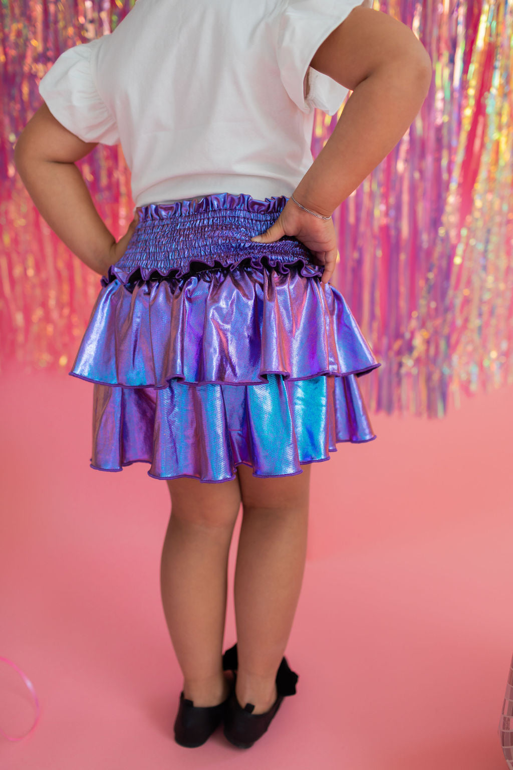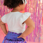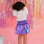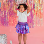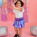Add a little shimmer to their day with our Lamè Skirt! This fun and playful piece features a ruffled, shiny Lamè overlay with soft polyester shorts underneath for coverage and comfort. A comfortable smocked elastic waistband makes it easy to pull on and wear all day long. Perfect for parties, playdates, or adding sparkle to everyday looks.