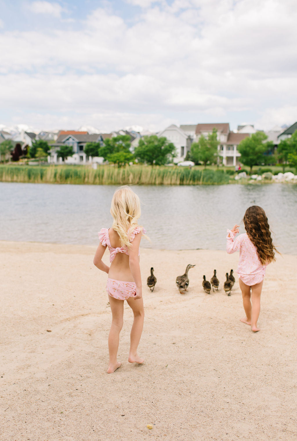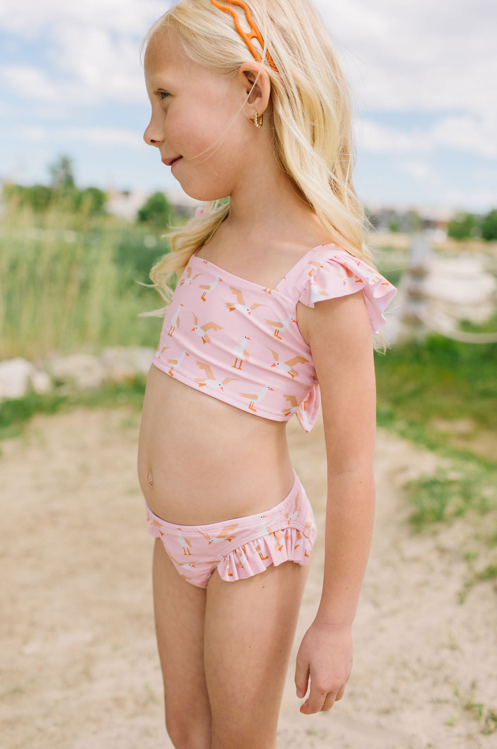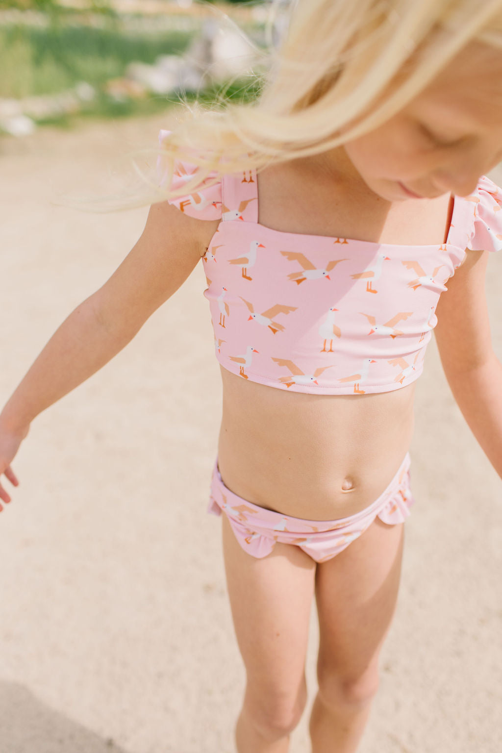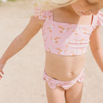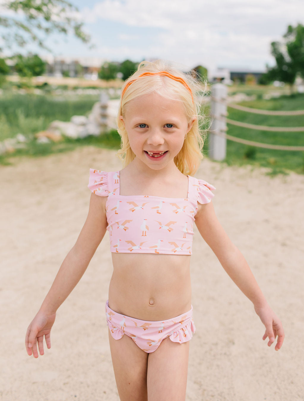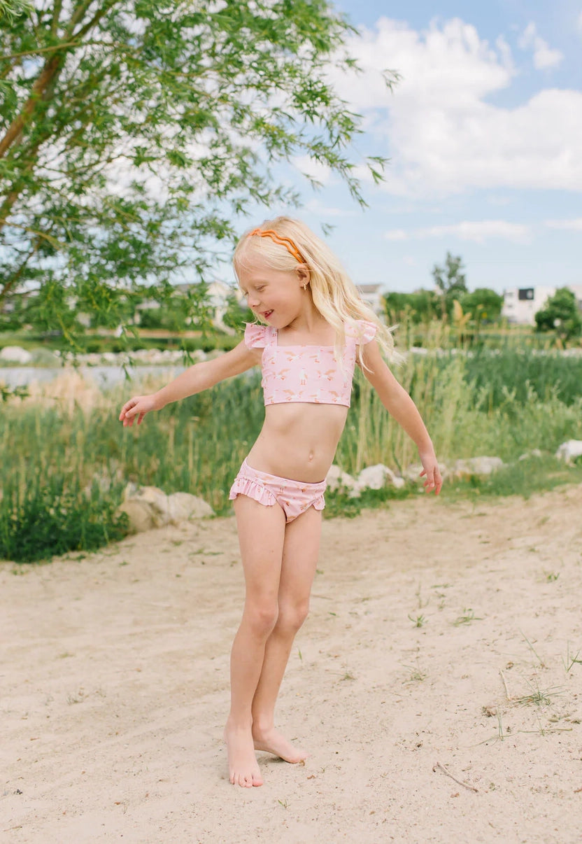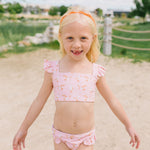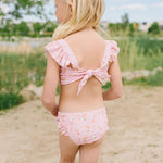 This charming resort-style two-piece swimsuit is perfect for sunny days and splashy fun. Featuring ruffled shoulder straps, a secure tie-back top, and separate bottoms with delicate ruffle detailing at the leg openings, it blends playful elegance with comfort. Made from UPF 50 protected fabric, it helps shield little ones from the sun in style.